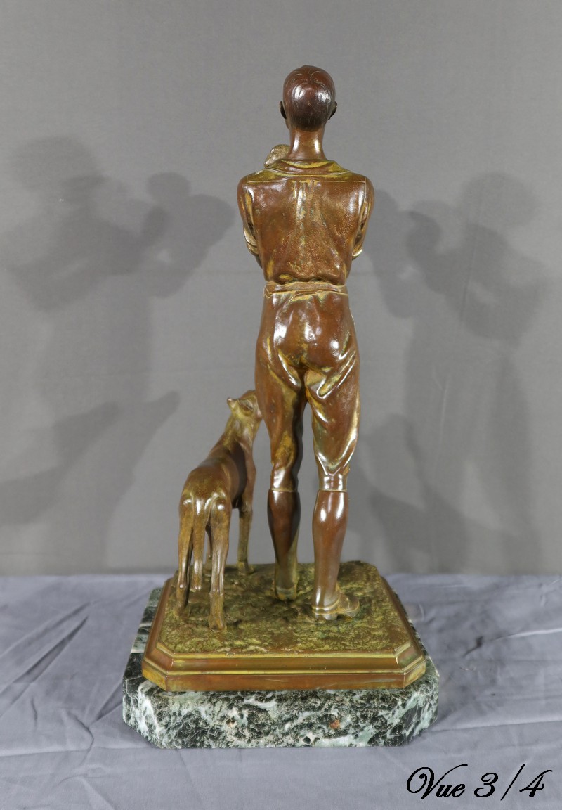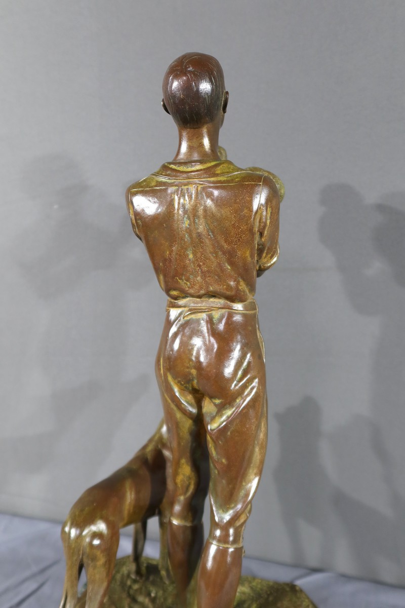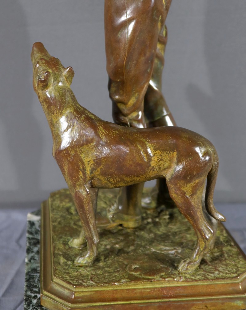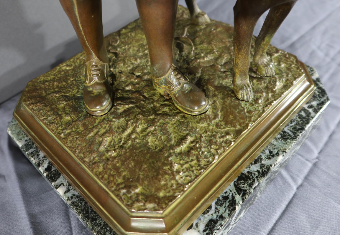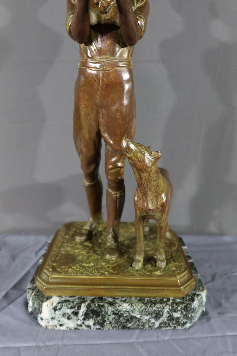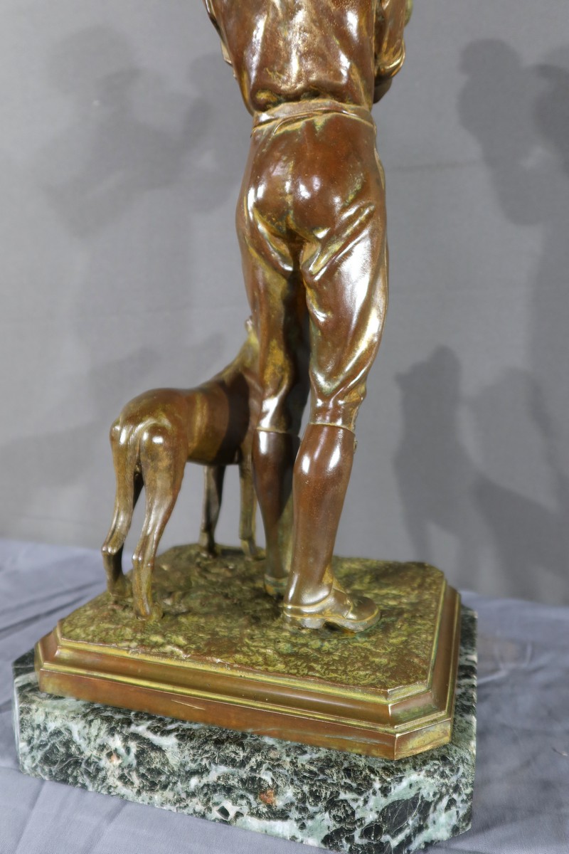 Cette sculpture en bronze représente un homme debout, tenant un agnelet dans ses bras, accompagné de son chien à ses côtés.