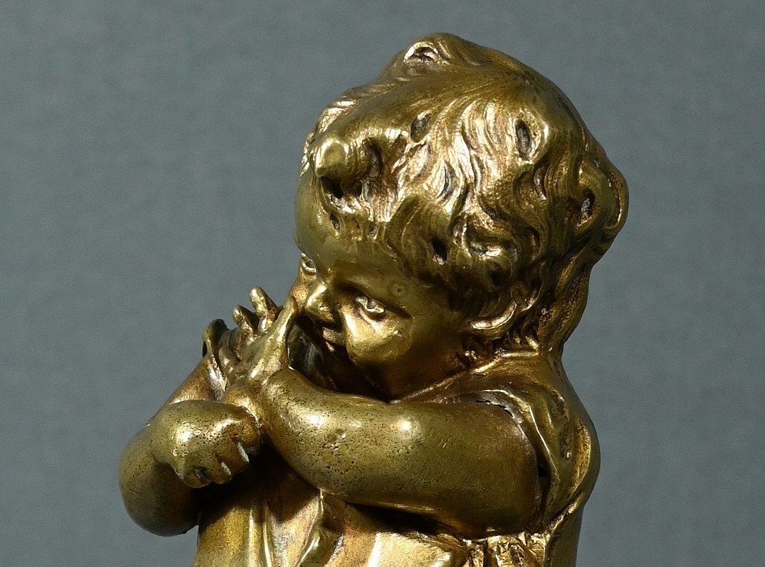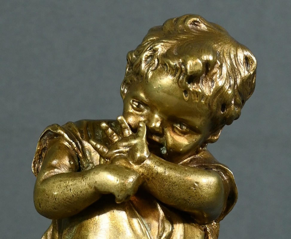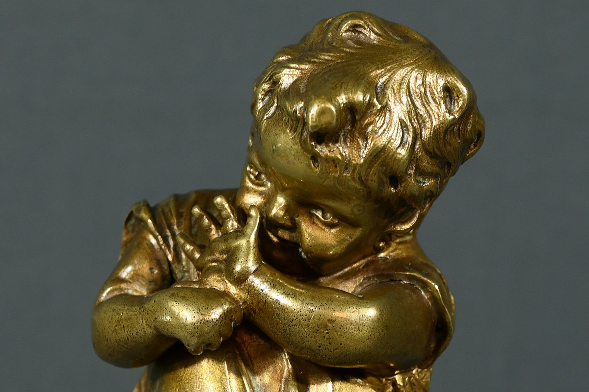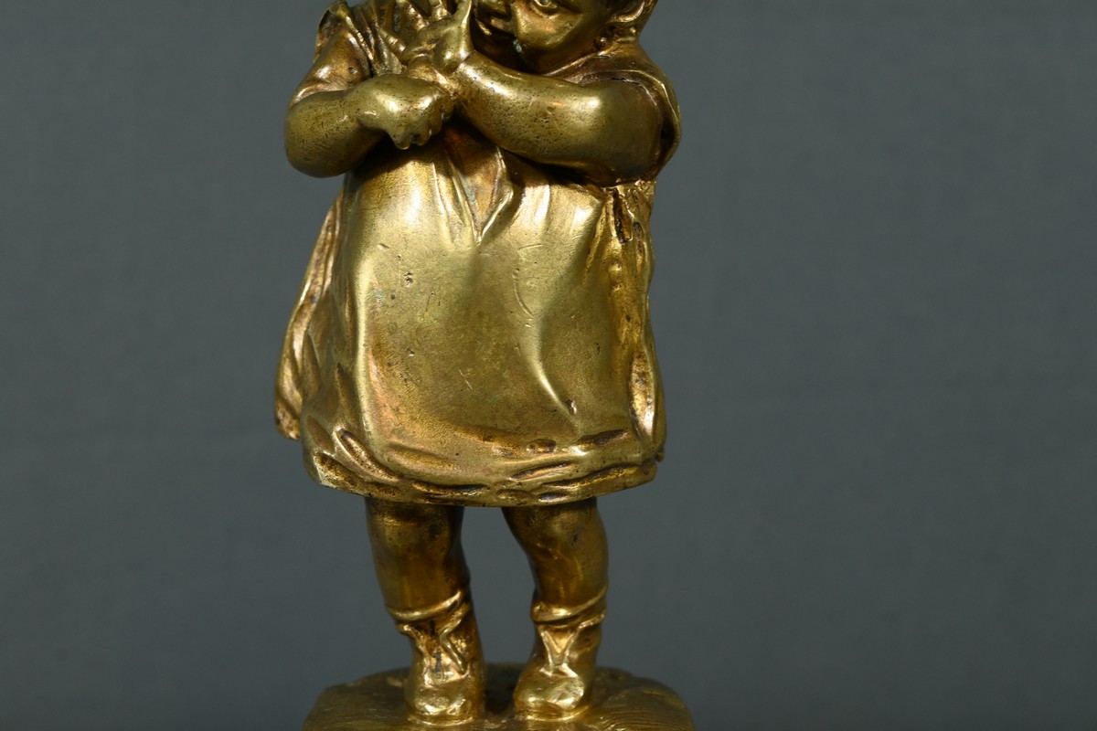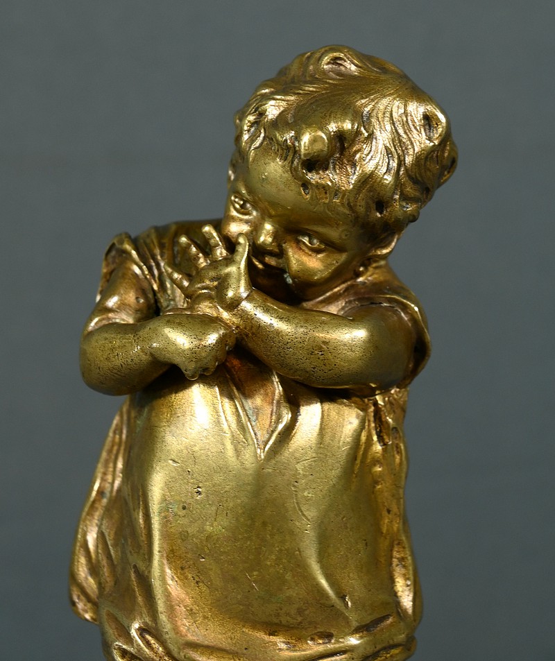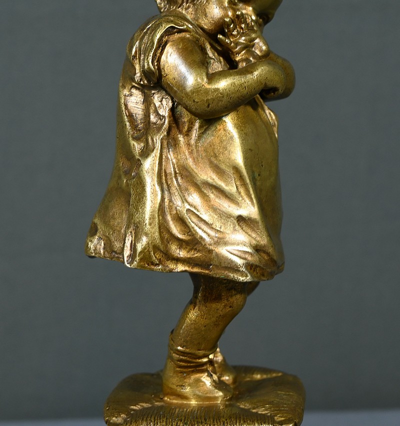 Cette sculpture en bronze à patine dorée, inspirée par l’œuvre du sculpteur espagnol Juan Clara (1875-1958), est une magnifique représentation de l’innocence enfantine.