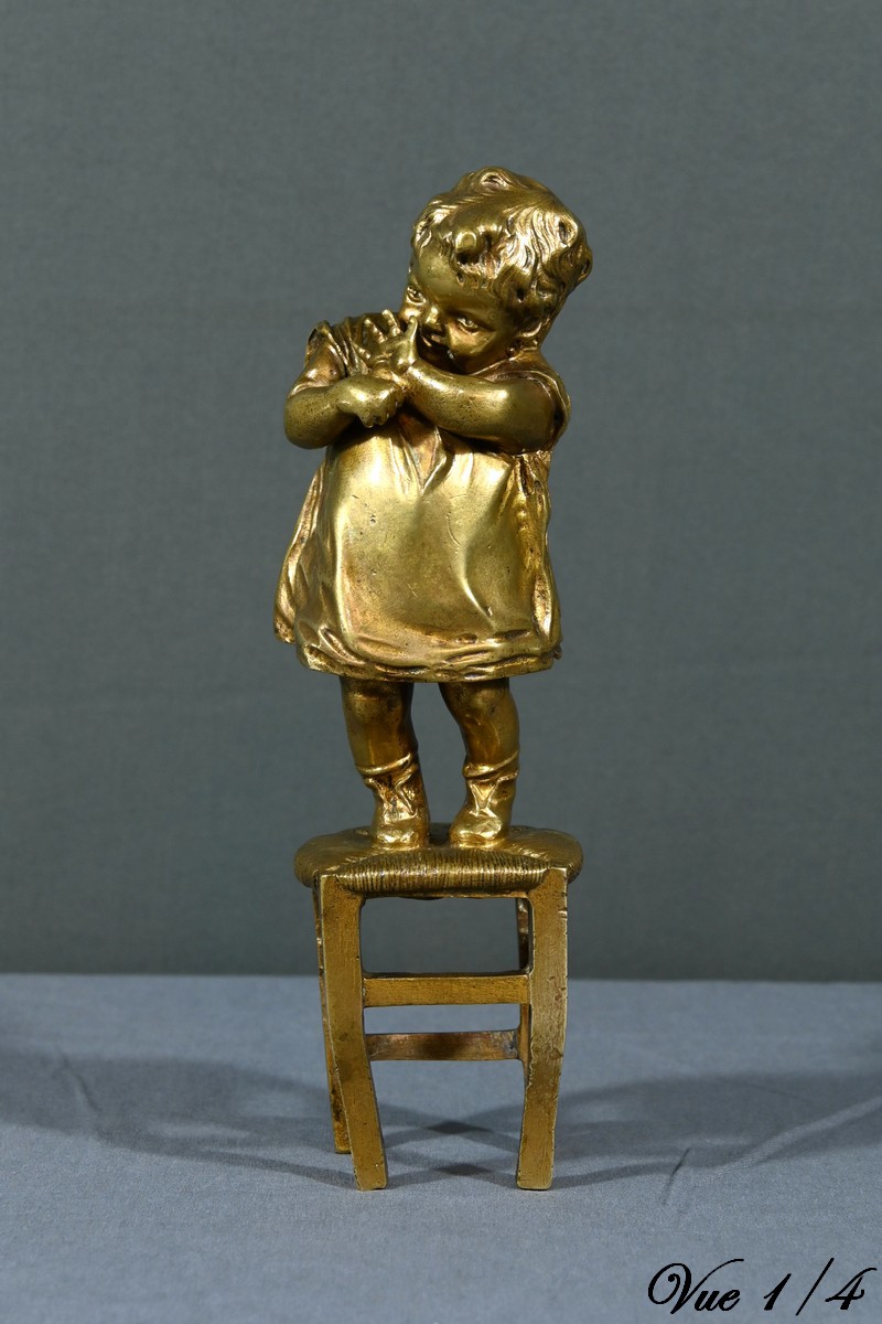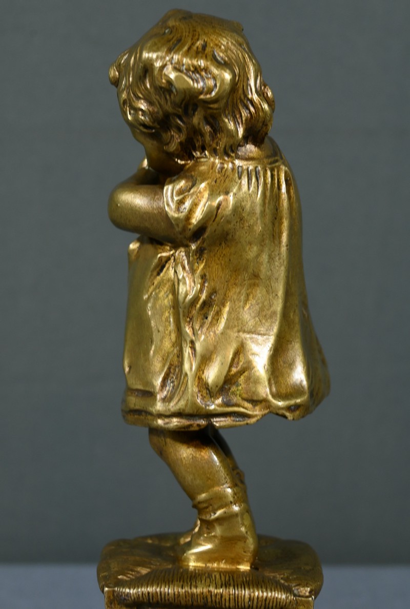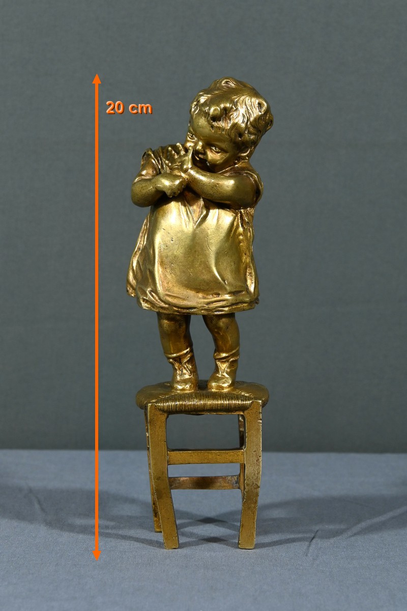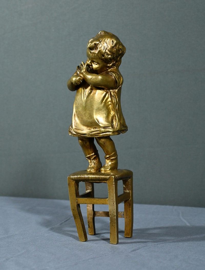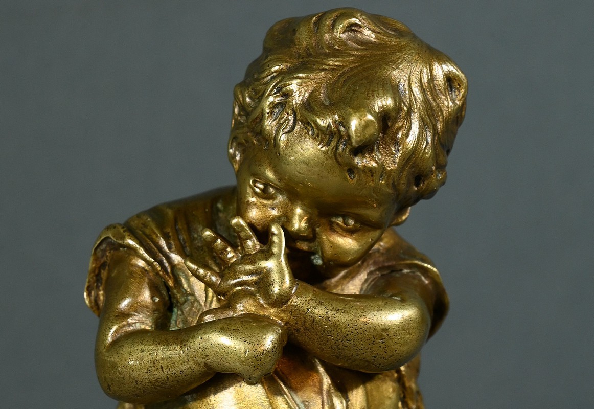 Cette sculpture en bronze à patine dorée, inspirée par l’œuvre du sculpteur espagnol Juan Clara (1875-1958), est une magnifique représentation de l’innocence enfantine.