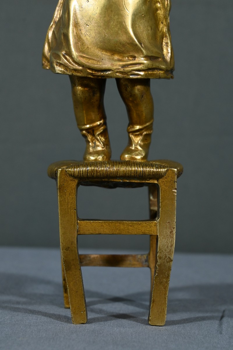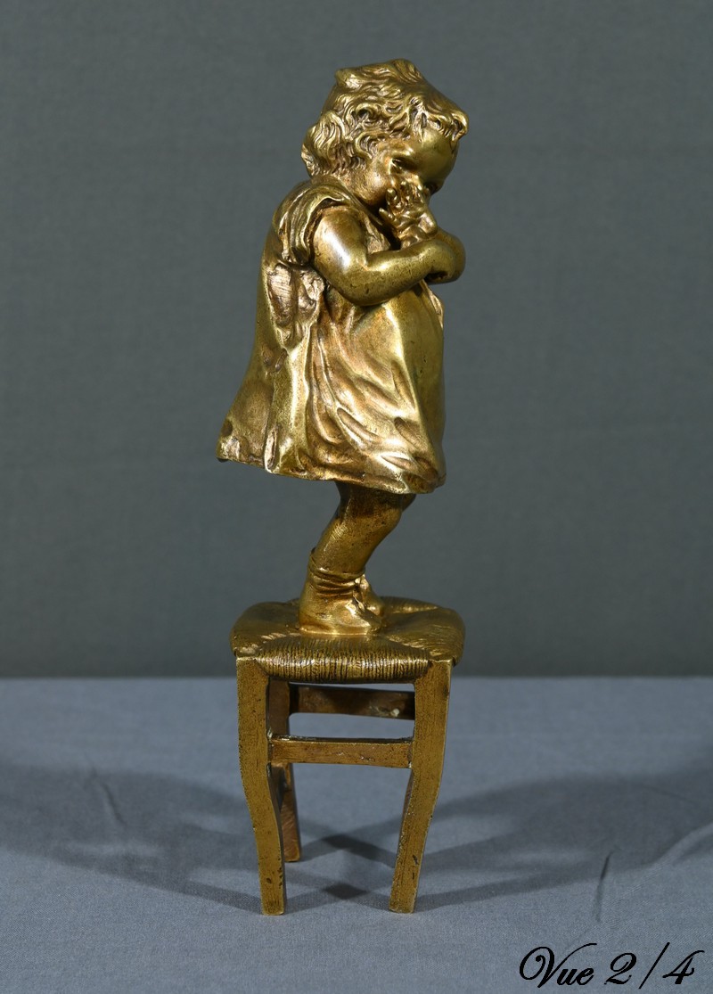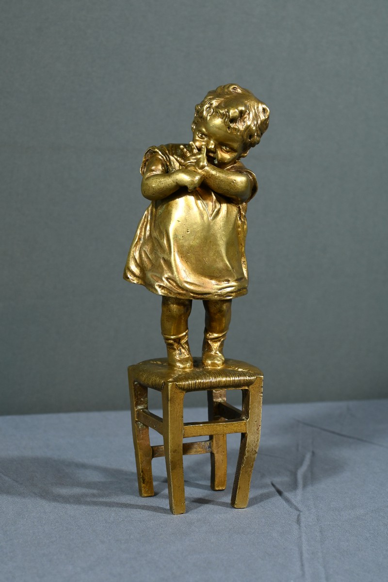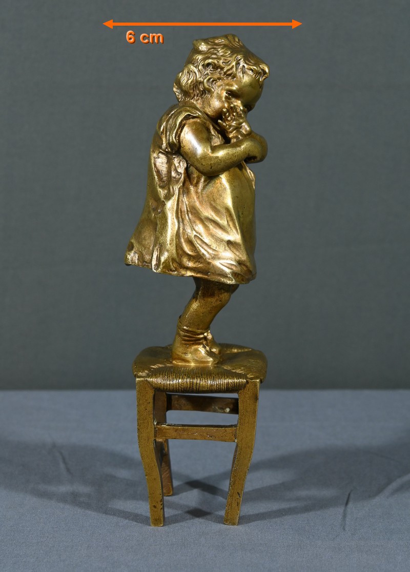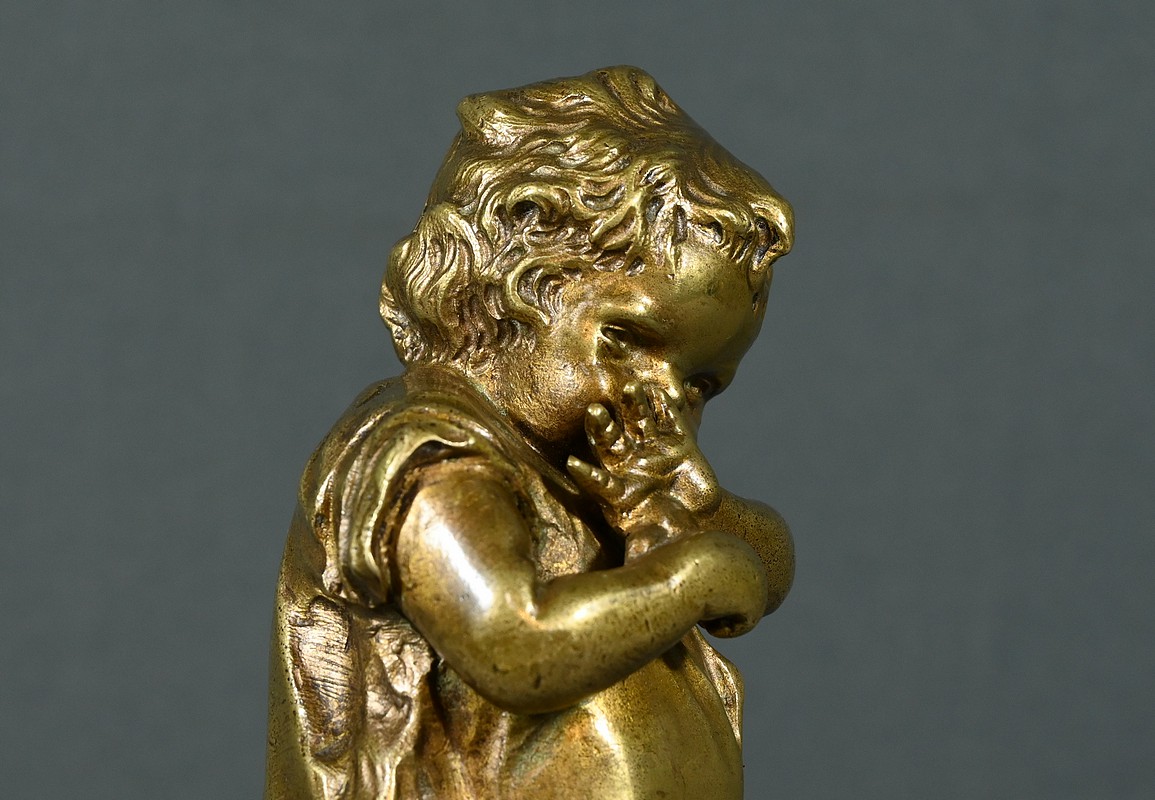 Cette sculpture en bronze à patine dorée, inspirée par l’œuvre du sculpteur espagnol Juan Clara (1875-1958), est une magnifique représentation de l’innocence enfantine.
