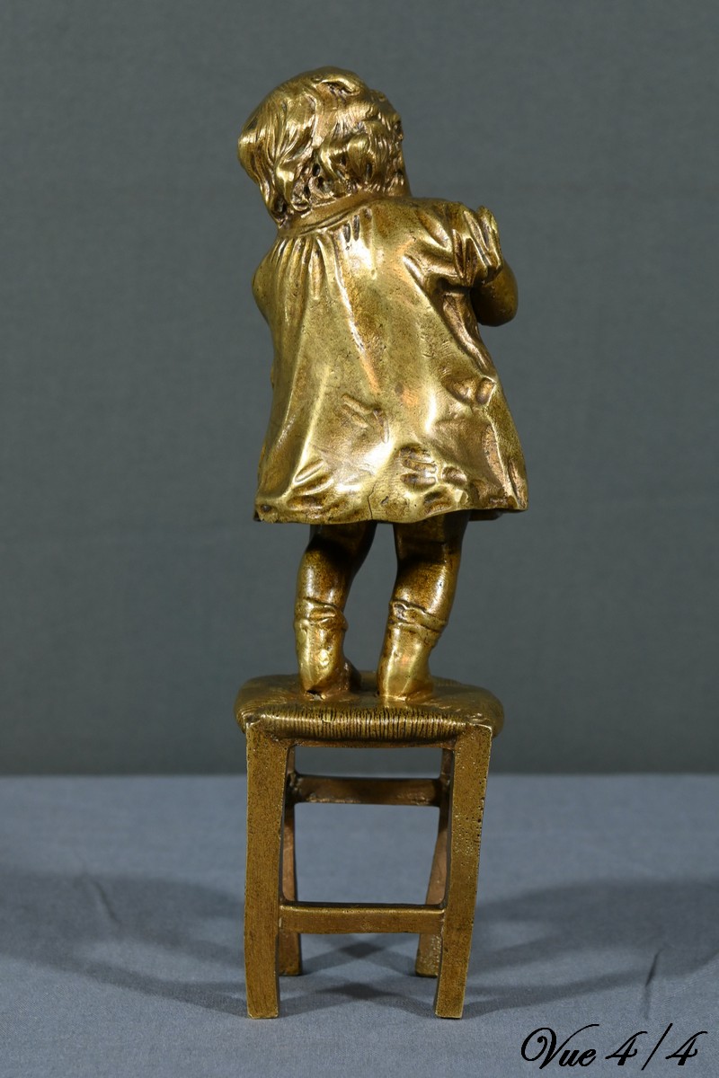 L’œuvre représente une jeune fille debout sur un tabouret, se cachant légèrement derrière ses mains.