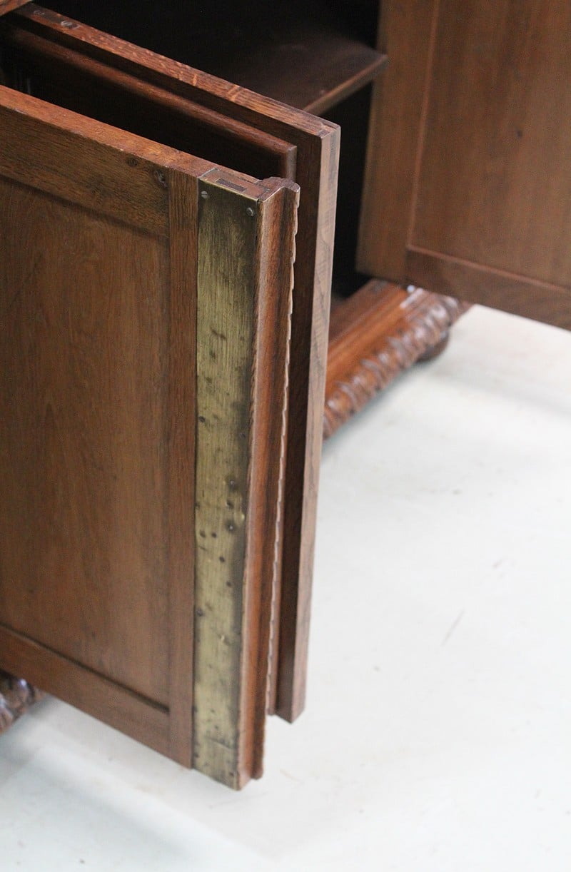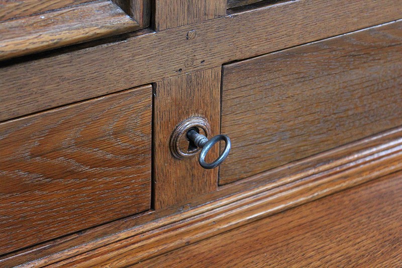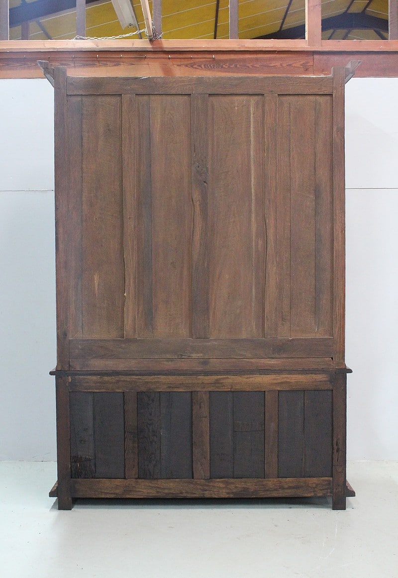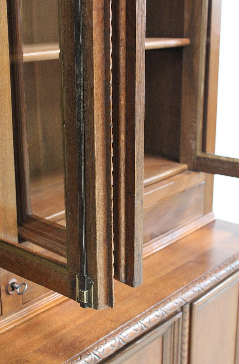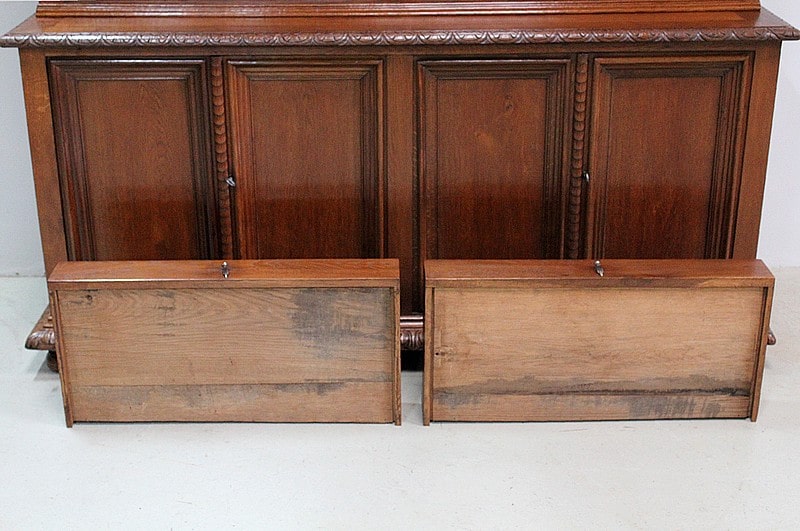 Le tout repose sur la partie basse, ouvrant par 4 portes pleines panneautées et moulurées fermant à clef par serrure haut et bas. L’intérieur est garni d’une étagère de chaque côté, posée sur tasseaux fixes.