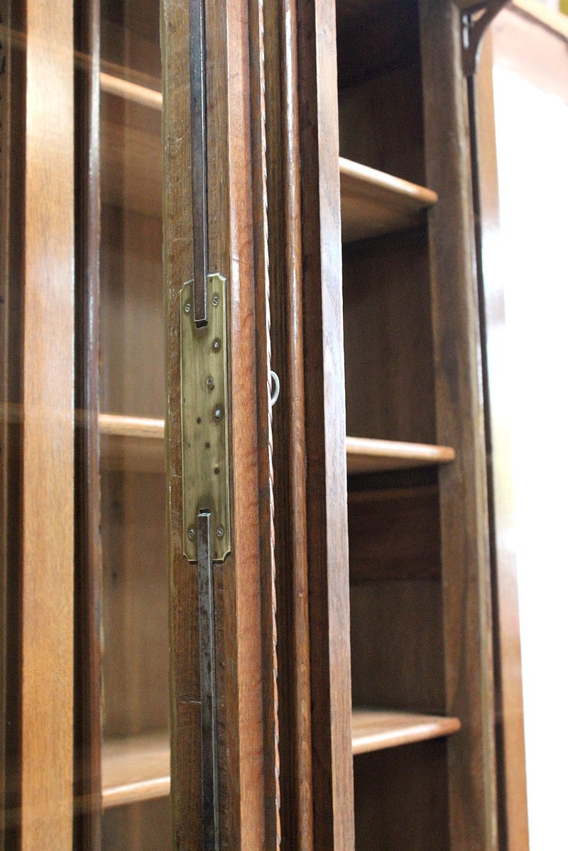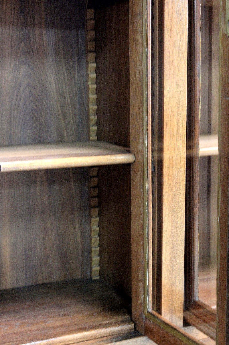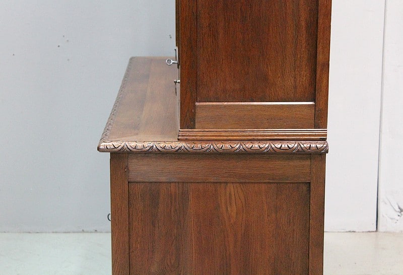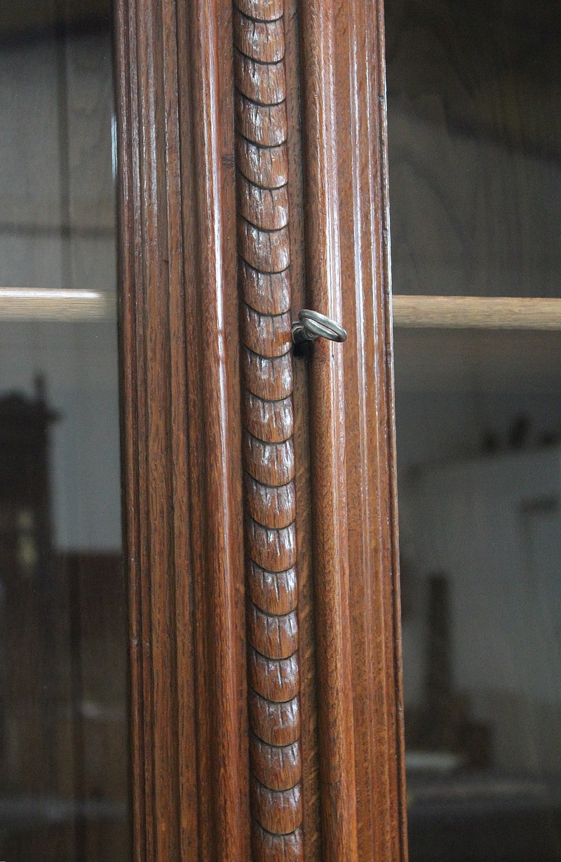 Le tout repose sur la partie basse, ouvrant par 4 portes pleines panneautées et moulurées fermant à clef par serrure haut et bas. L’intérieur est garni d’une étagère de chaque côté, posée sur tasseaux fixes.