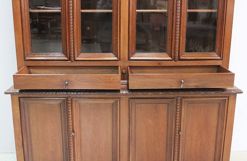 En dessous, la bibliothèque ouvre par 2 tiroirs fermant par une serrure centrale commune.