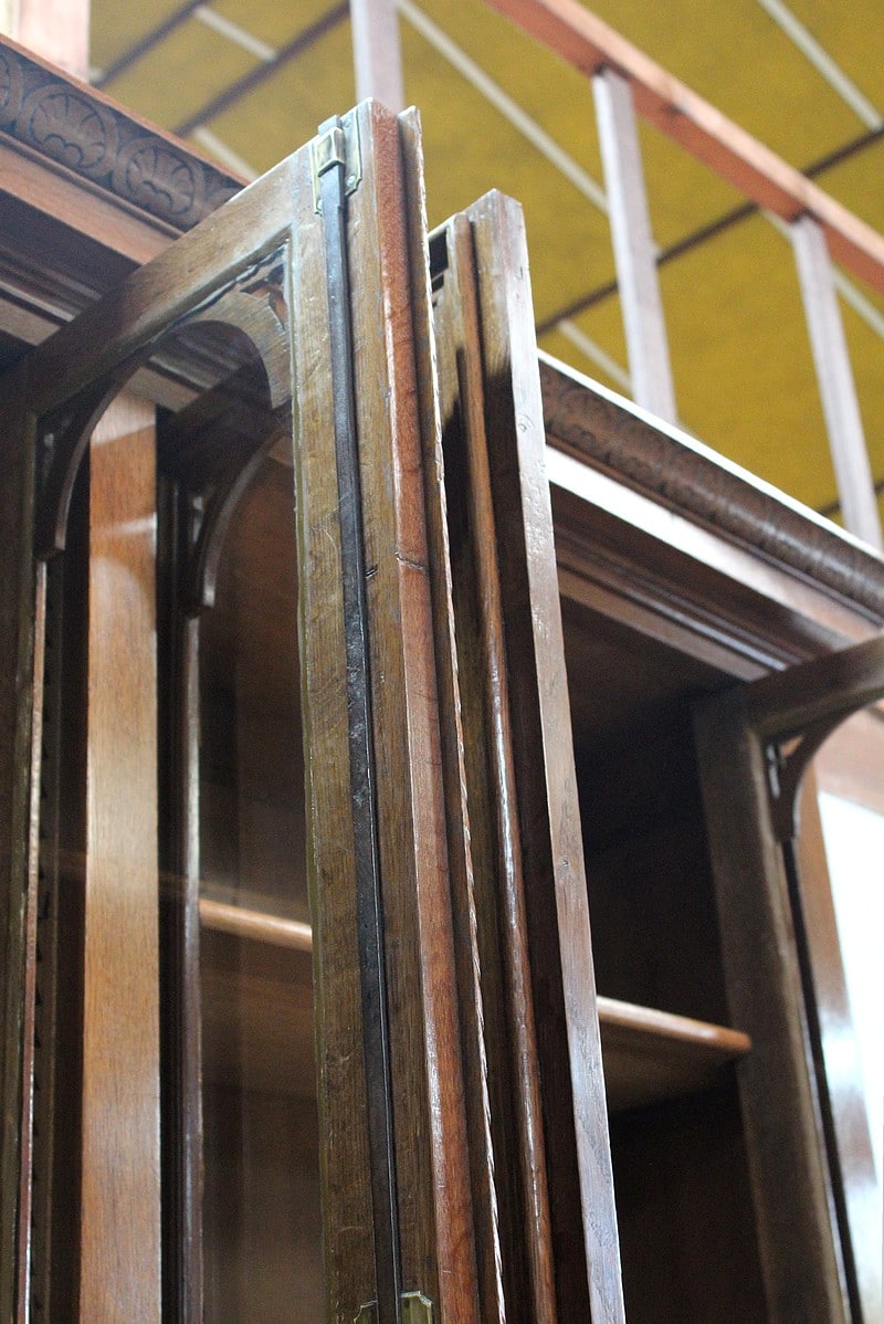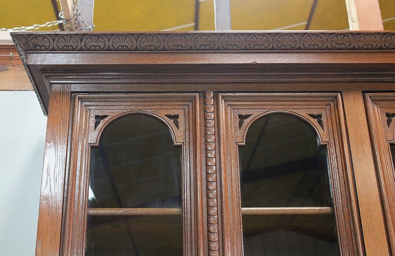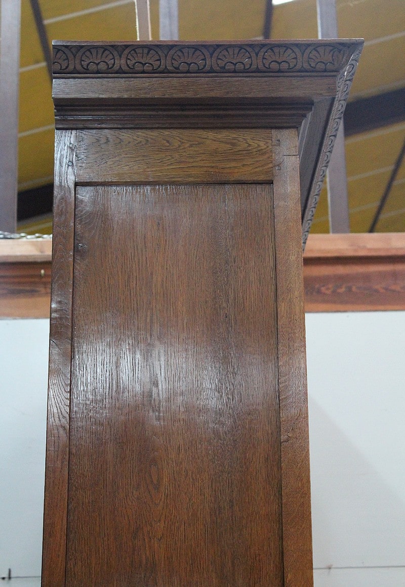 Sa partie haute est coiffée d’une corniche moulurée et sculptée. Elle est composée de 4 portes étroites vitrées en ogives sculptées et moulurées aux montants festonnés.
