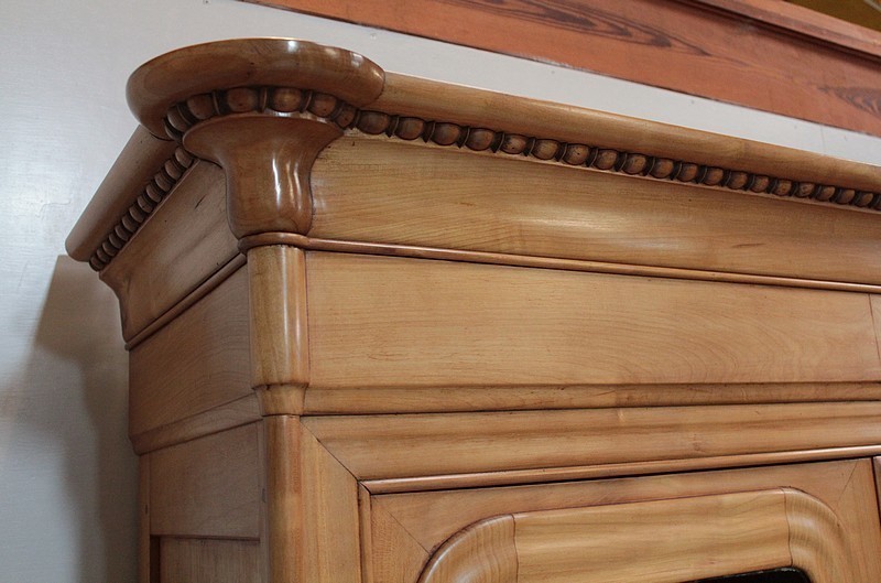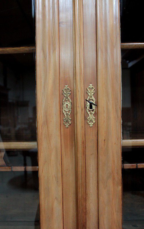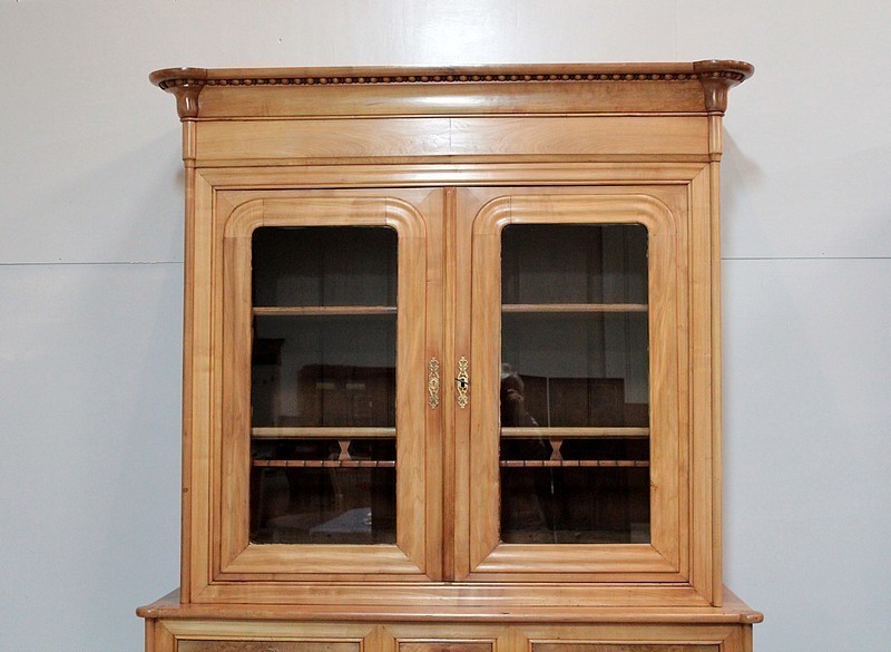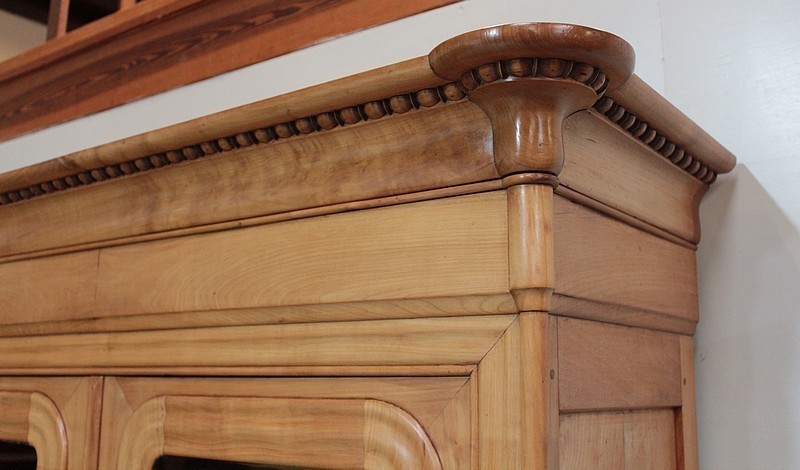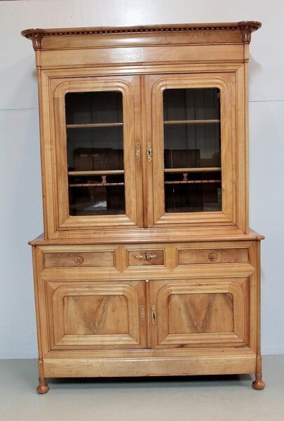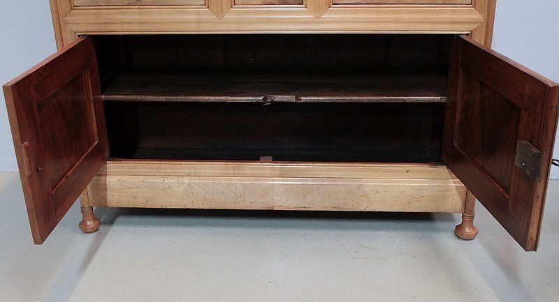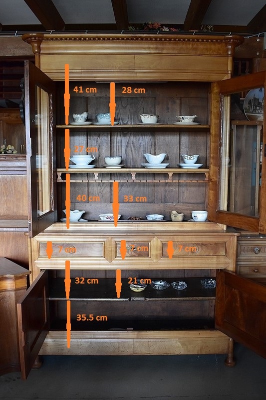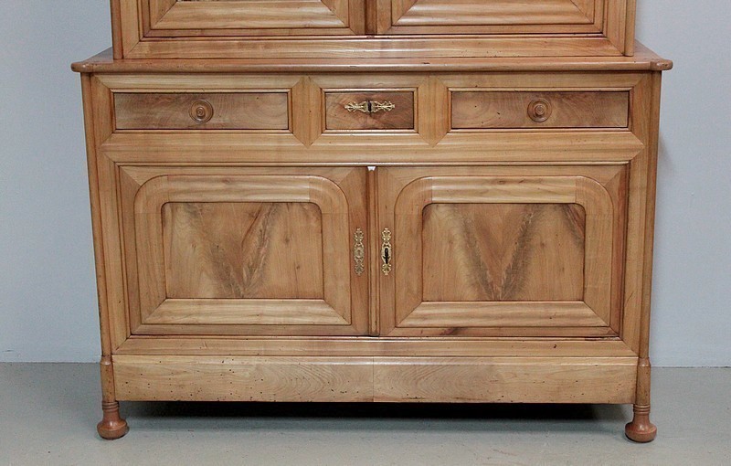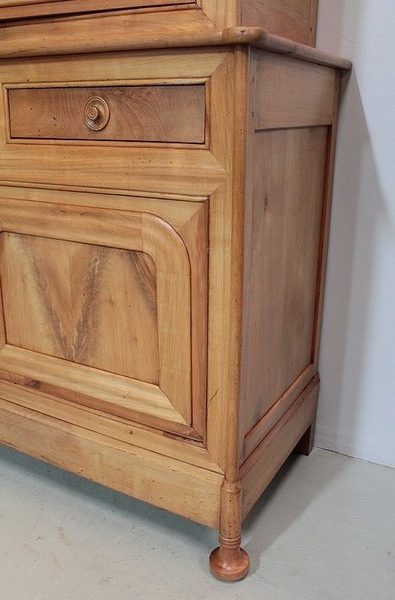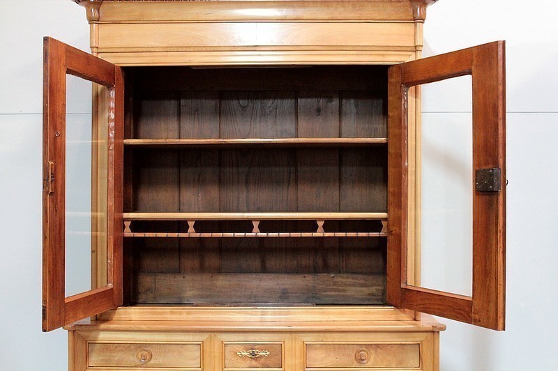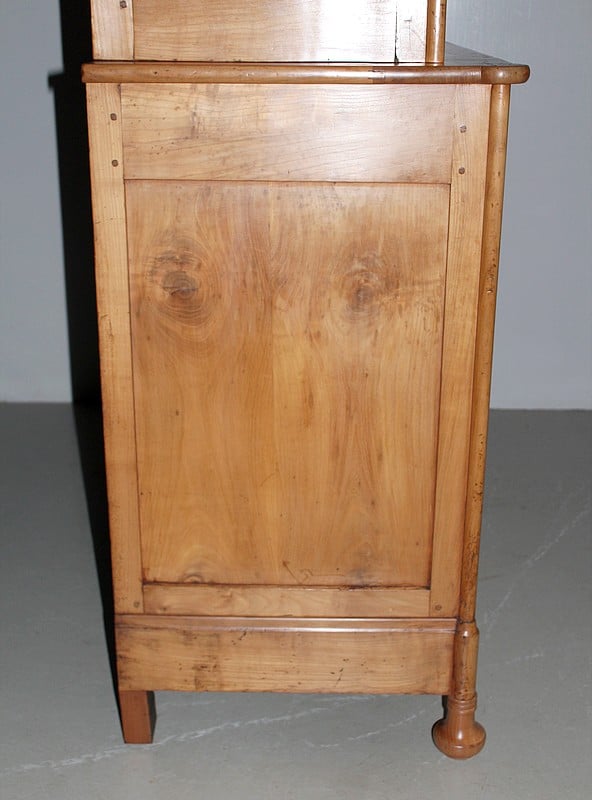 Buffet deux-corps haut vitré, à cadre, en merisier blond massif – façade et côtés – à l’exception des façades de tiroirs.