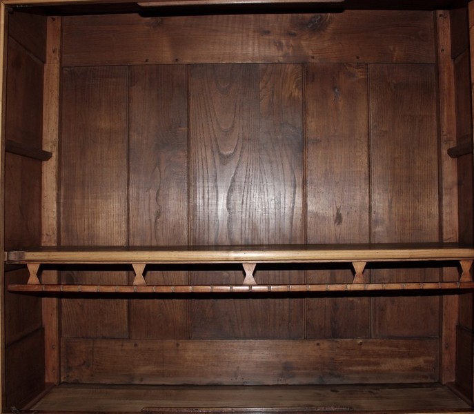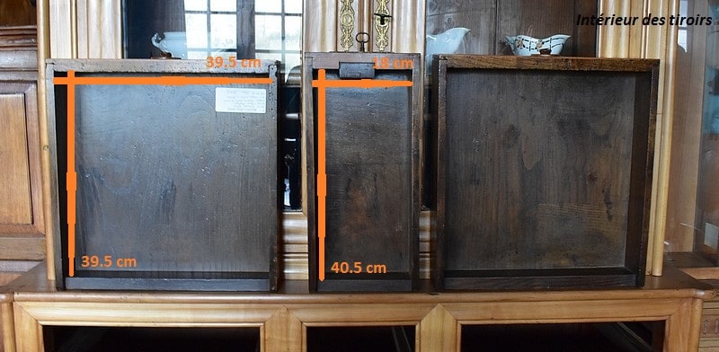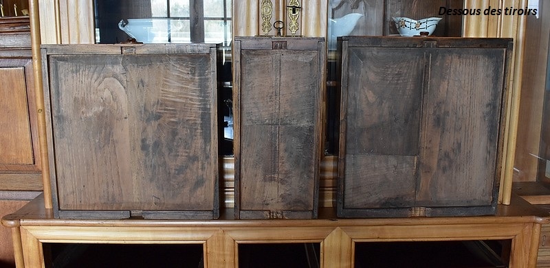 La partie basse ouvre par 3 tiroirs et 2 portes pleines, également à large mouluration. Son intérieur est garni d’une étagère.