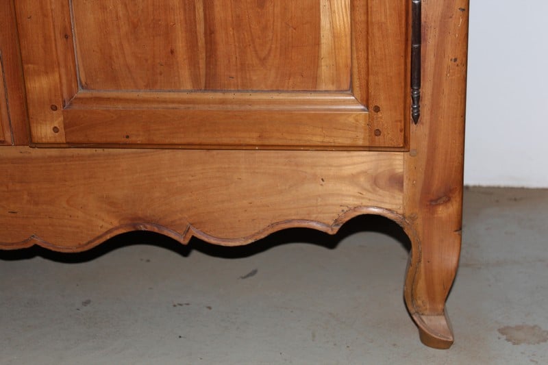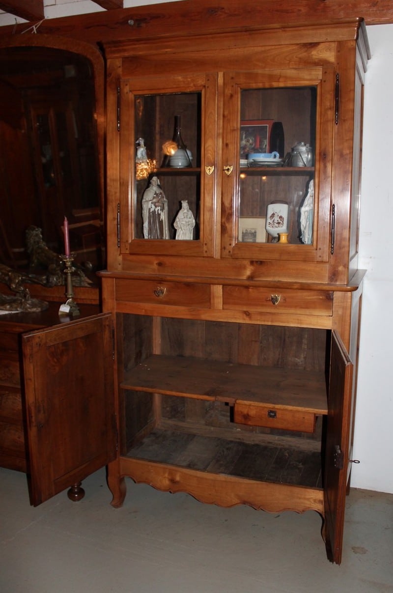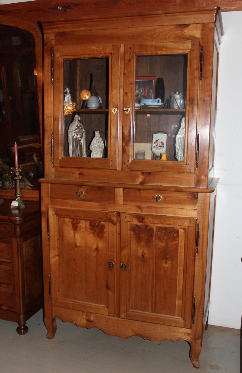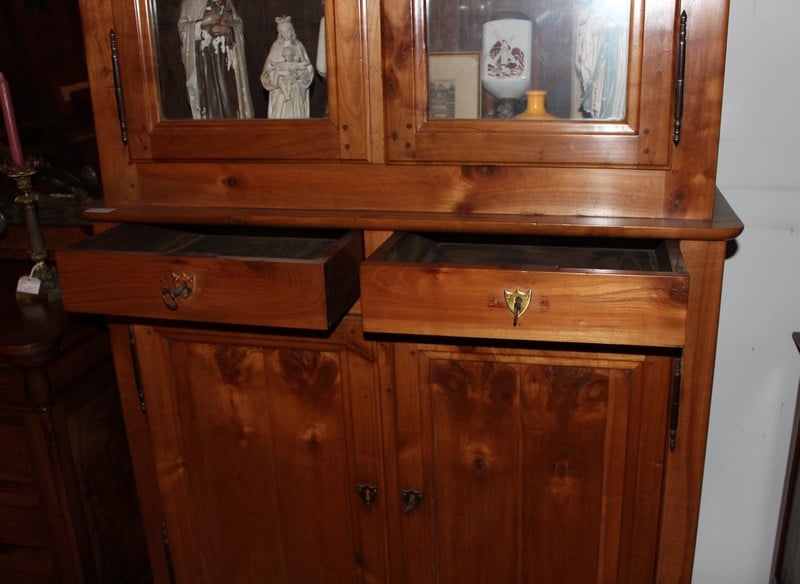 Petit buffet deux-corps en merisier de style Louis XV ouvrant par 4 portes : 2 vitrées en partie haute et 2 pleines en partie basse, et 3 tiroirs dont 1 intérieur.