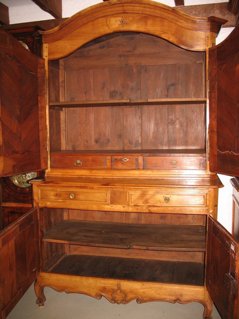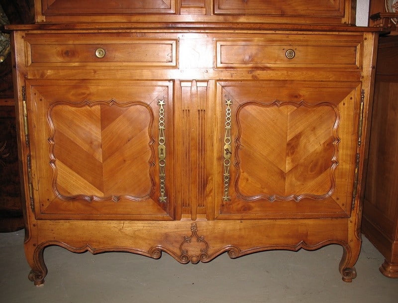 Buffet Deux-Corps Louis XV en merisier à portes médaillons et corniche en Chapeau de Gendarme. Tiroirs intérieurs en partie haute. Petite marqueterie et fine sculpture. Région de Nantes.