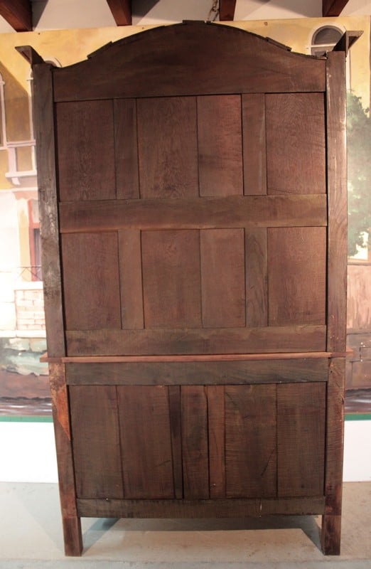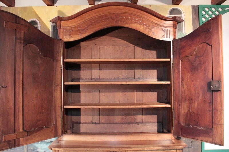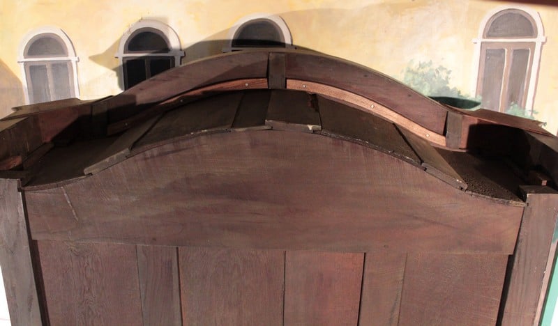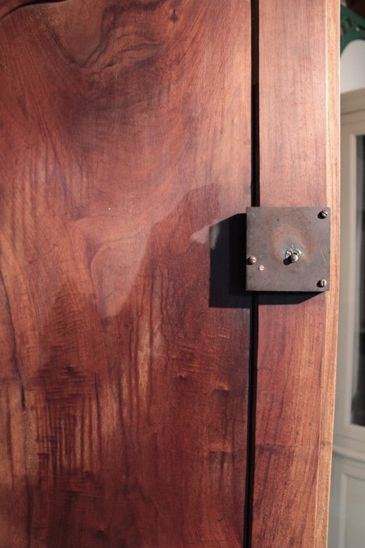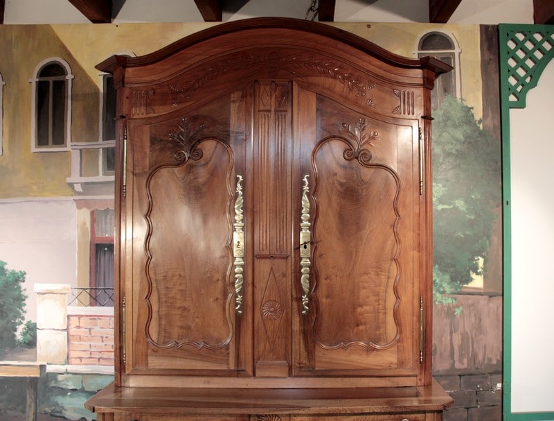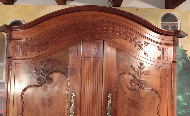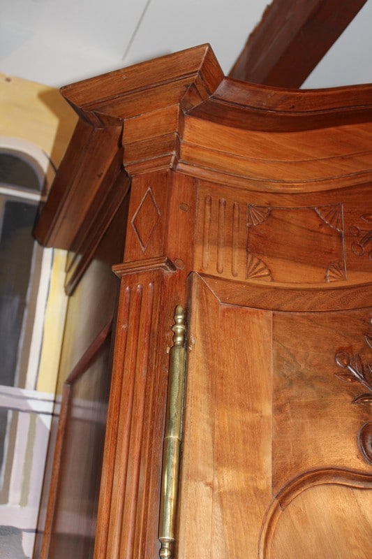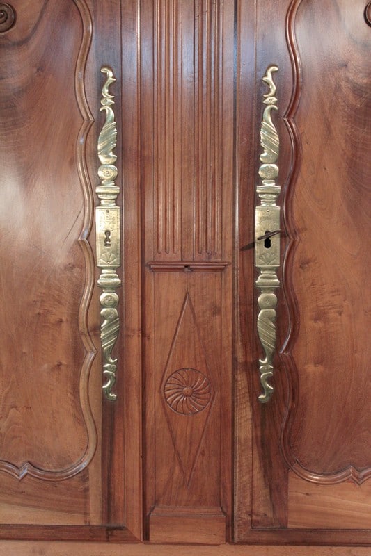 Corniche en ‘chapeau de gendarme’ et pans coupés à cannelures. Les portes médaillons ornées de sculptures de fleurs sont à défoncement. Les traverses haute et basse sont sculptées de branchages.