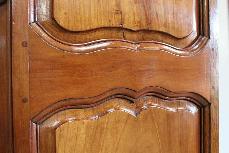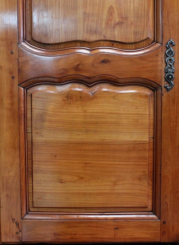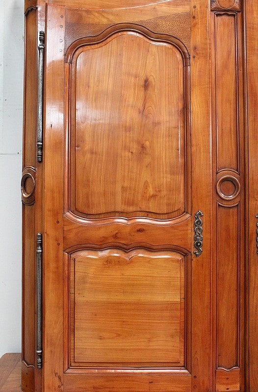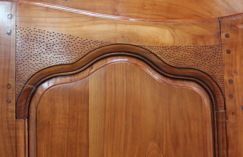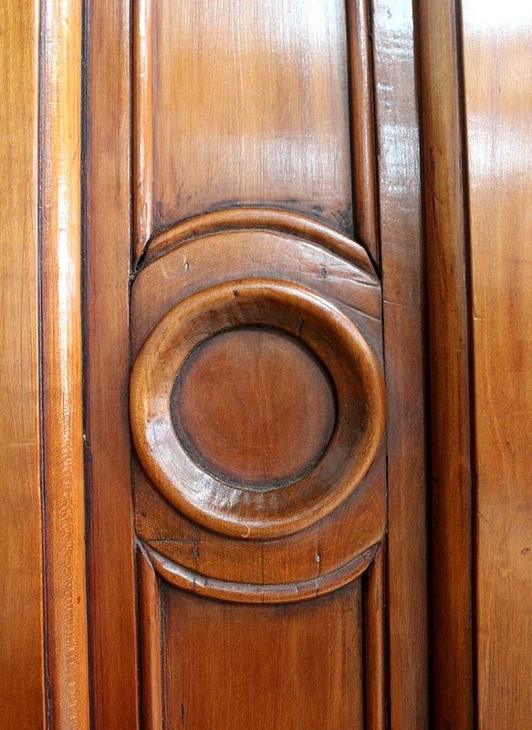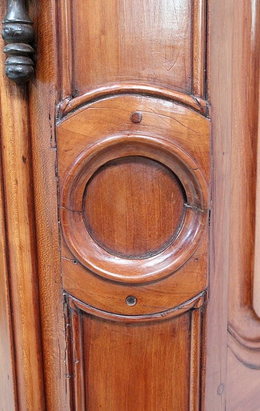 Les vantaux du premier Corps sont, en partie haute, légèrement galbés et présentent d’étonnants poinçonnages Décoratifs. Le dormant arbore en son centre un cercle sculpté, ornement que l’on retrouve également sur ses angles à pans coupés, caractéristiques du règne du Roi Soleil.