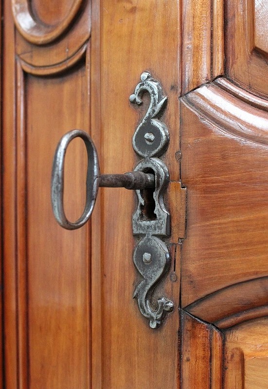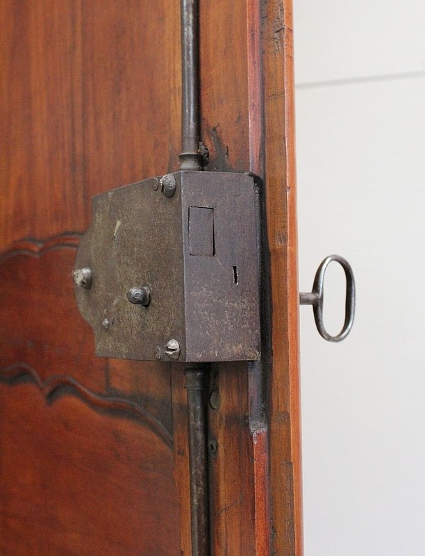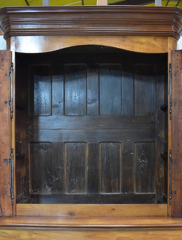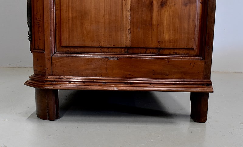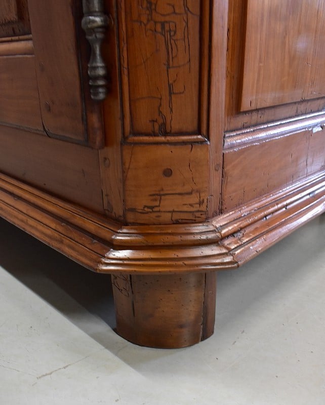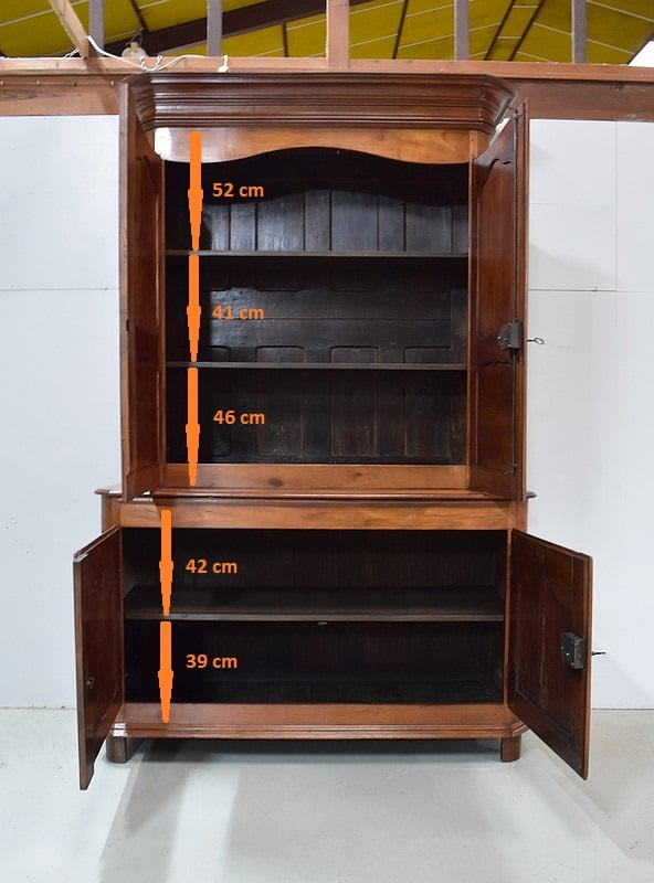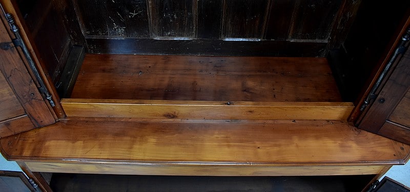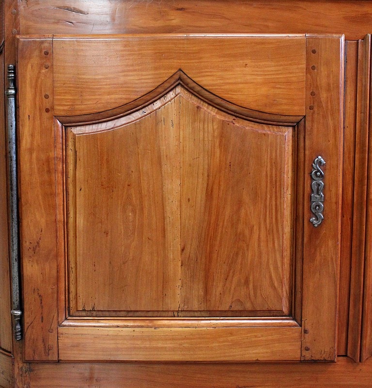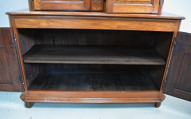 Chacun de ces éléments ouvre par deux portes, découpées avec moulures et plates bandes, tout comme les côtés du meuble. Elles sont dotées d’entrées de serrures et de fiches en fer d’époque. Elles se verrouillent et ce Buffet est fourni avec ses deux clés d’origine.