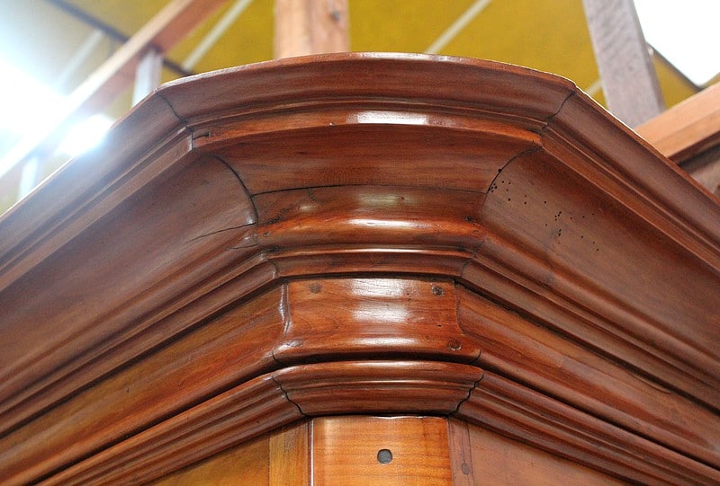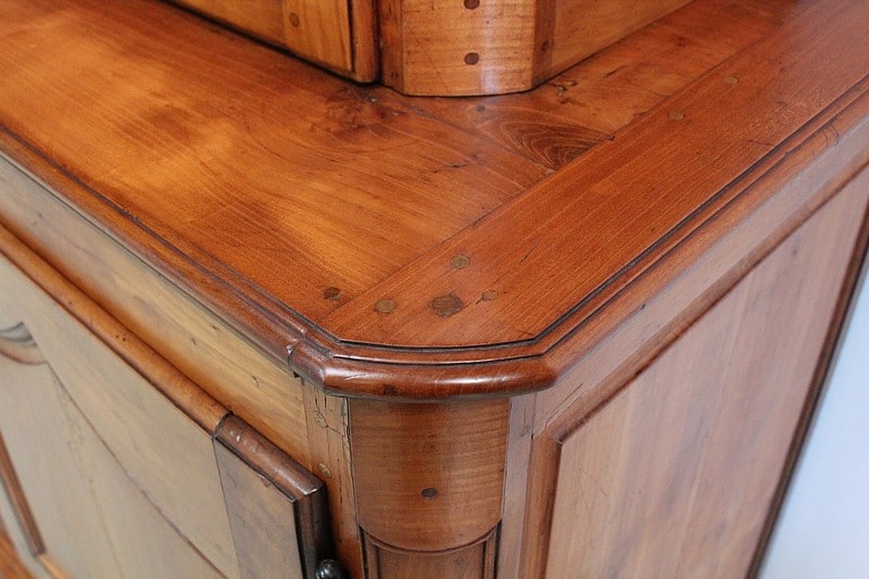 Ce Buffet Deux Corps est sommé d’une importante Double Corniche richement ouvragée et sa traverse basse est moulurée.