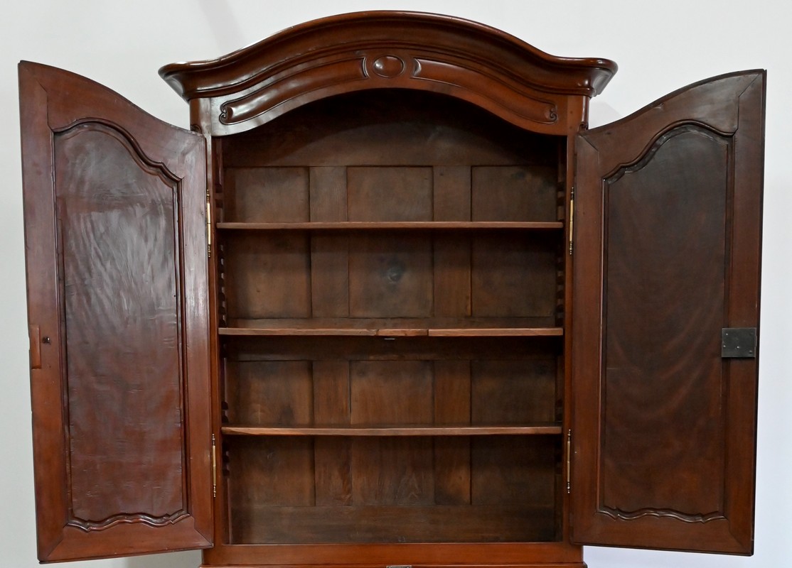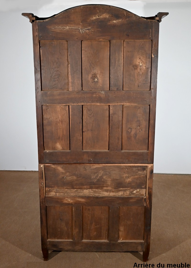 La partie haute est composée de deux portes à encadrements travaillés. Les panneaux, symétriques, proviennent de la même bille de bois. Ces ouvrants sont pourvus d’une serrure d’origine avec clé et entrée flamme. Le revers de ces portes est mouluré et à plates-bandes, ce qui, pour information, permettait d’exposer la vaisselle au su et au vu de tous.