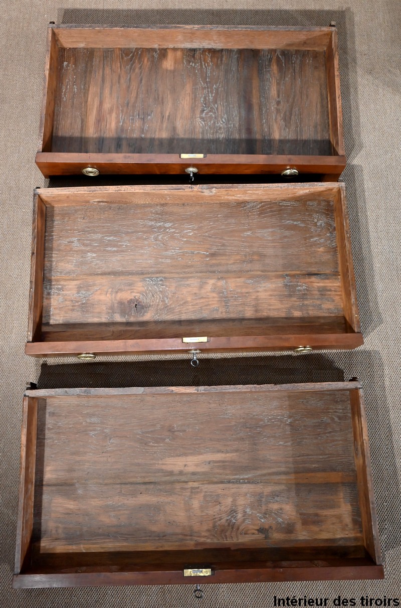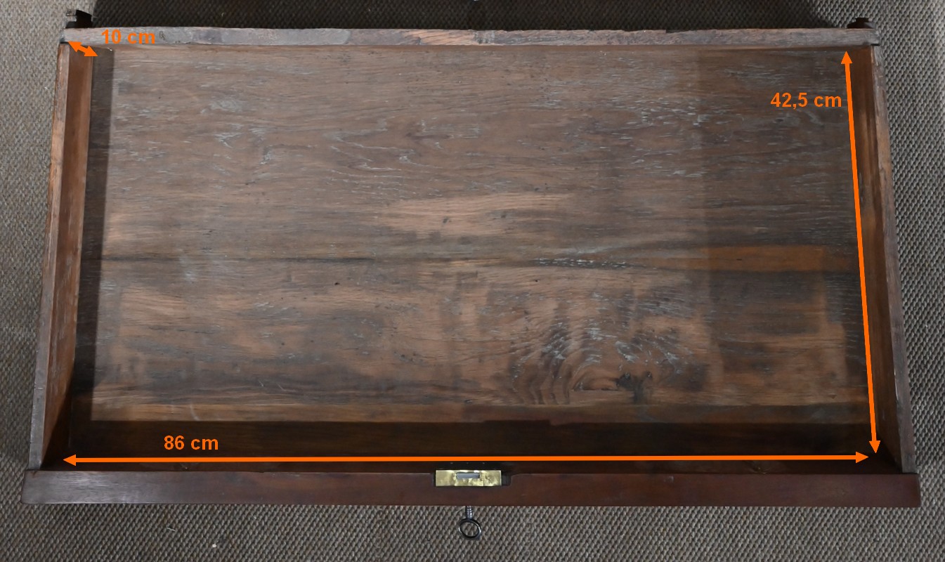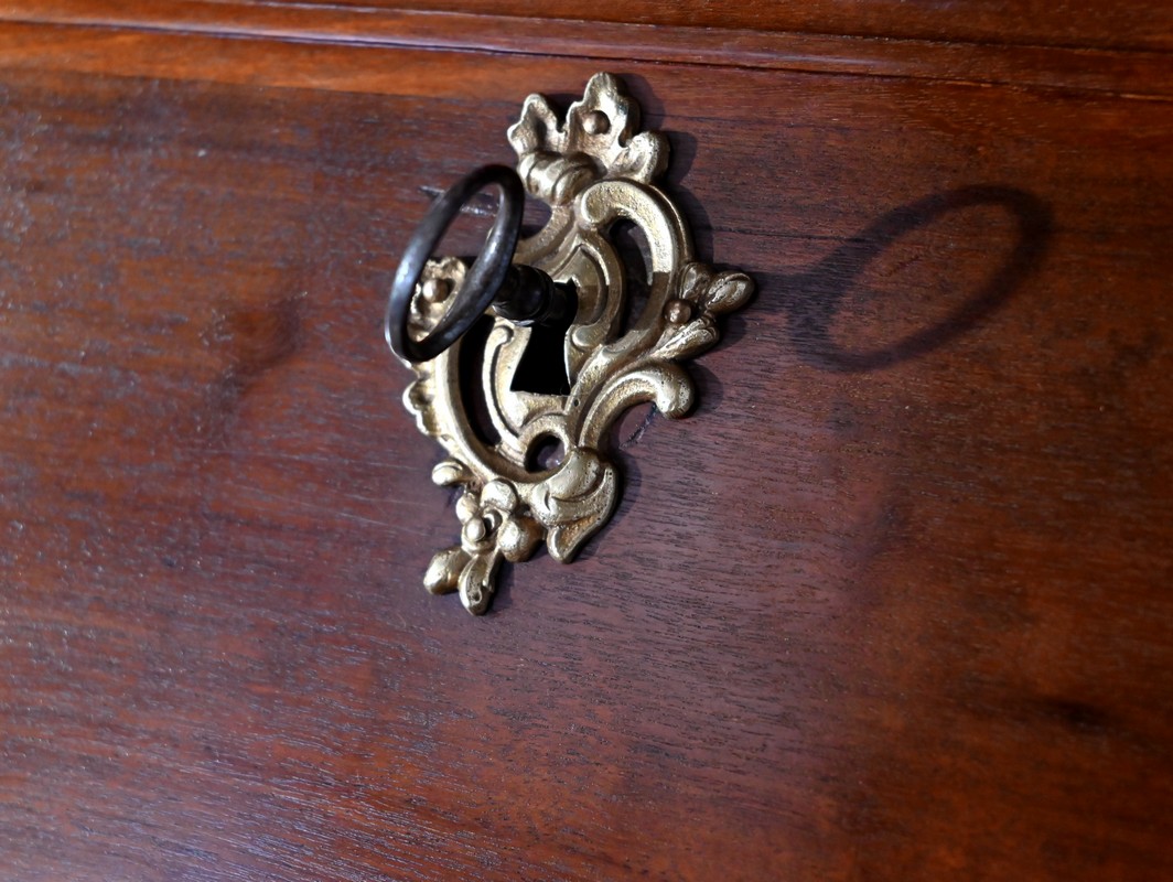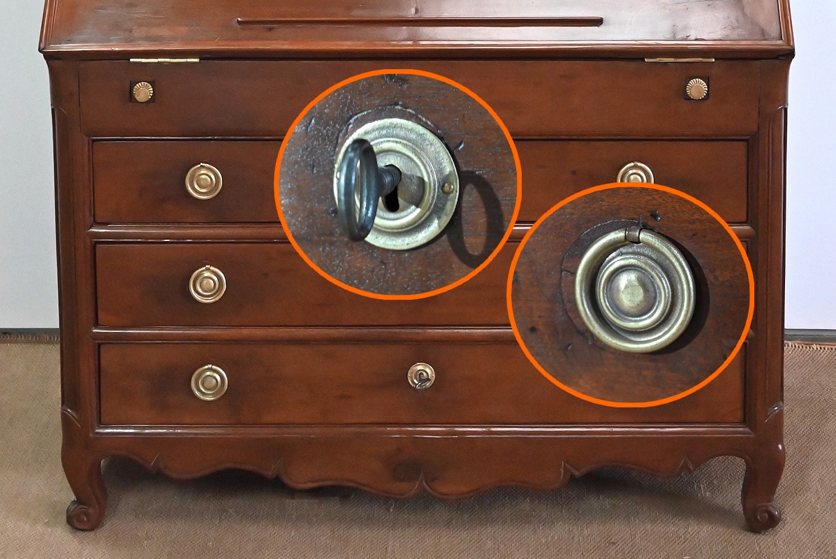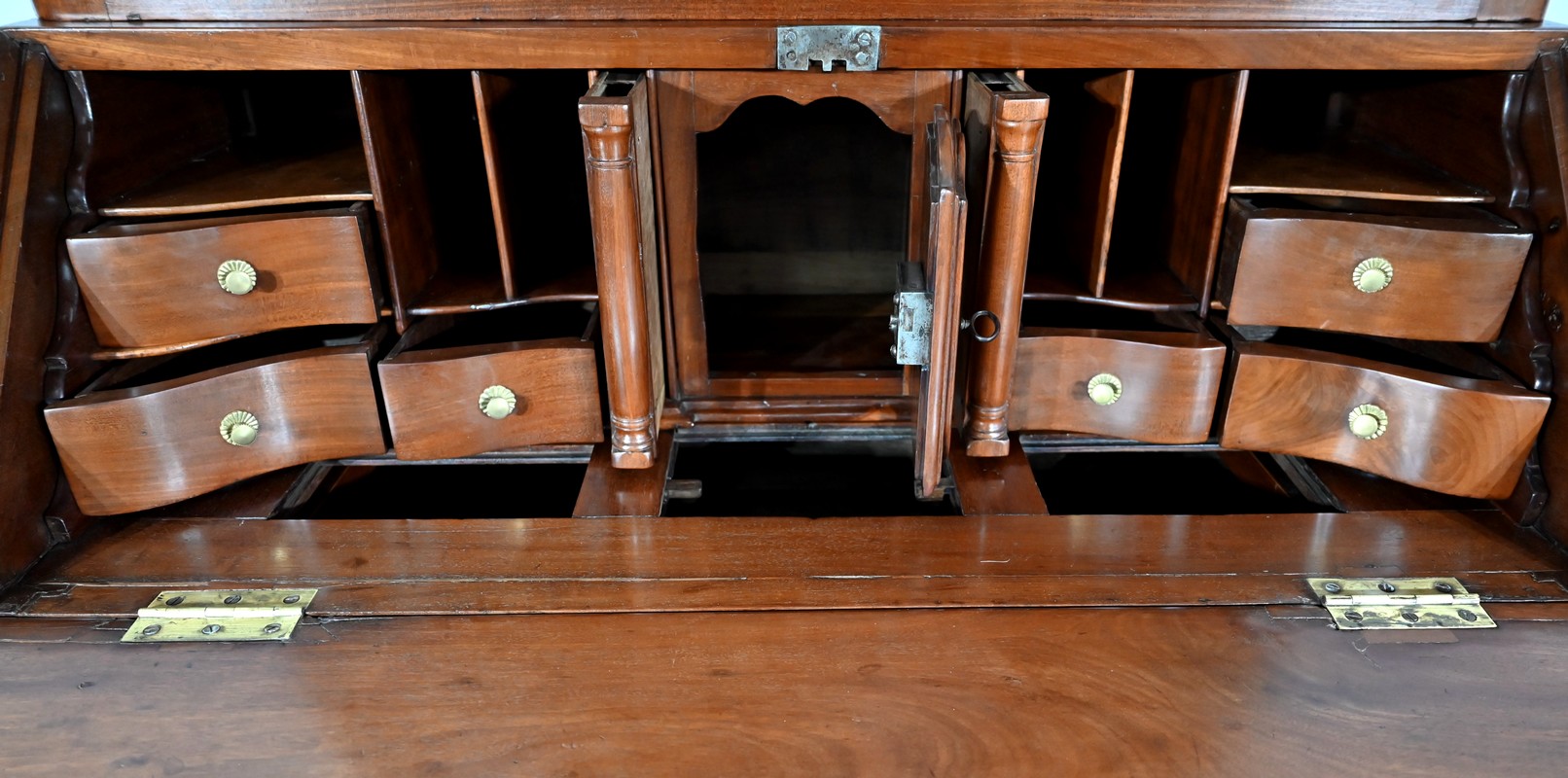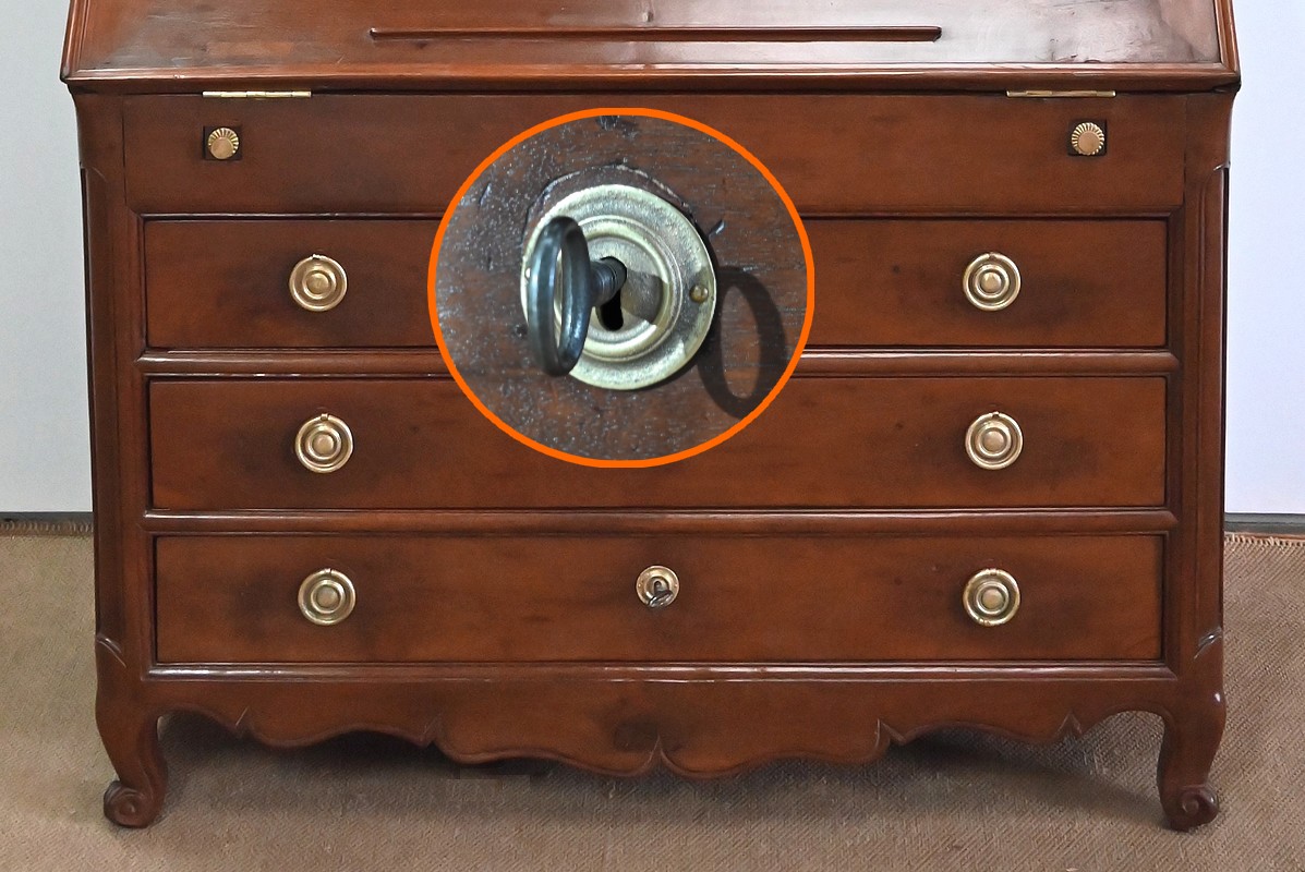 La partie commode scriban s’ouvre par un abattant, foncé d’un seul panneau, à encadrement à coupe d’onglet, mouluré d’un demi-rond et d’une baguette porte-documents. Cet abatant est équipé d’une serrure authentique, à deux peignes, en état de fonctionnement avec clé et entrée bronze.