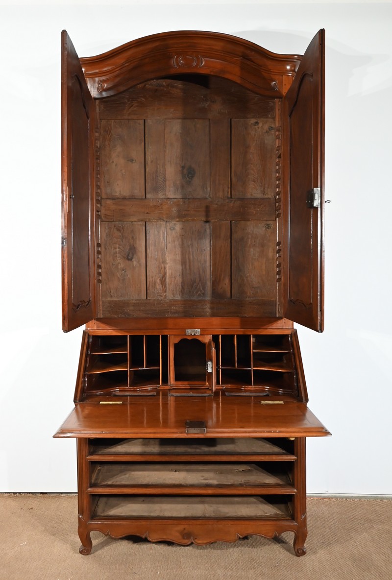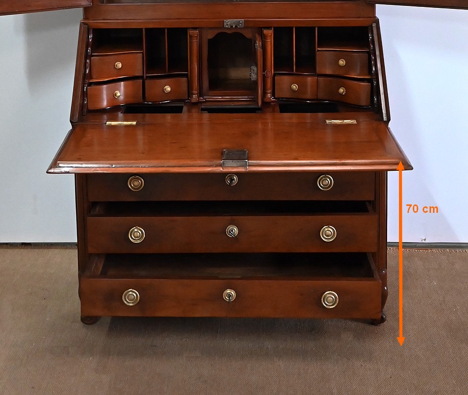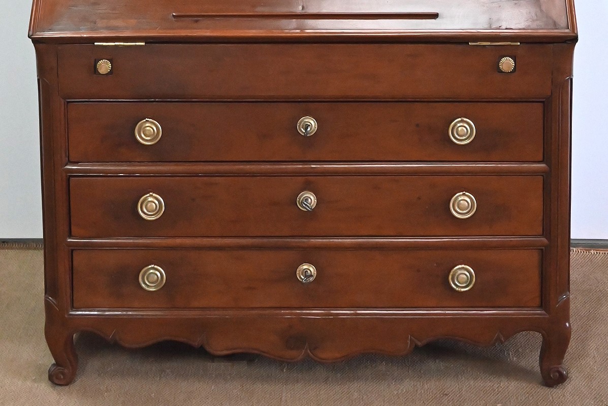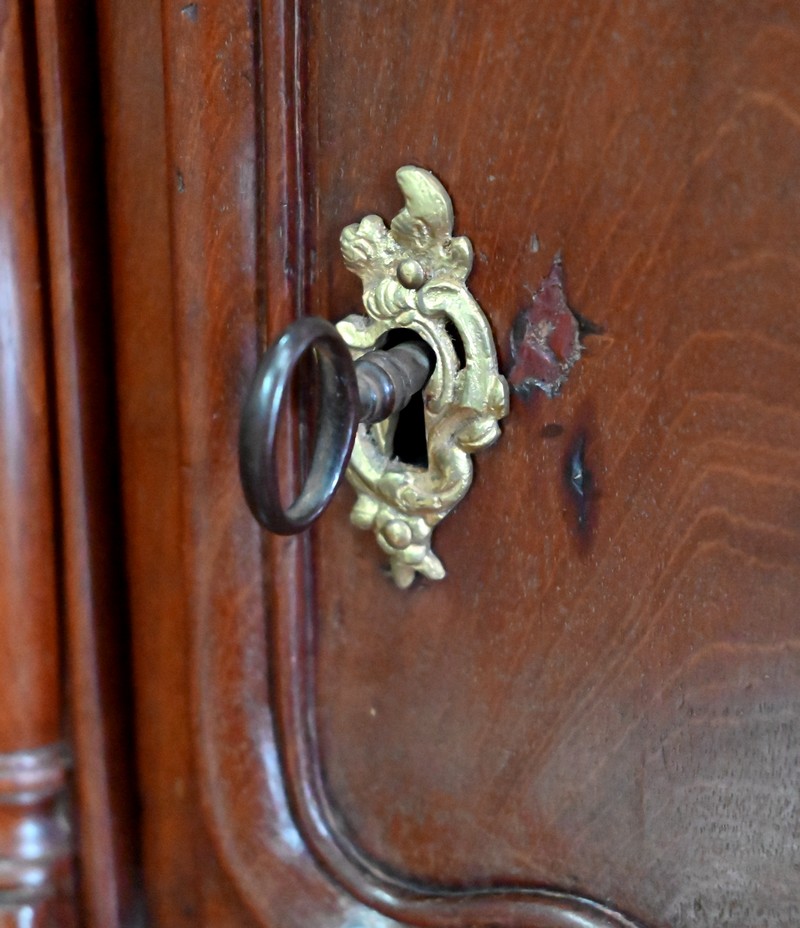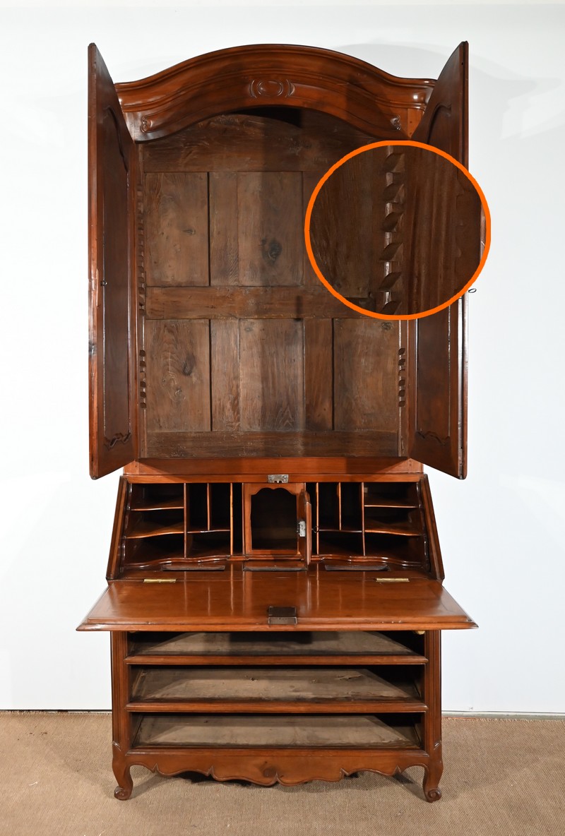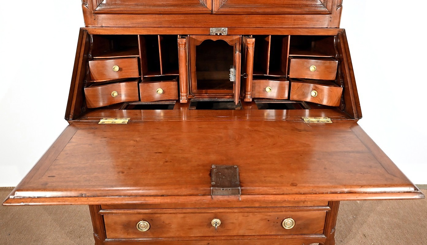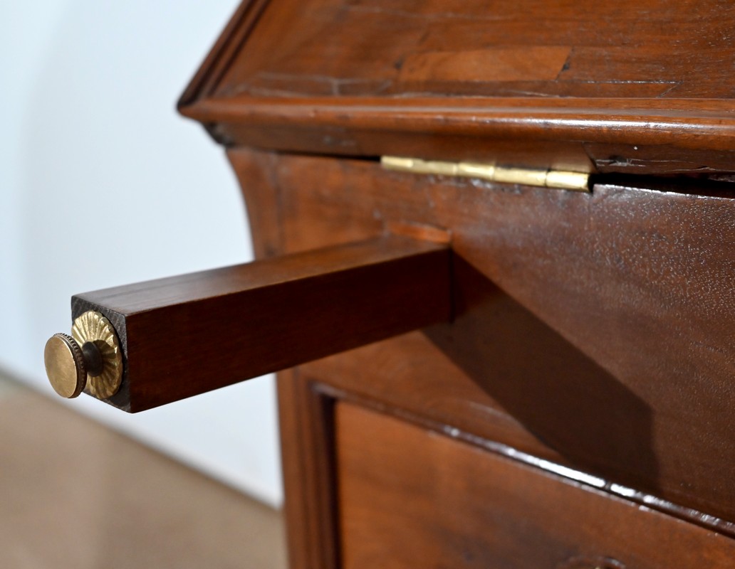 La partie commode scriban s’ouvre par un abattant, foncé d’un seul panneau, à encadrement à coupe d’onglet, mouluré d’un demi-rond et d’une baguette porte-documents. Cet abatant est équipé d’une serrure authentique, à deux peignes, en état de fonctionnement avec clé et entrée bronze.