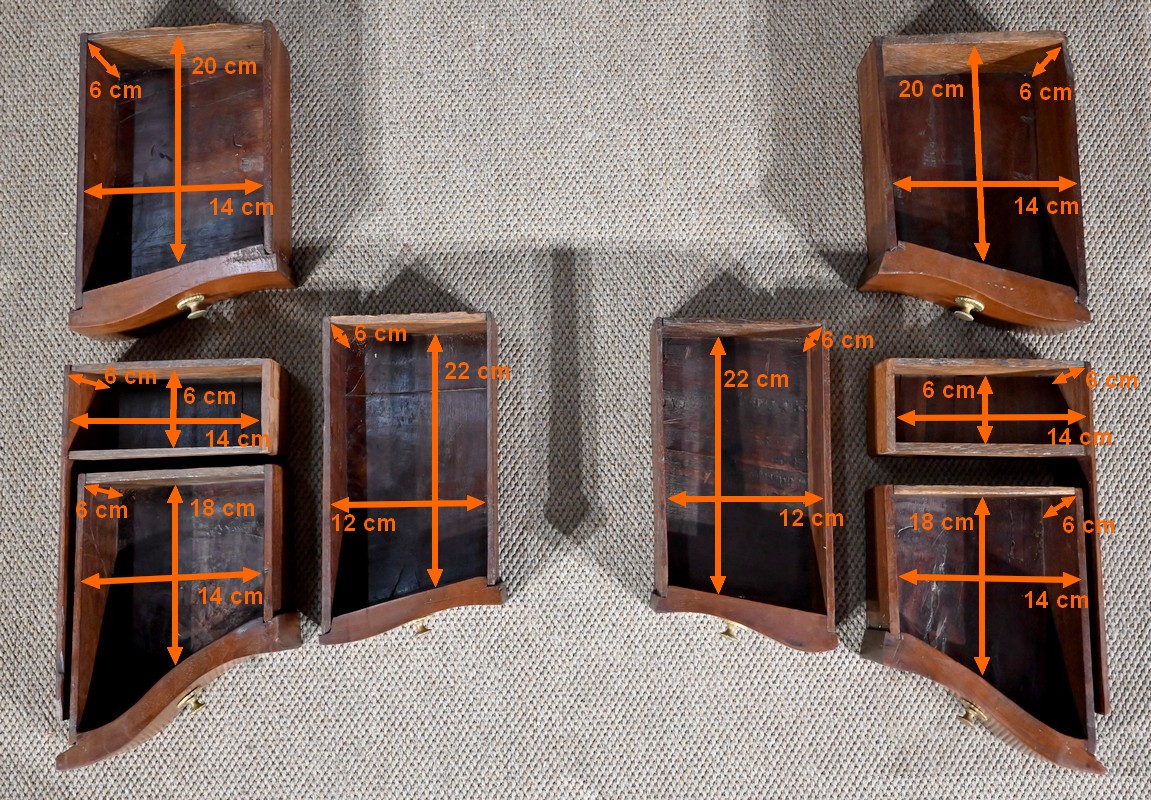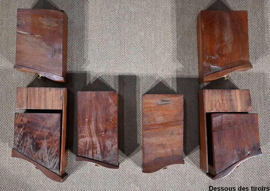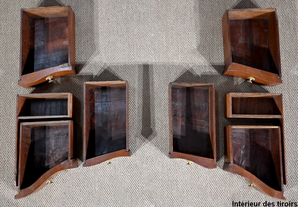De chaque côté, en avancé, on retrouve trois tiroirs avec boutons bronze, ainsi que trois niches. Cet intérieur comporte de nombreuses caches dissimulées notamment de fausses colonnes attachées ou des réserves à panneaux coulissants.