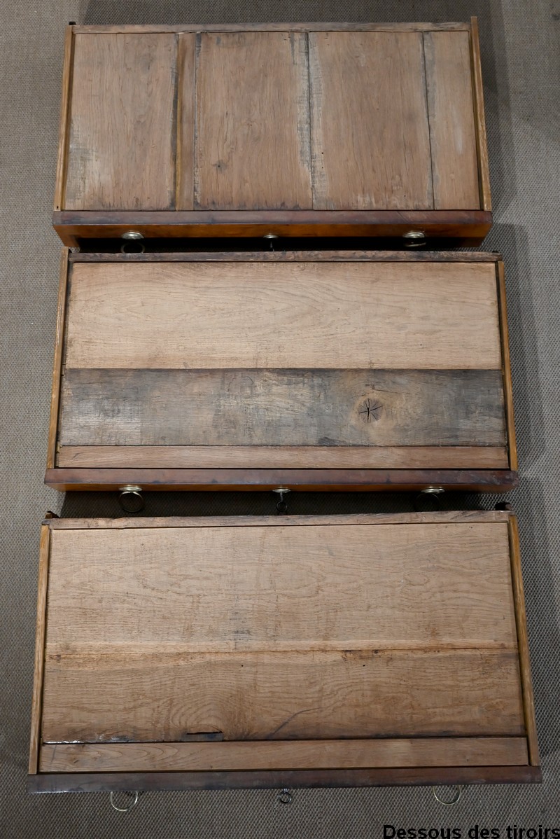 Ce meuble portuaire présente en façade trois tiroirs identiques, à poignées anneaux, munis de serrures avec clé et entrée cuvette.
