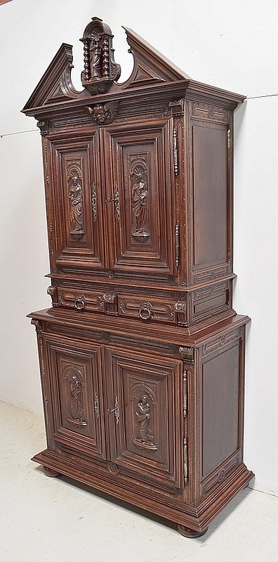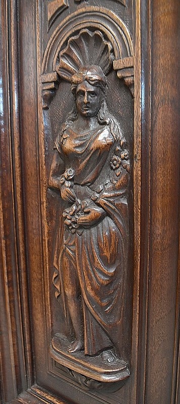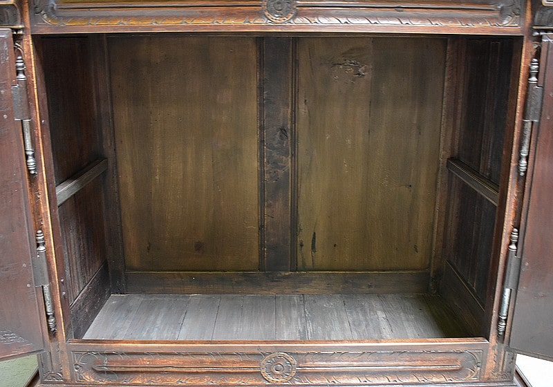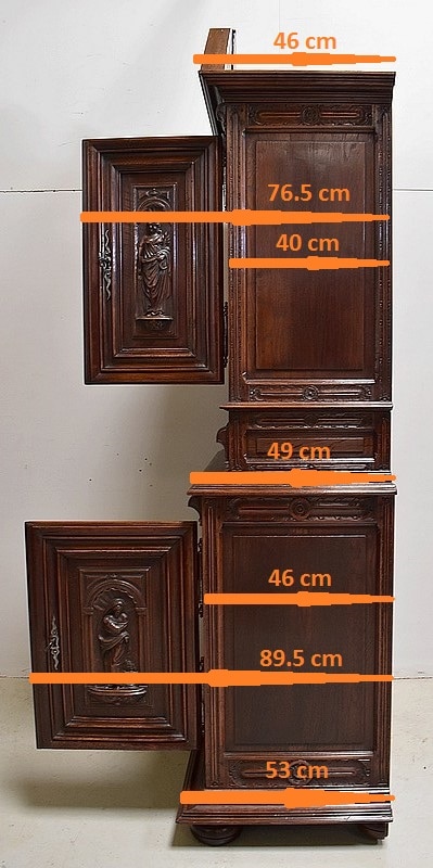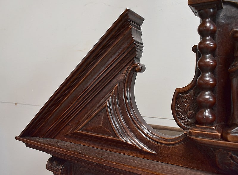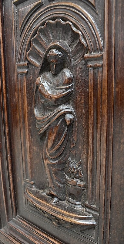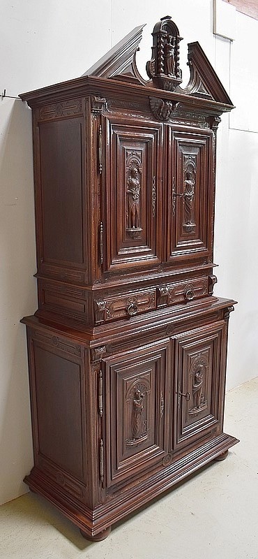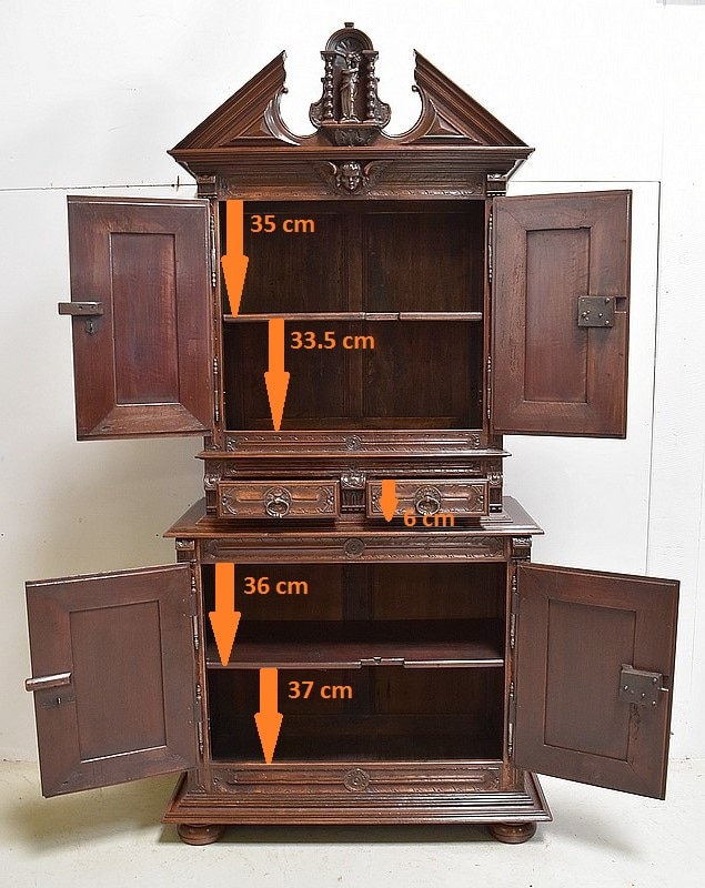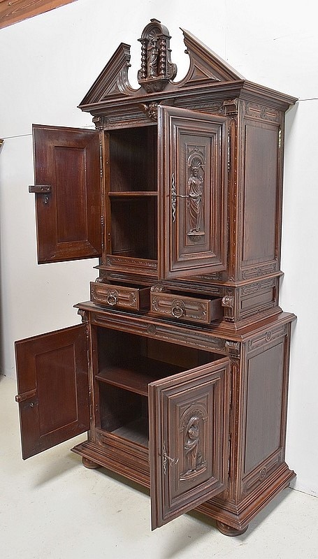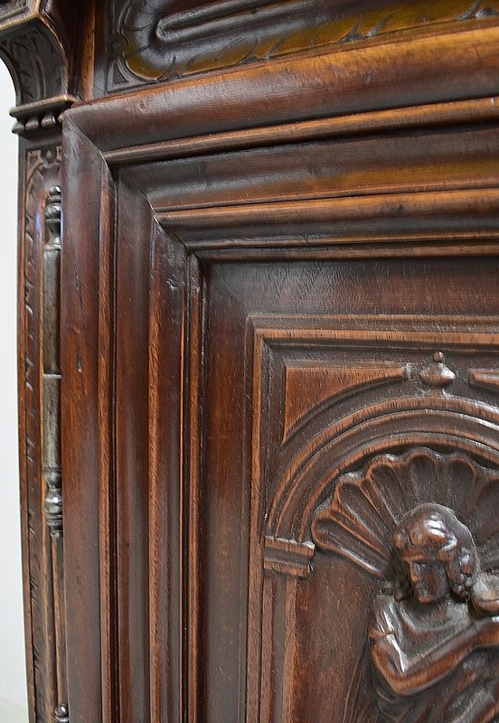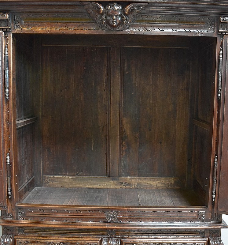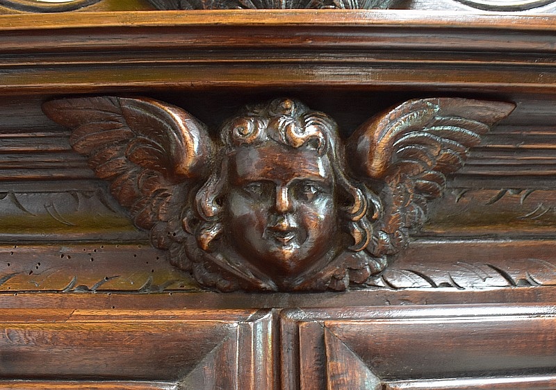 La partie haute, à corps rétréci, ouvre par 2 portes, découvrant 2 compartiments de rangement formés par la présence d’une étagère de 33 cm de profondeur. Ces portes sont dotées de ferrures, d’une serrure en état de fonctionnement et de sa clé, l’ensemble d’origine. Elles sont richement ornementées, les éléments les plus notables étant ses 2 personnages sculptés, eux mêmes encadrés par une série de moulures saillantes de taille croissante. Un visage d’angelot au milieu de ses ailes vient également enjoliver ce 1er élément surmonté d’une imposante Corniche très ouvragée. Son fronton à pentes montants vers le ciel, donne en façade l’illusion d’un toit. En son centre, une niche abrite la sculpture amovible d’un personnage antique.