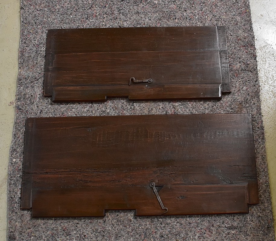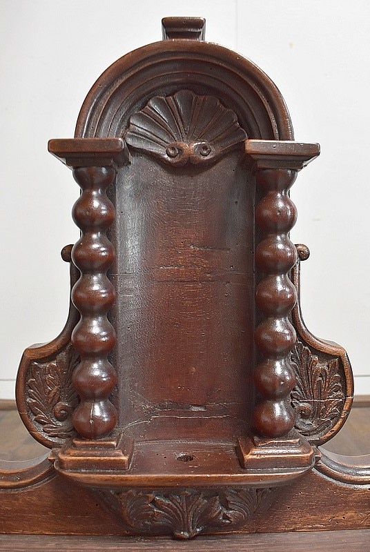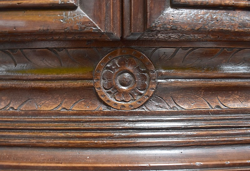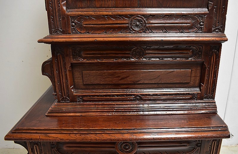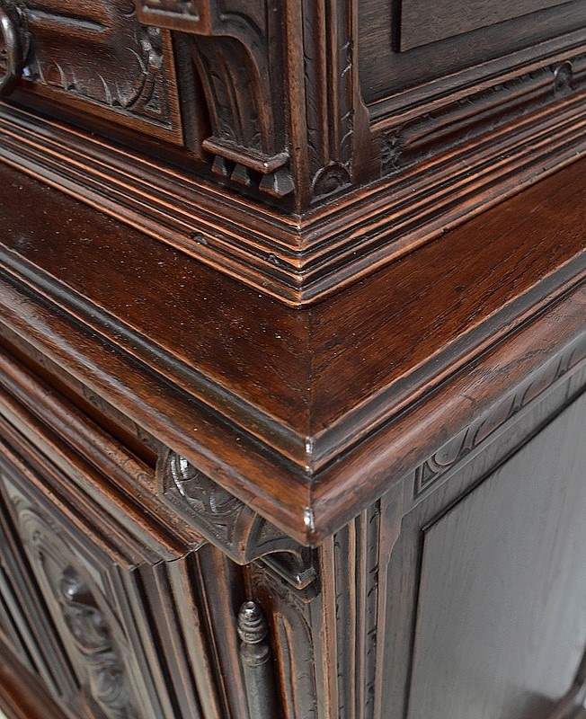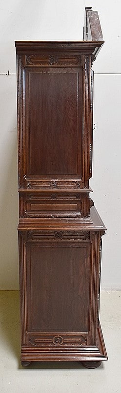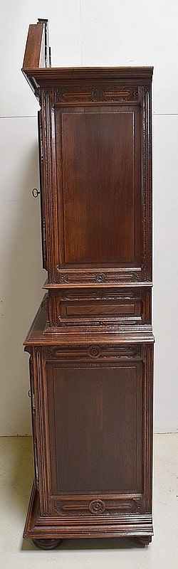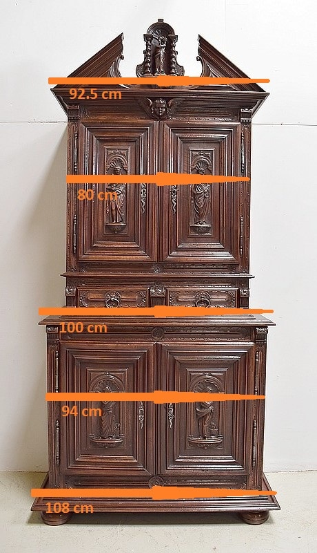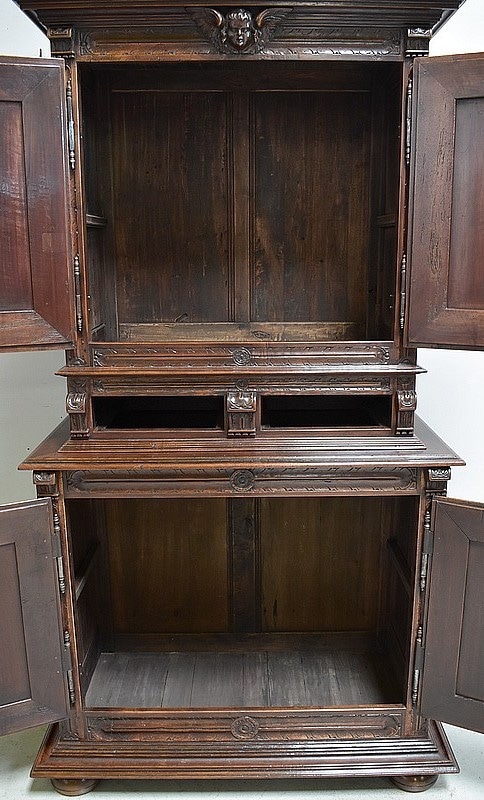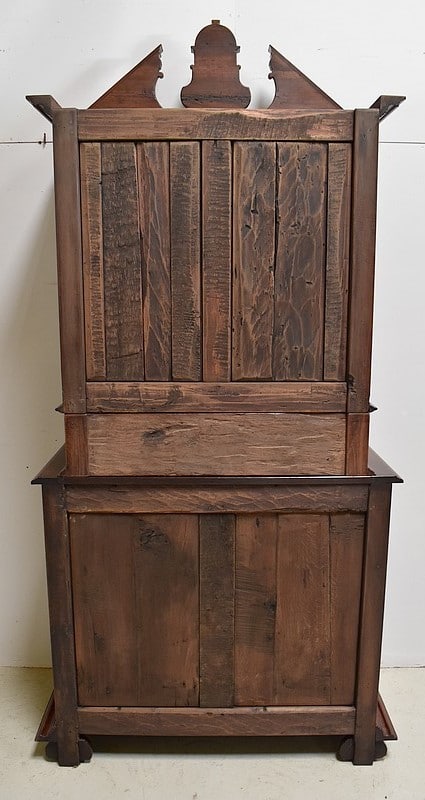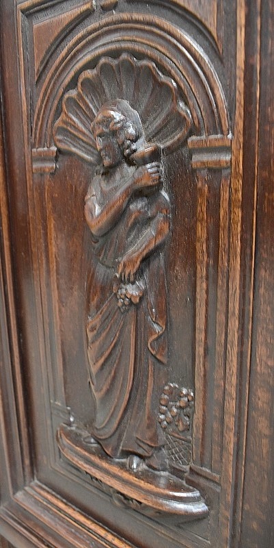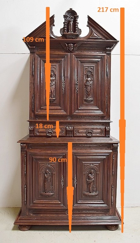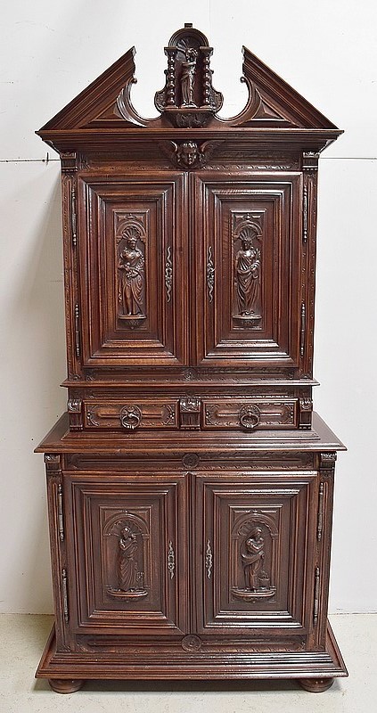 La partie haute, à corps rétréci, ouvre par 2 portes, découvrant 2 compartiments de rangement formés par la présence d’une étagère de 33 cm de profondeur. Ces portes sont dotées de ferrures, d’une serrure en état de fonctionnement et de sa clé, l’ensemble d’origine. Elles sont richement ornementées, les éléments les plus notables étant ses 2 personnages sculptés, eux mêmes encadrés par une série de moulures saillantes de taille croissante. Un visage d’angelot au milieu de ses ailes vient également enjoliver ce 1er élément surmonté d’une imposante Corniche très ouvragée. Son fronton à pentes montants vers le ciel, donne en façade l’illusion d’un toit. En son centre, une niche abrite la sculpture amovible d’un personnage antique.