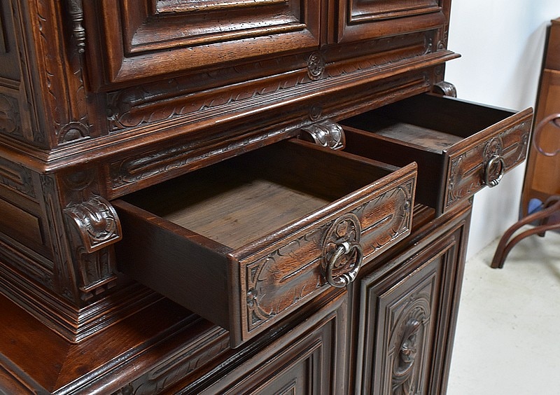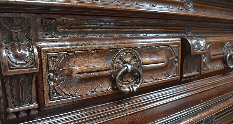 La partie intermédiaire de ce buffet, outre ses multiples décors et frises, offre 2 tiroirs, dotés de poignées de tirage.