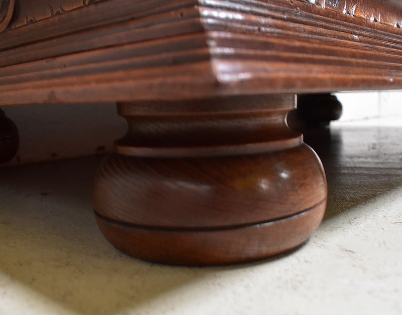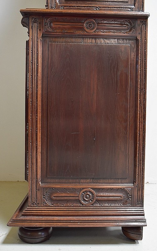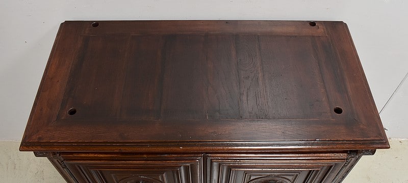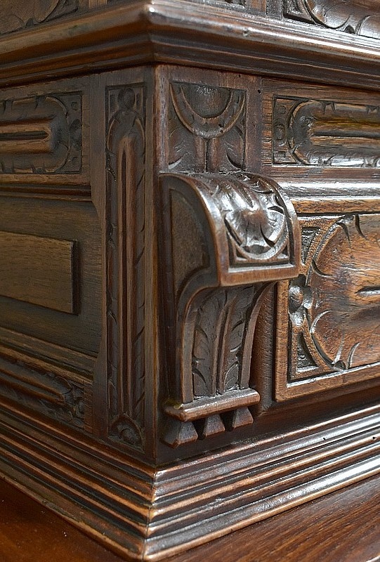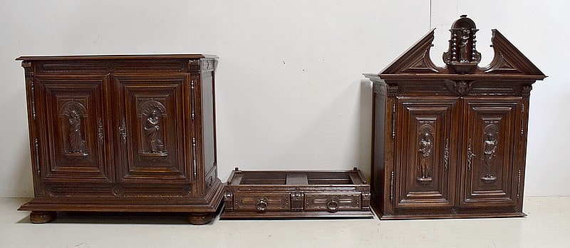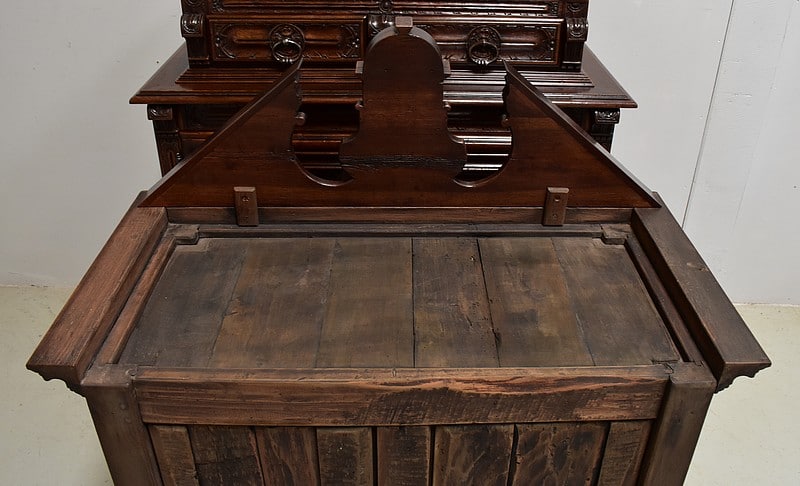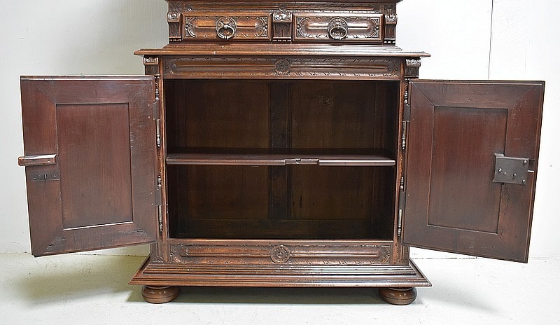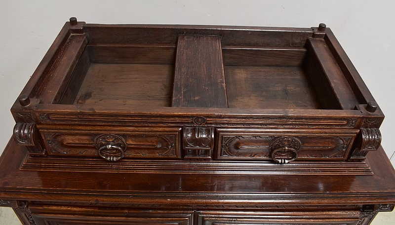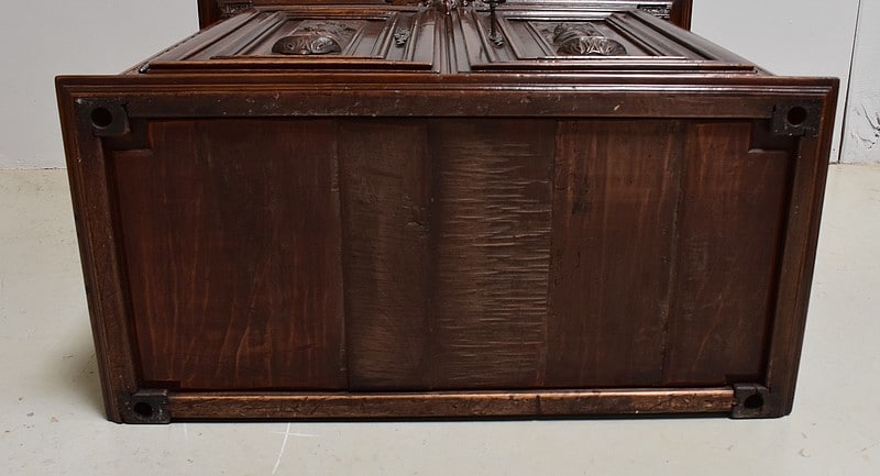 Petit Buffet esprit Renaissance, en Noyer massif dans son intégralité, exception faite du dessus et des panneaux de côtés qui sont en Chêne d’origine.