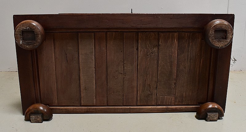 L’ensemble se termine par une Corniche basse moulurée et repose sur 4 pieds ‘Galettes’ : entiers à l’avant, demis à l’arrière.