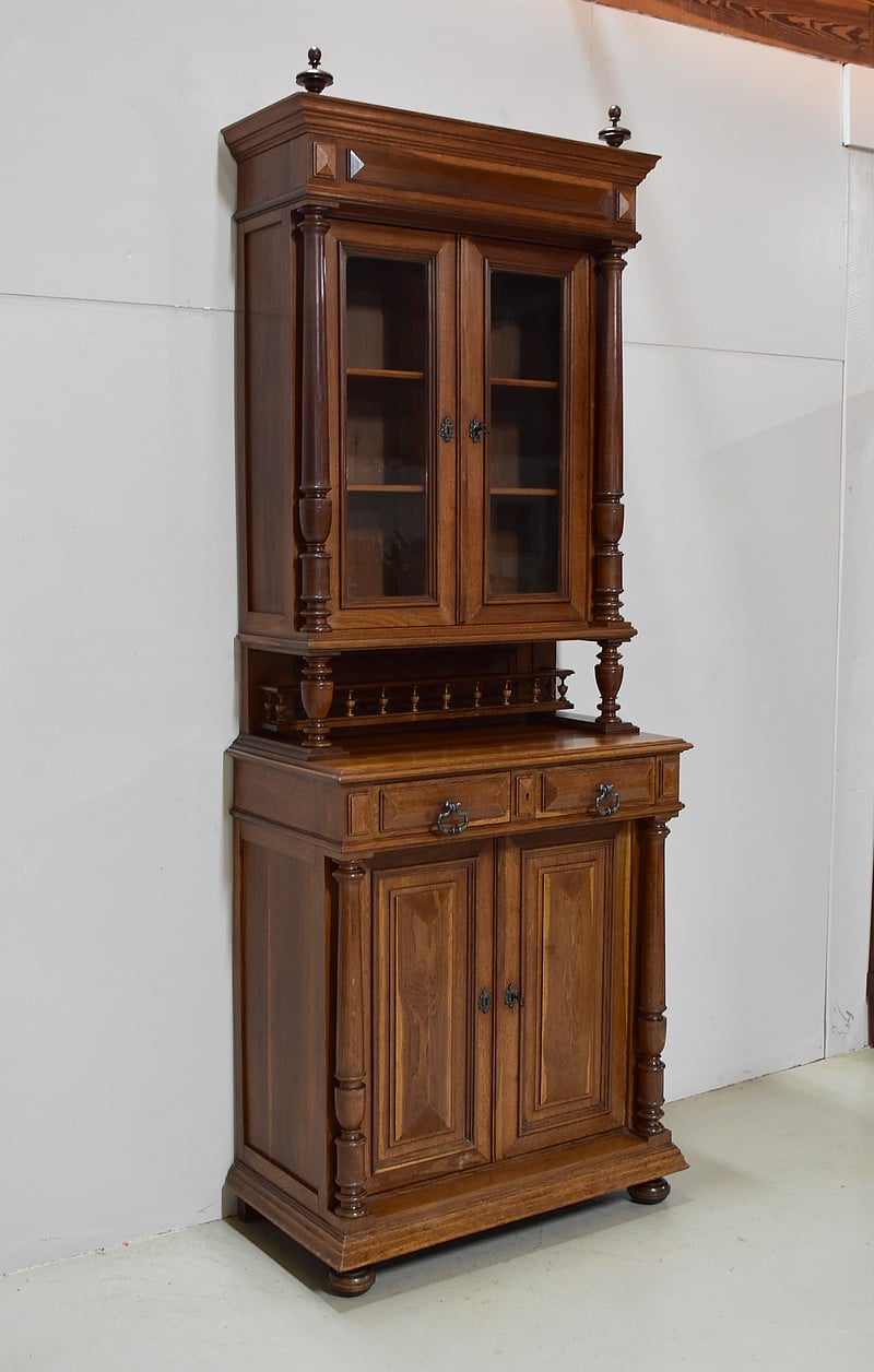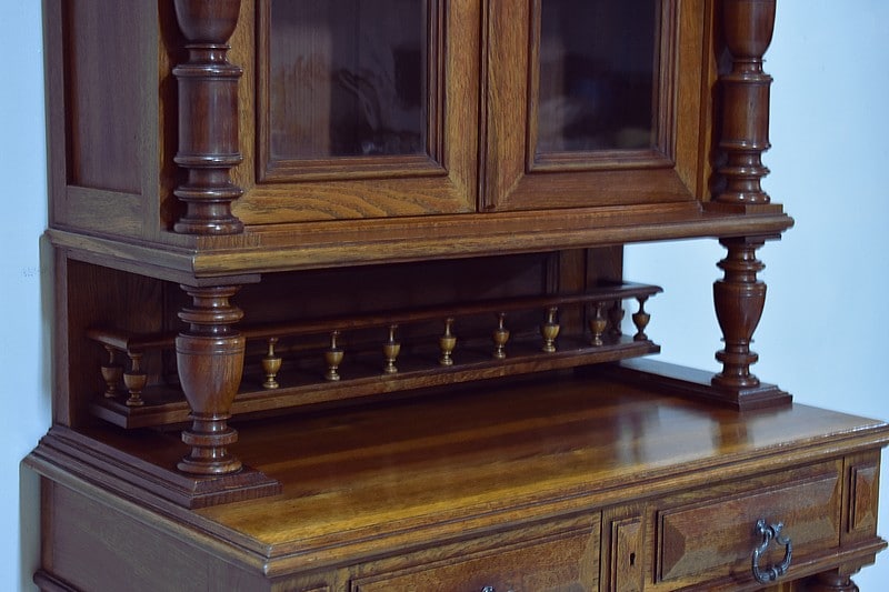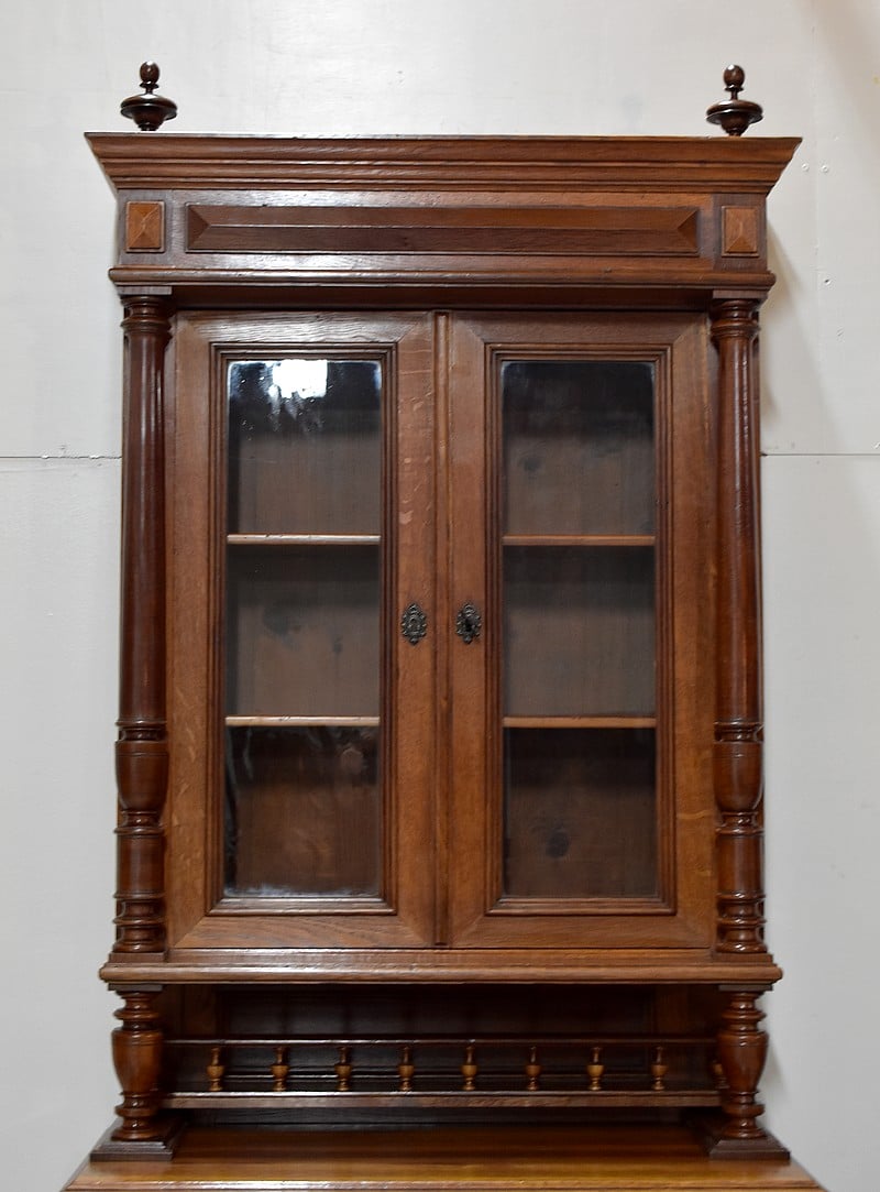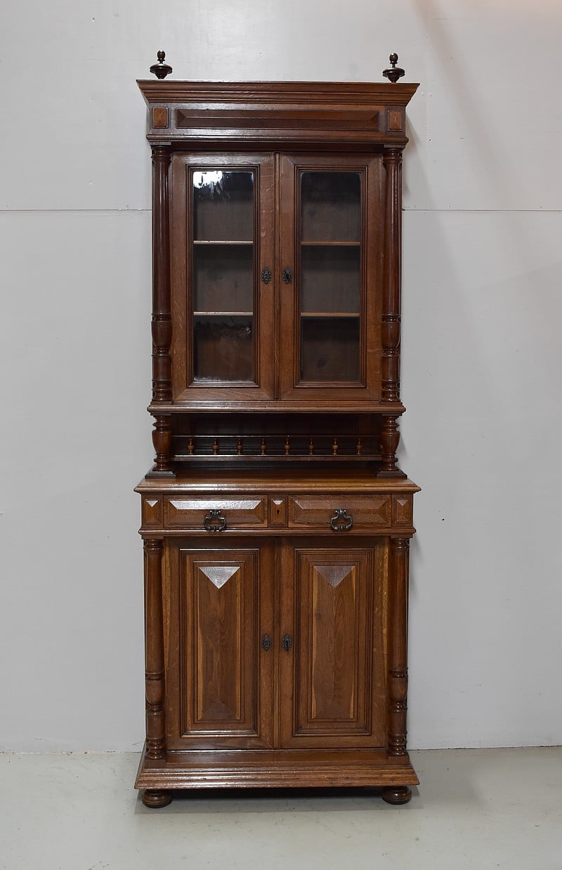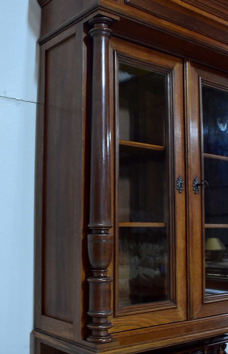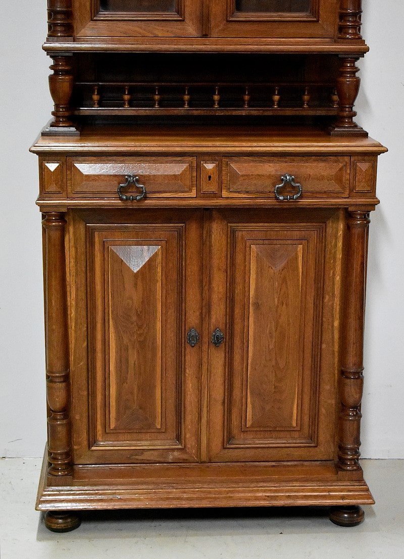 La partie haute à décors de toupies sur sa corniche, ouvre par deux portes vitrées d’origine et fermant à clef, donnant sur deux étagères amovibles posées sur crémaillères.