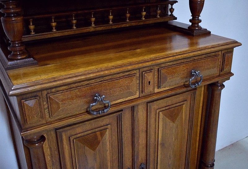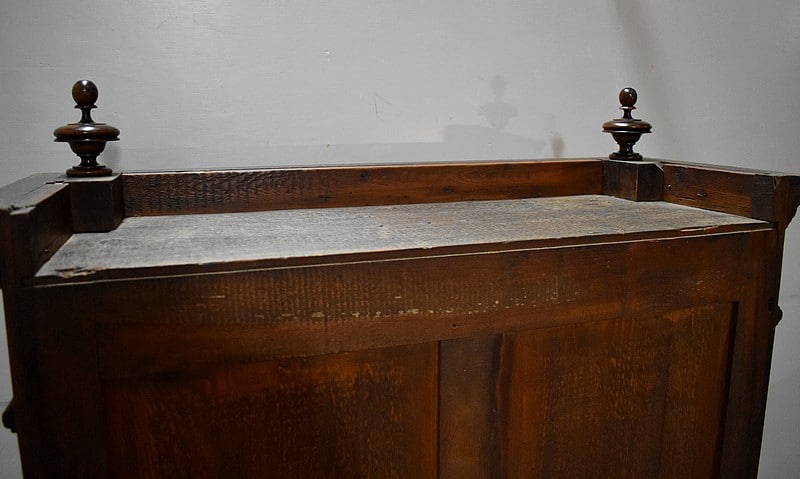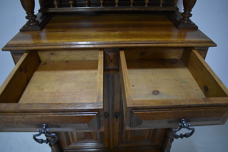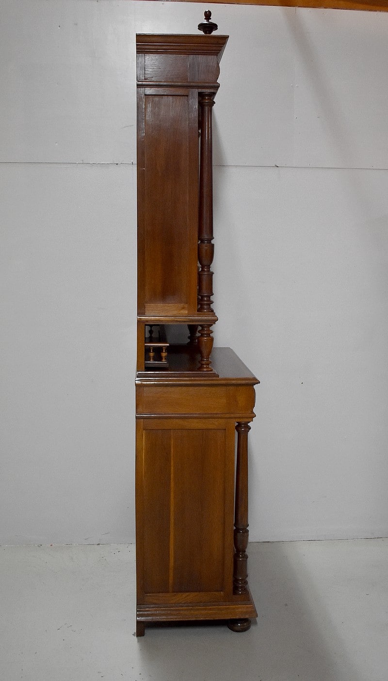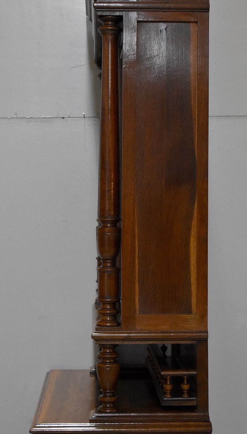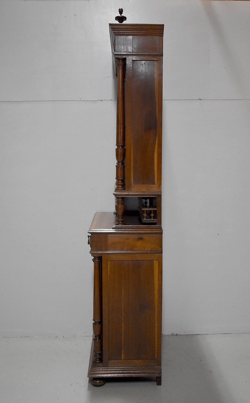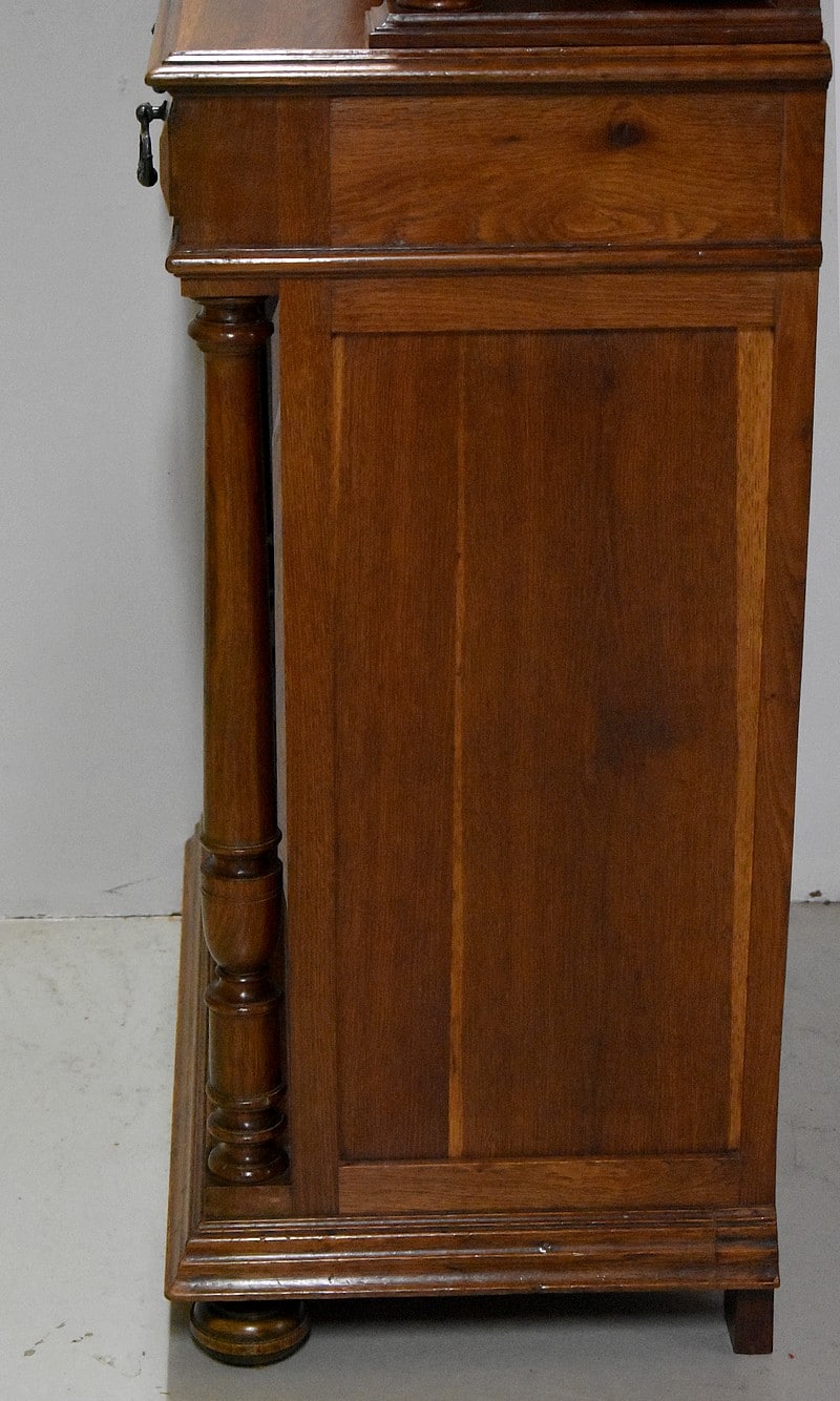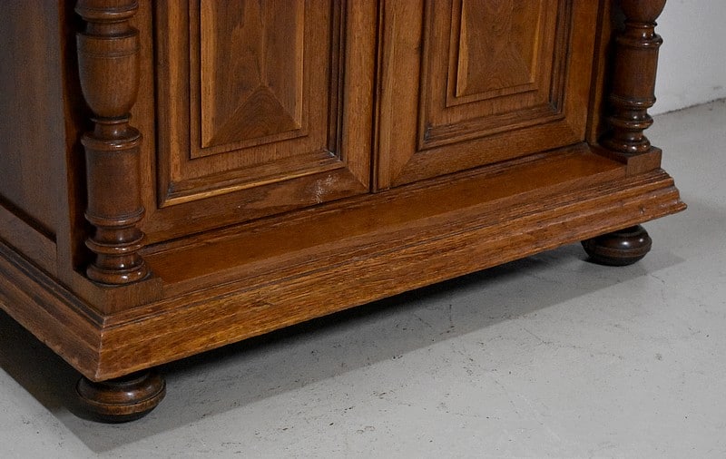 La partie basse également encadrée de deux colonnes détachées faisant écho à la partie haute, ouvre par deux tiroirs moulurés en haut et deux portes pleines panneautées et moulurées donnant sur une étagère posée sur tasseaux fixes, offrant un espace en hauteur de 37 cm au dessus et 33 cm en dessous.