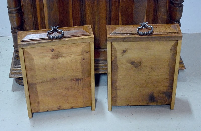 Les deux portes sont encadrées de deux colonnes détachées moulurées et baguées et en dessous, est disposée une petite étagère à épices à décor de balustres.