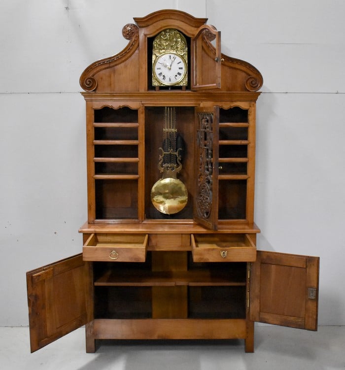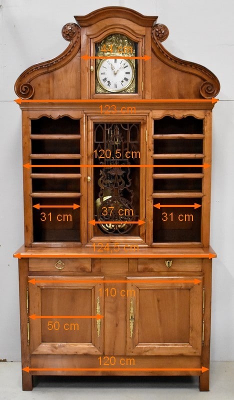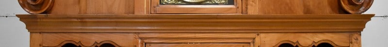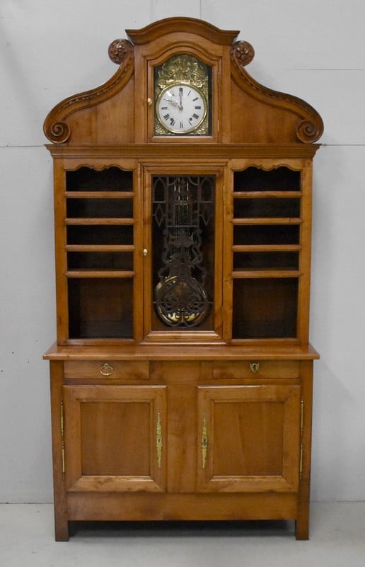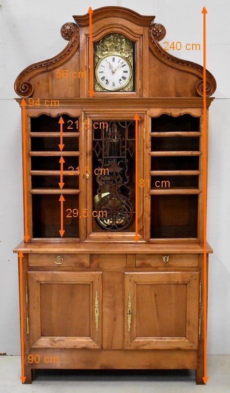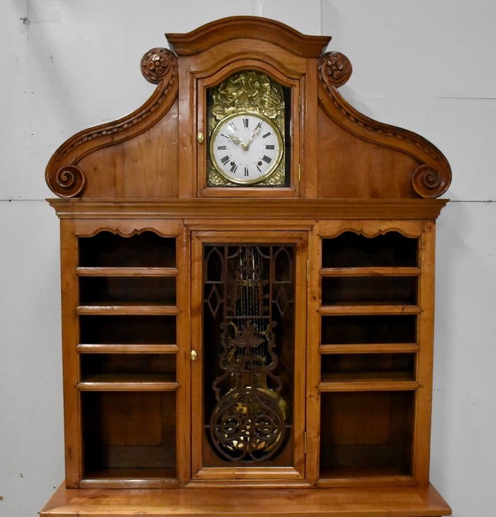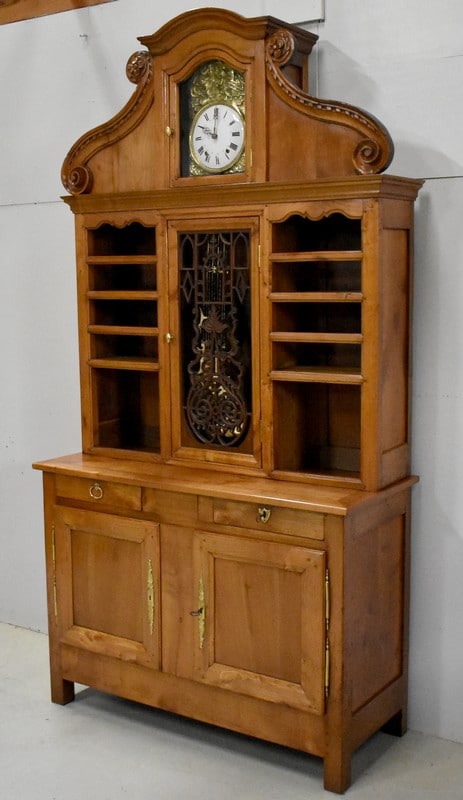 L’origine Vendéenne de ce Buffet Deux Corps le distingue de ses semblables. Nous sommes en présence d’un Meuble Atypique qui combine Bibliothèque, Vaisselier, Buffet et Horloge Comtoise. Le balancement perpétuel de cette dernière donnera Vie à votre intérieur, et rythmera le temps avec une agréable saveur d’Antan.