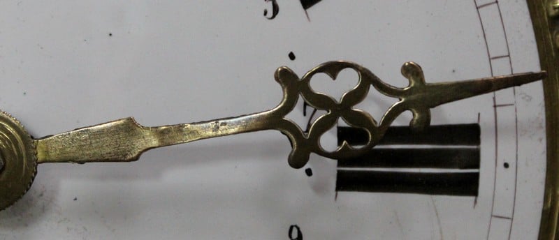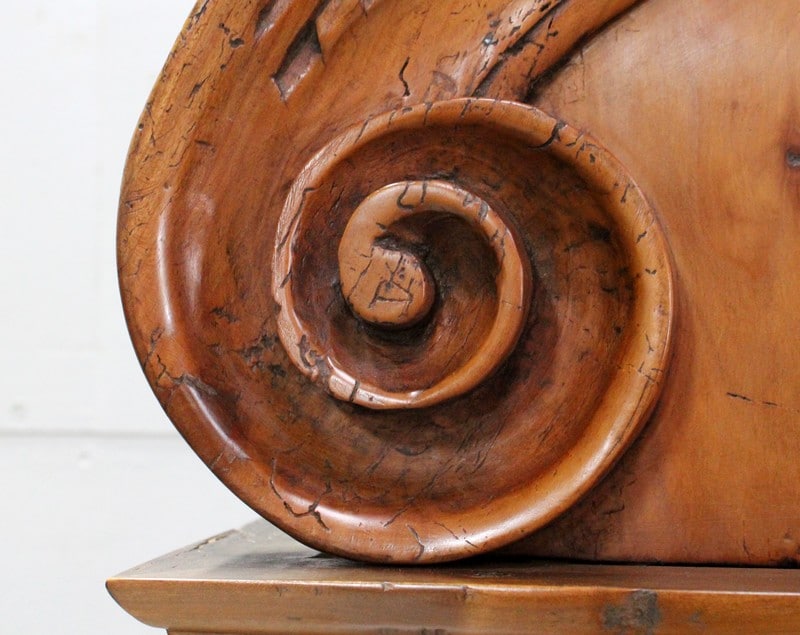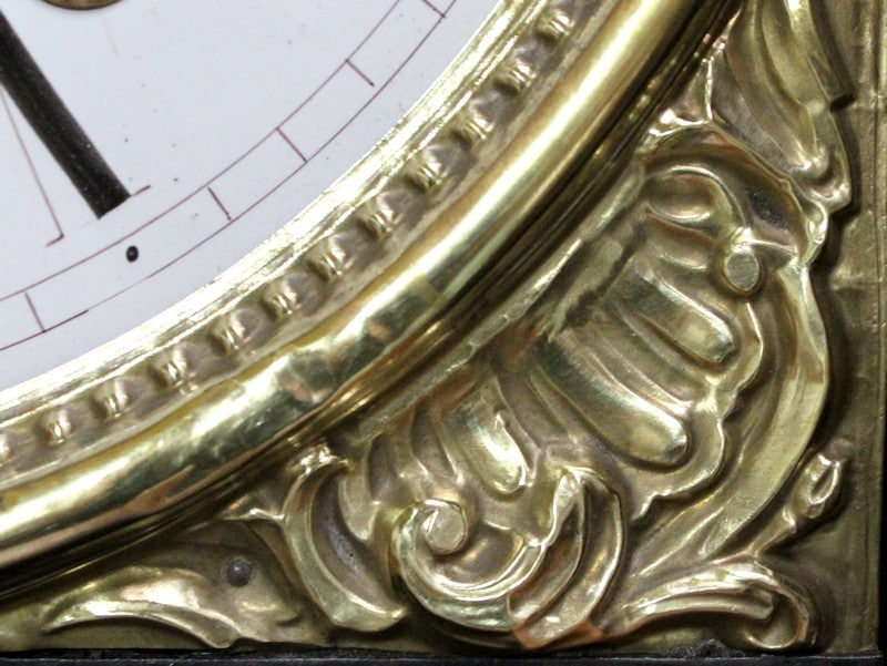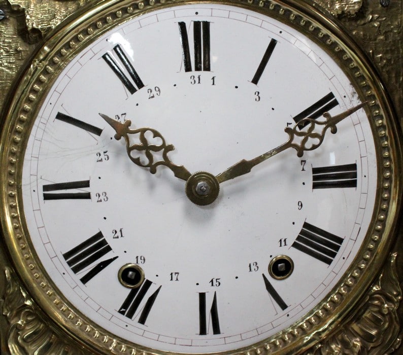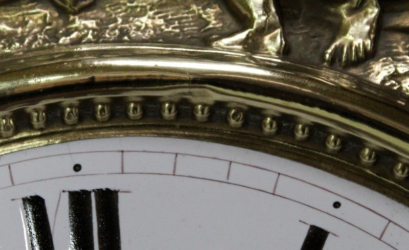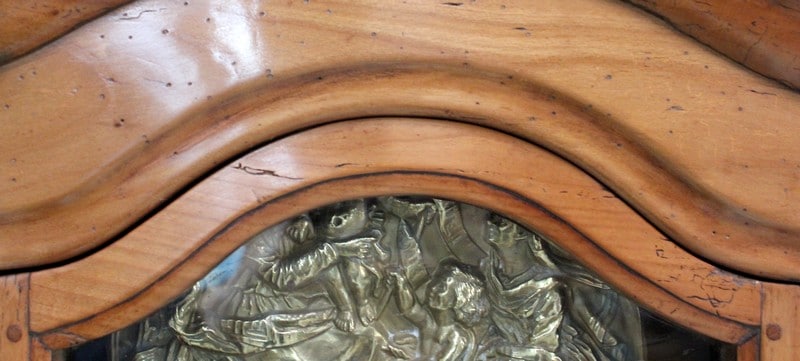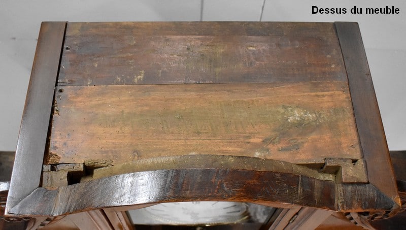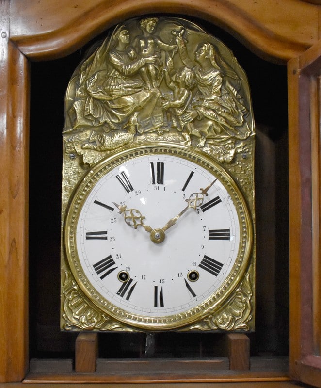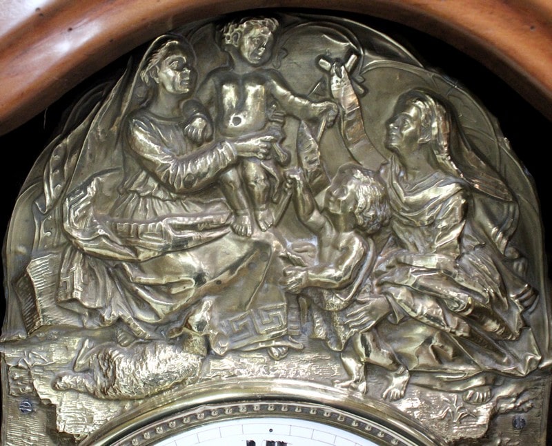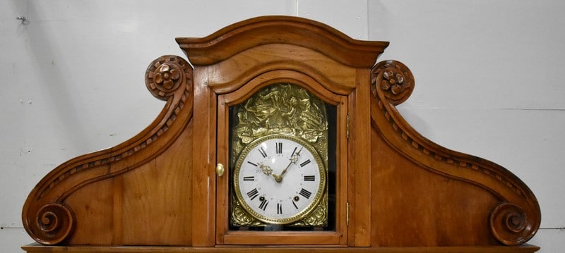 Cet ensemble est sommé d’un Généreux Fronton, avec Consoles Latérales Dentelées et taillées en enroulements. Au centre, une Corniche en Chapeau de Gendarme épouse une petite porte Vitrée renfermant la tête d’Horloge. Cette dernière est enjolivée d’une scène religieuse en Laiton, représentant quatre personnages et un mouton.