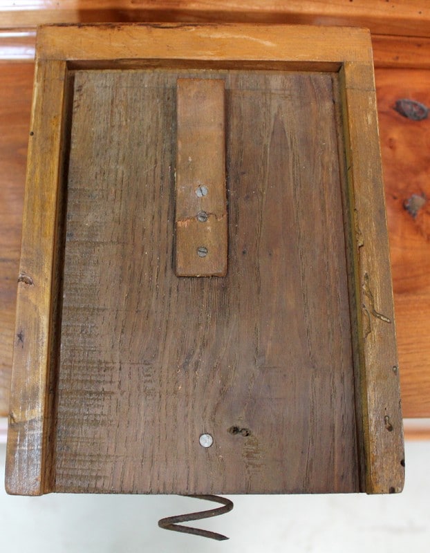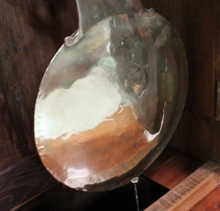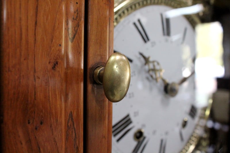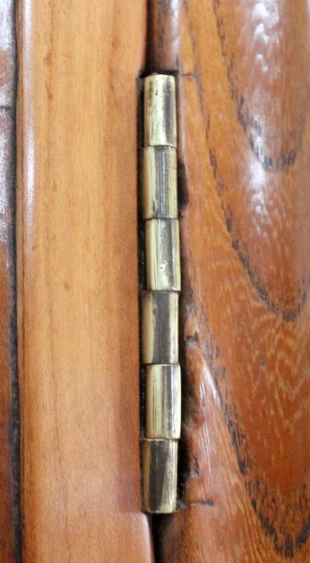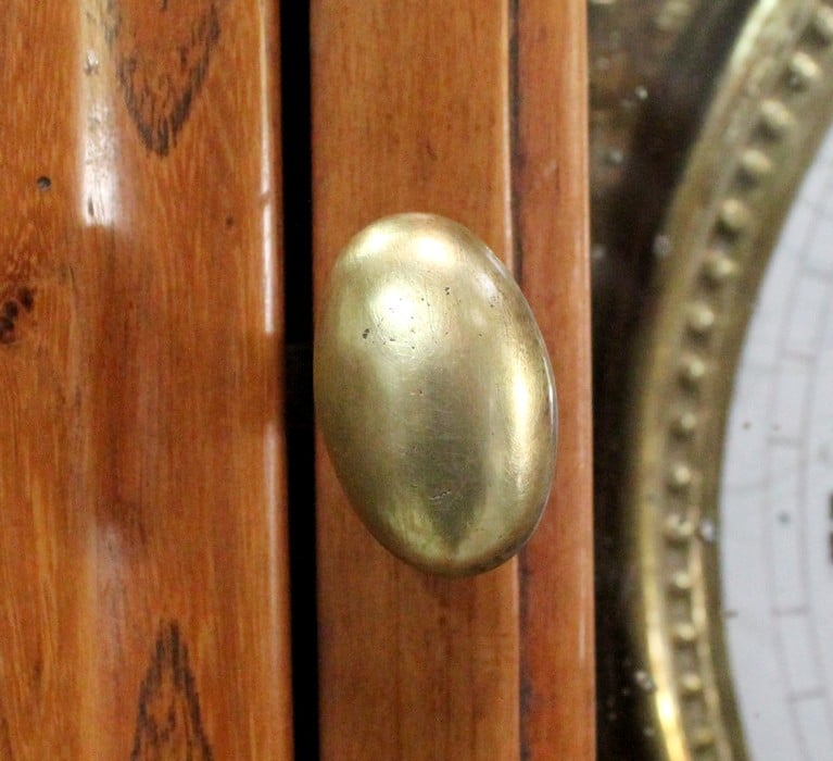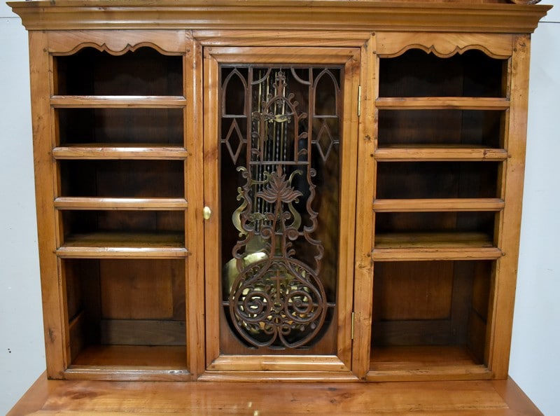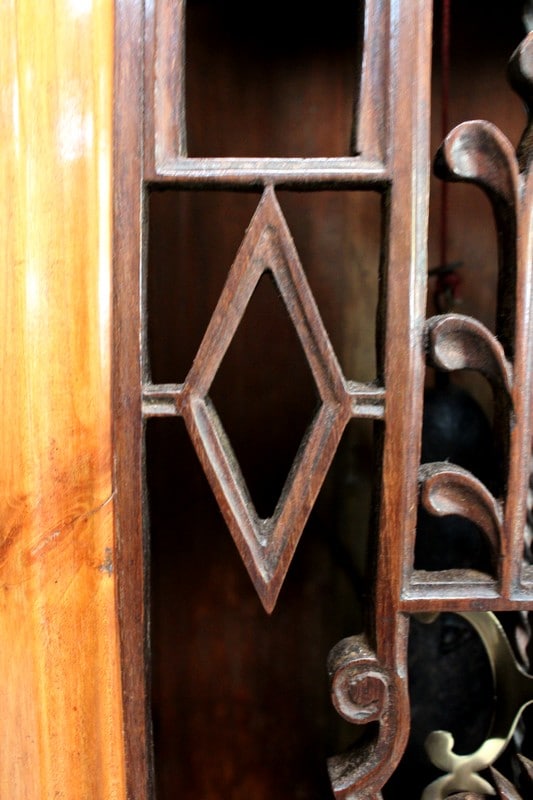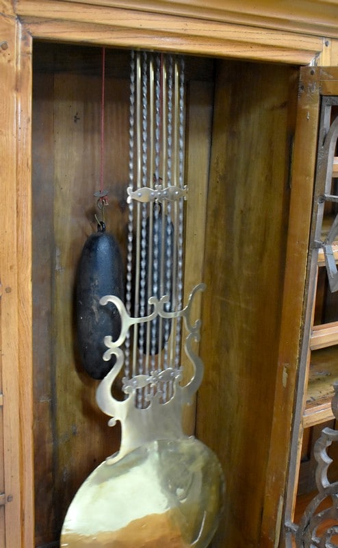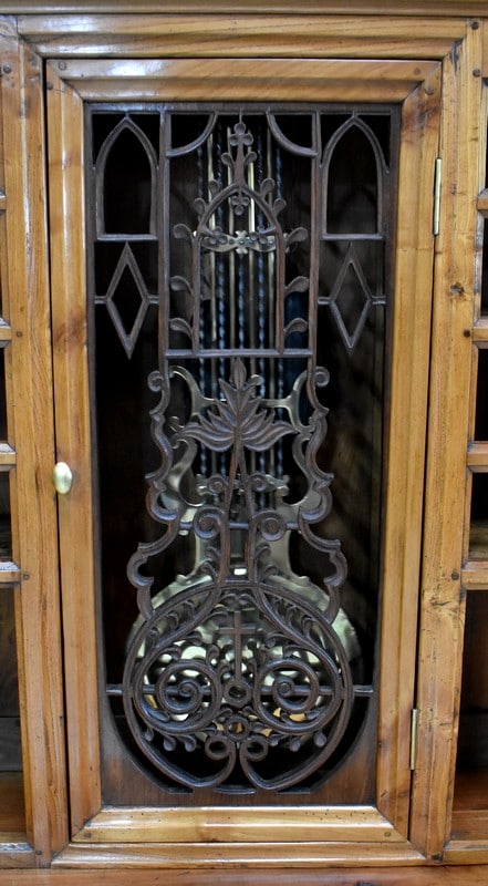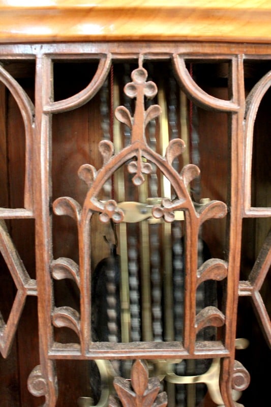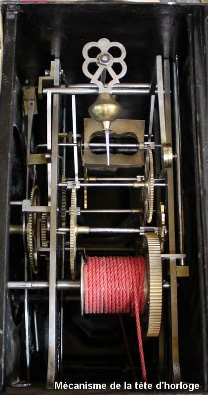 Au milieu, une porte ajourée ouvrant par un bouton en Laiton, est agrémentée d’une Sculpture en Acacia Découpé, représentant les Ogives Catholiques Gothiques. Elle abrite un Balancier à Lyre en Laiton, en état de fonctionnement.