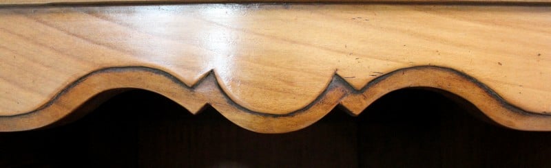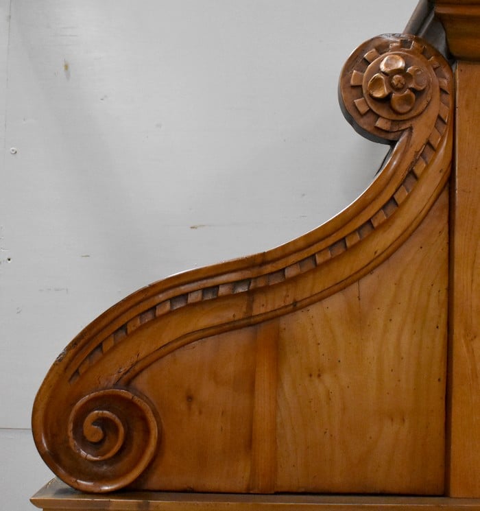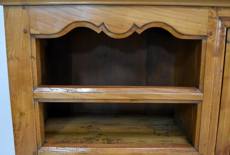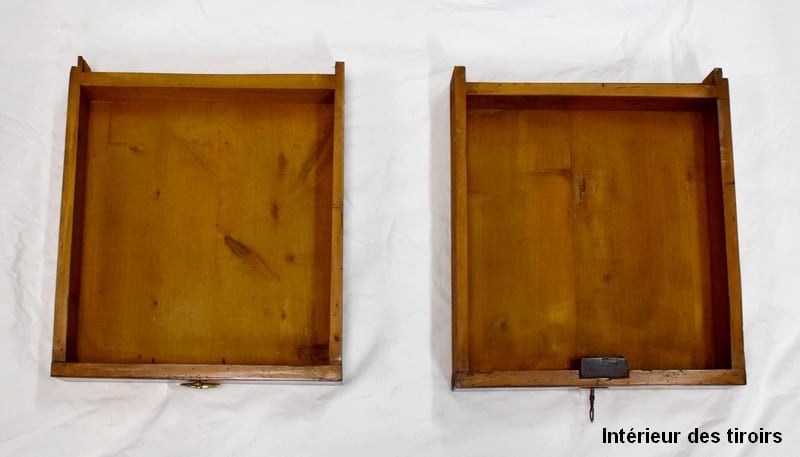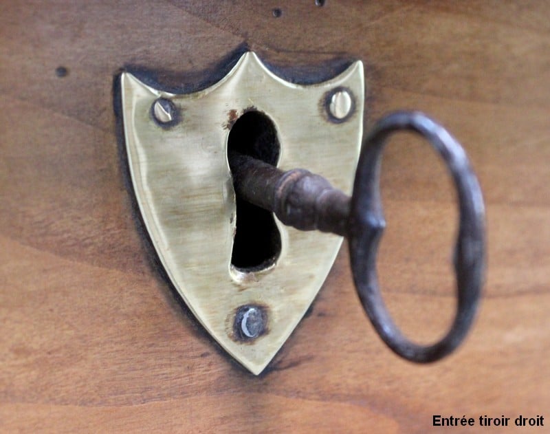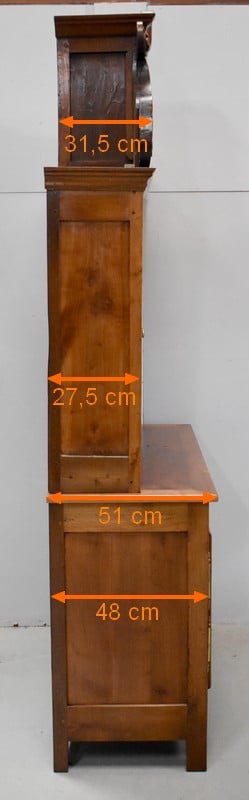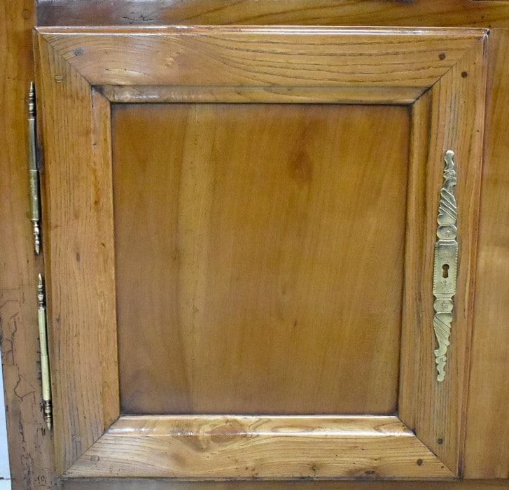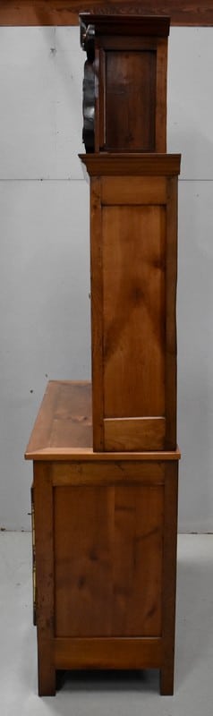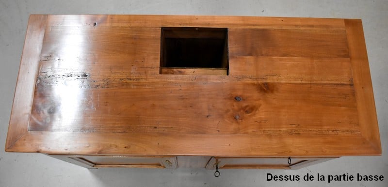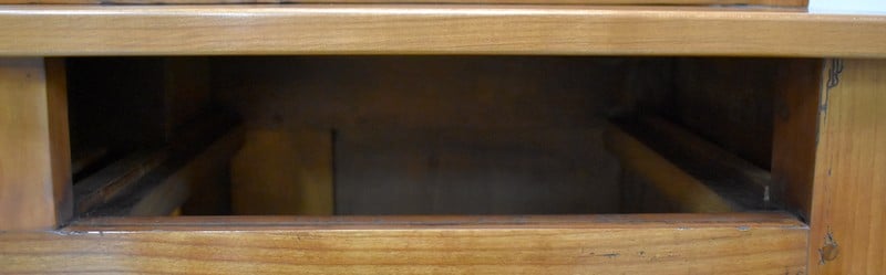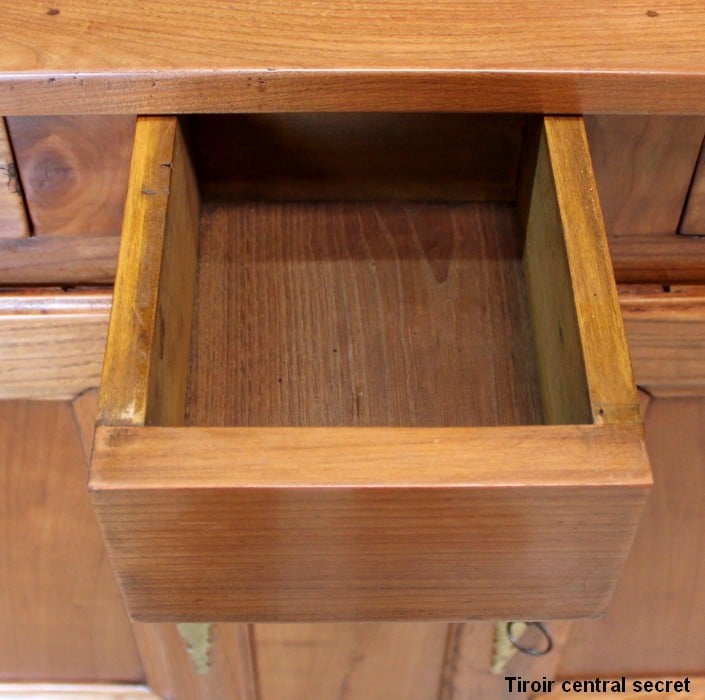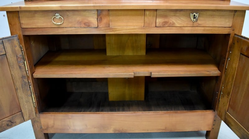 La partie basse de ce Buffet Deux Corps est composée de deux portes avec panneaux en Merisier et encadrements en Frêne. Elles sont pourvues d’entrées en Laiton, et de serrures en état de fonctionnement accompagnées de leurs clefs. L’intérieur est équipé d’une étagère posée sur tasseaux fixes. En ceinture, ce Meuble propose deux tiroirs. Celui de gauche est doté d’une poignée de tirage fixée sur un motif floral, celui de droite d’une entrée de serrure en forme d’écusson. Toutes ces garnitures sont d’Origine. Un dernier tiroir est dissimulé au milieu des deux autres. Il se dévoile à l’aide d’un poussoir accessible depuis l’intérieur de la partie basse.