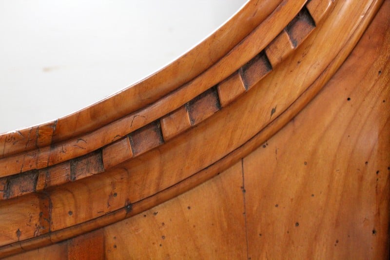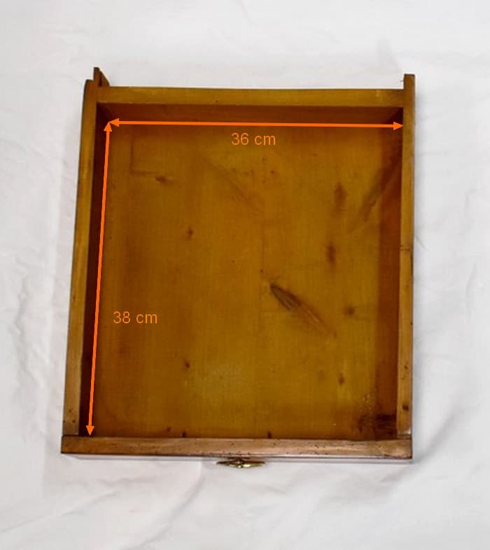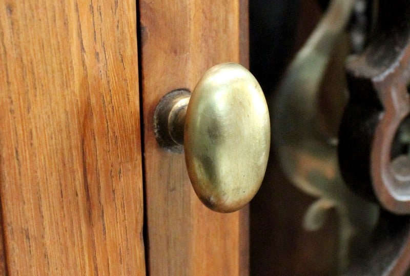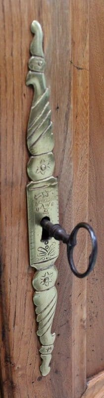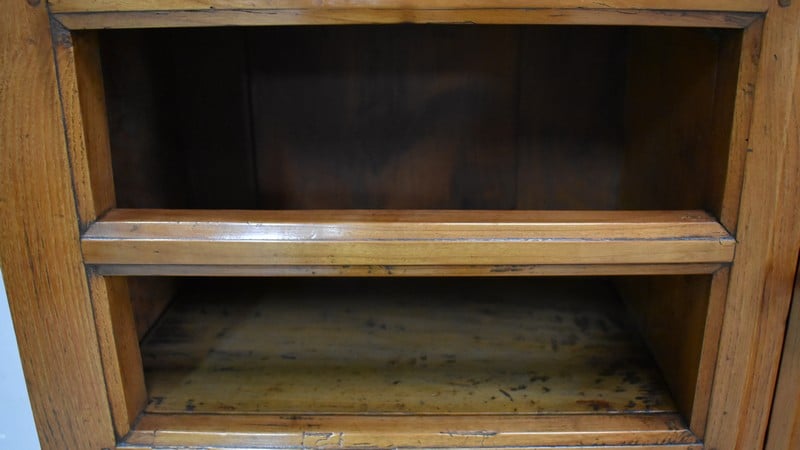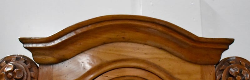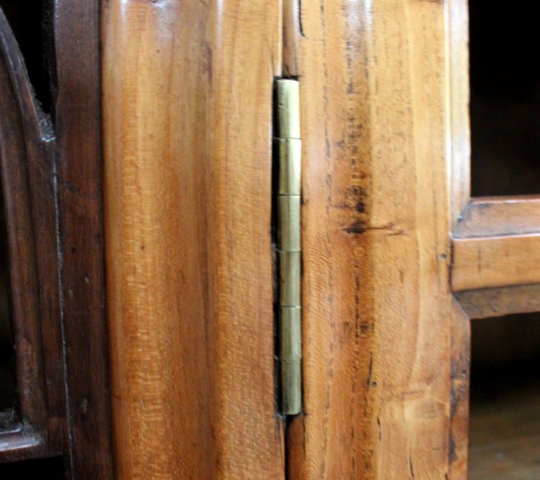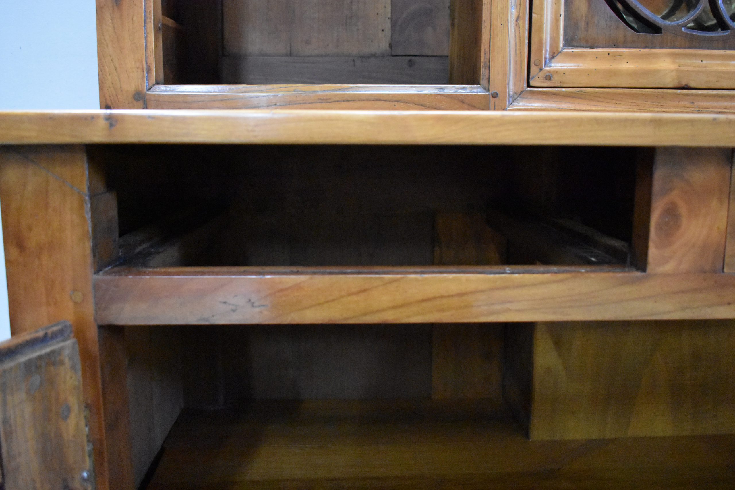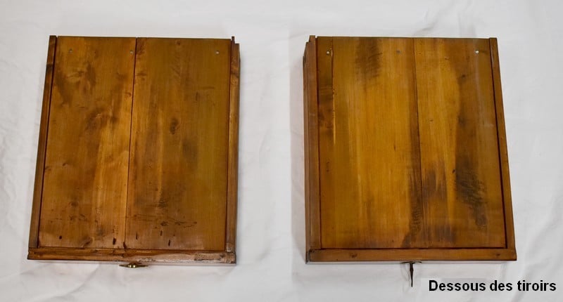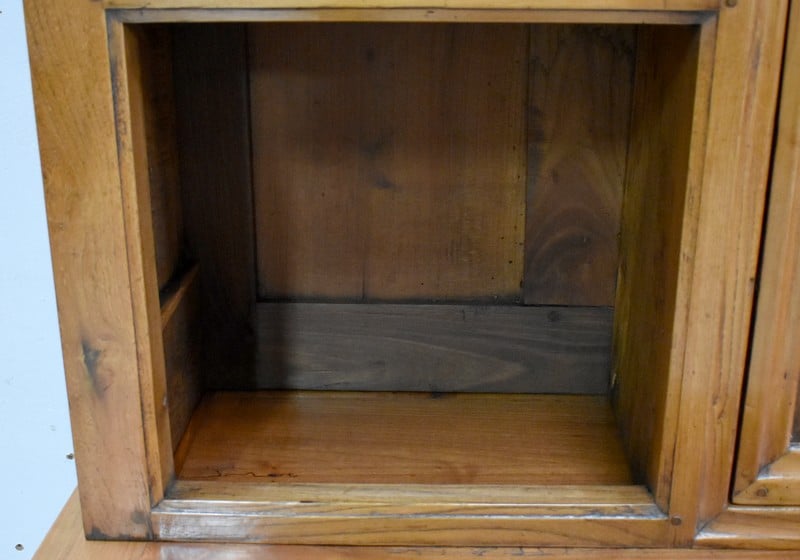 La partie basse de ce Buffet Deux Corps est composée de deux portes avec panneaux en Merisier et encadrements en Frêne. Elles sont pourvues d’entrées en Laiton, et de serrures en état de fonctionnement accompagnées de leurs clefs. L’intérieur est équipé d’une étagère posée sur tasseaux fixes. En ceinture, ce Meuble propose deux tiroirs. Celui de gauche est doté d’une poignée de tirage fixée sur un motif floral, celui de droite d’une entrée de serrure en forme d’écusson. Toutes ces garnitures sont d’Origine. Un dernier tiroir est dissimulé au milieu des deux autres. Il se dévoile à l’aide d’un poussoir accessible depuis l’intérieur de la partie basse.