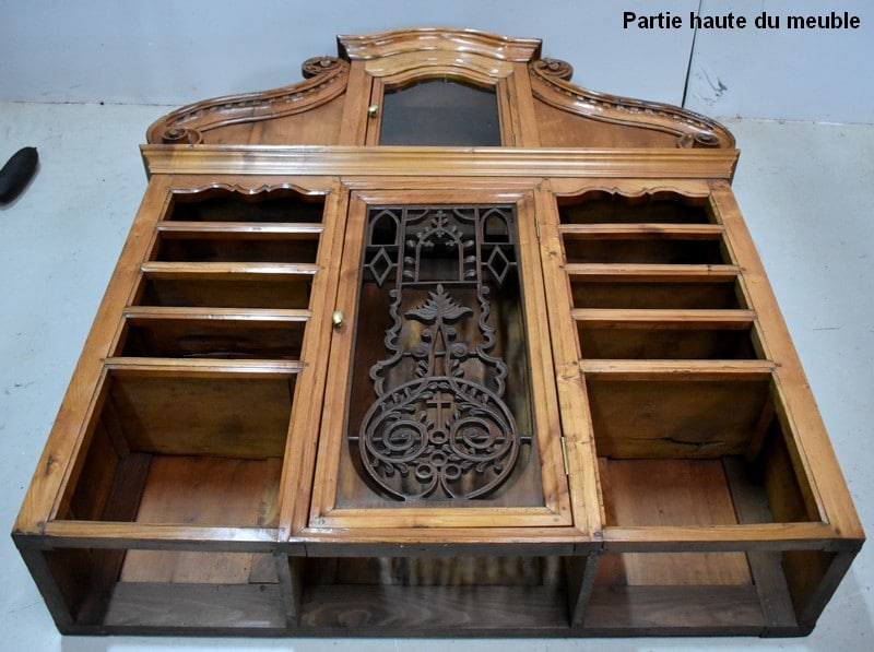 La partie supérieure présente de chaque côté une composition identique, à savoir trois niches : nues pour celles du bas, à barreaux Moulurés pour celles du haut. Leurs encadrements sont également ouvragés, et les traverses hautes sont Chantournées.
