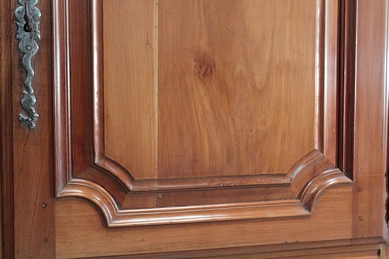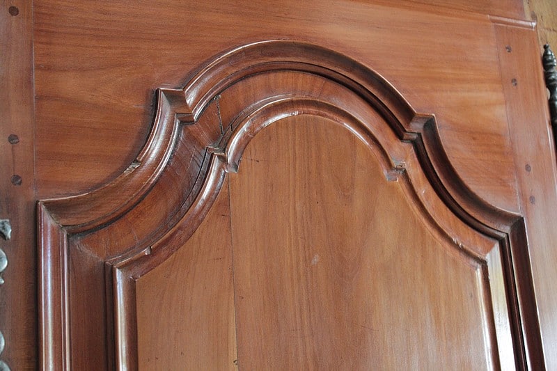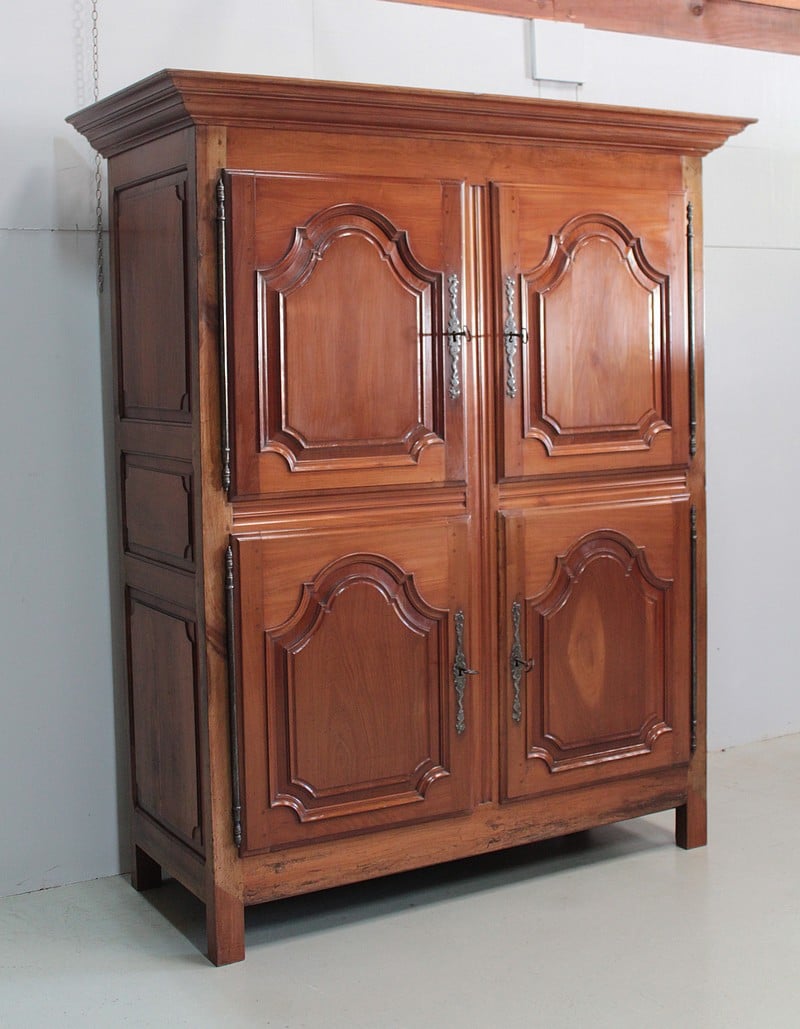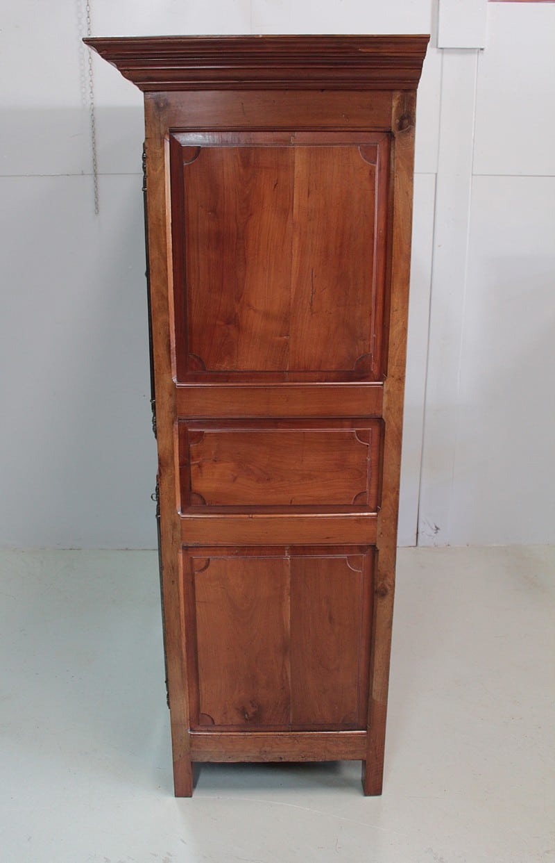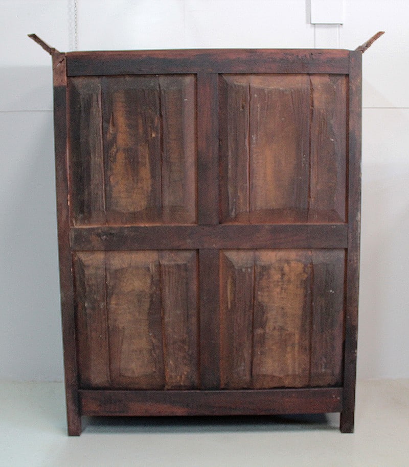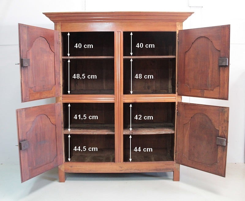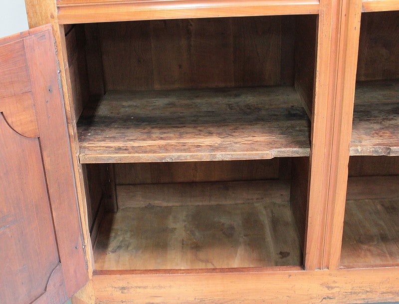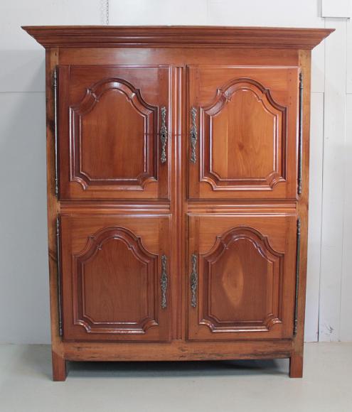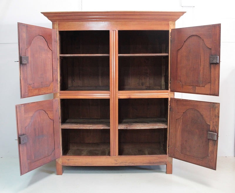 Elle ouvre par 4 portes fermant à clef, à plate-bandes moulurées, et découpées à moulures ressorties témoignant d’un important travail de décaissement. Les systèmes de fermeture et ferrures en fer sont d’origine.