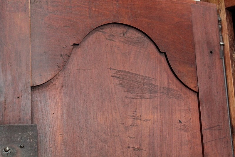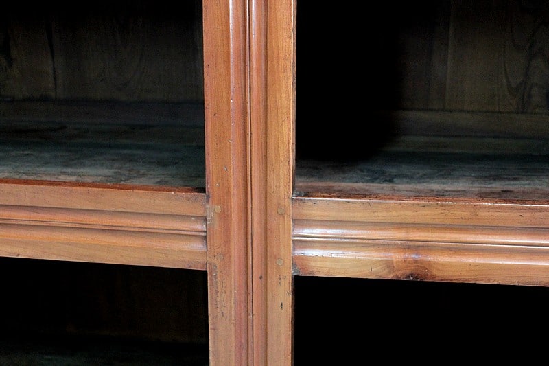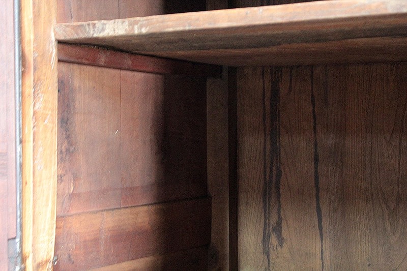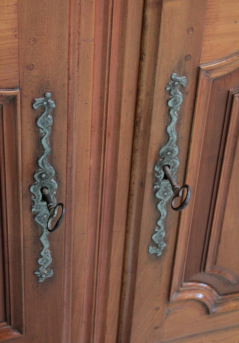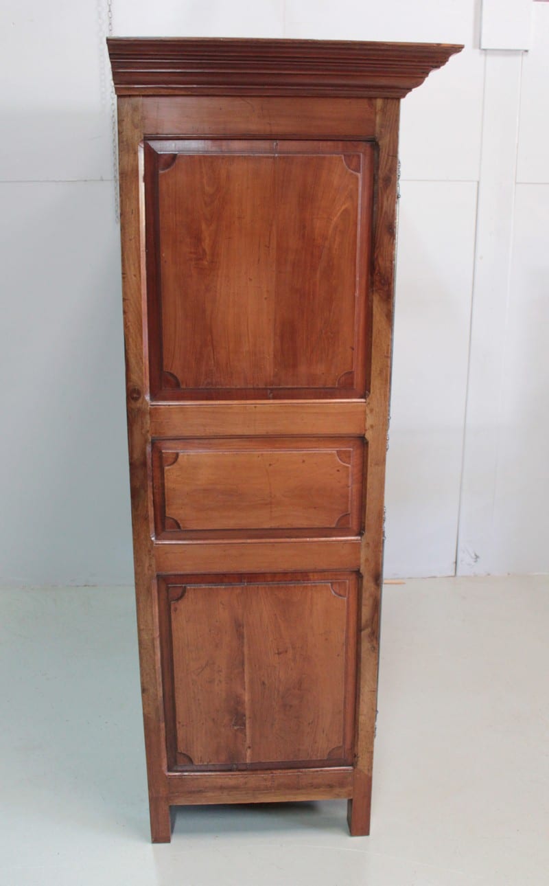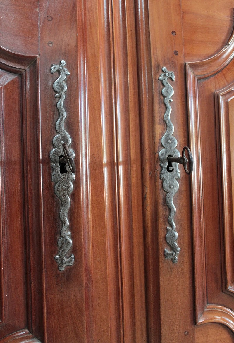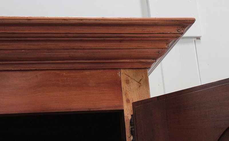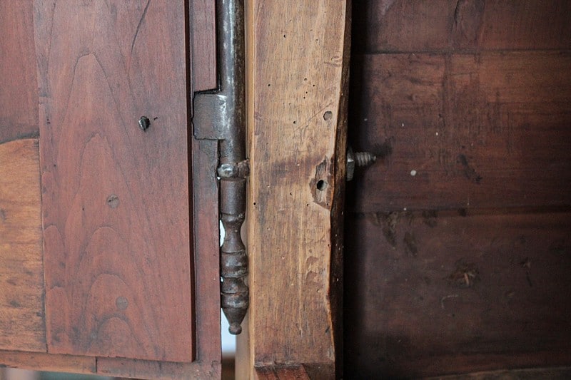 Elle ouvre par 4 portes fermant à clef, à plate-bandes moulurées, et découpées à moulures ressorties témoignant d’un important travail de décaissement. Les systèmes de fermeture et ferrures en fer sont d’origine.