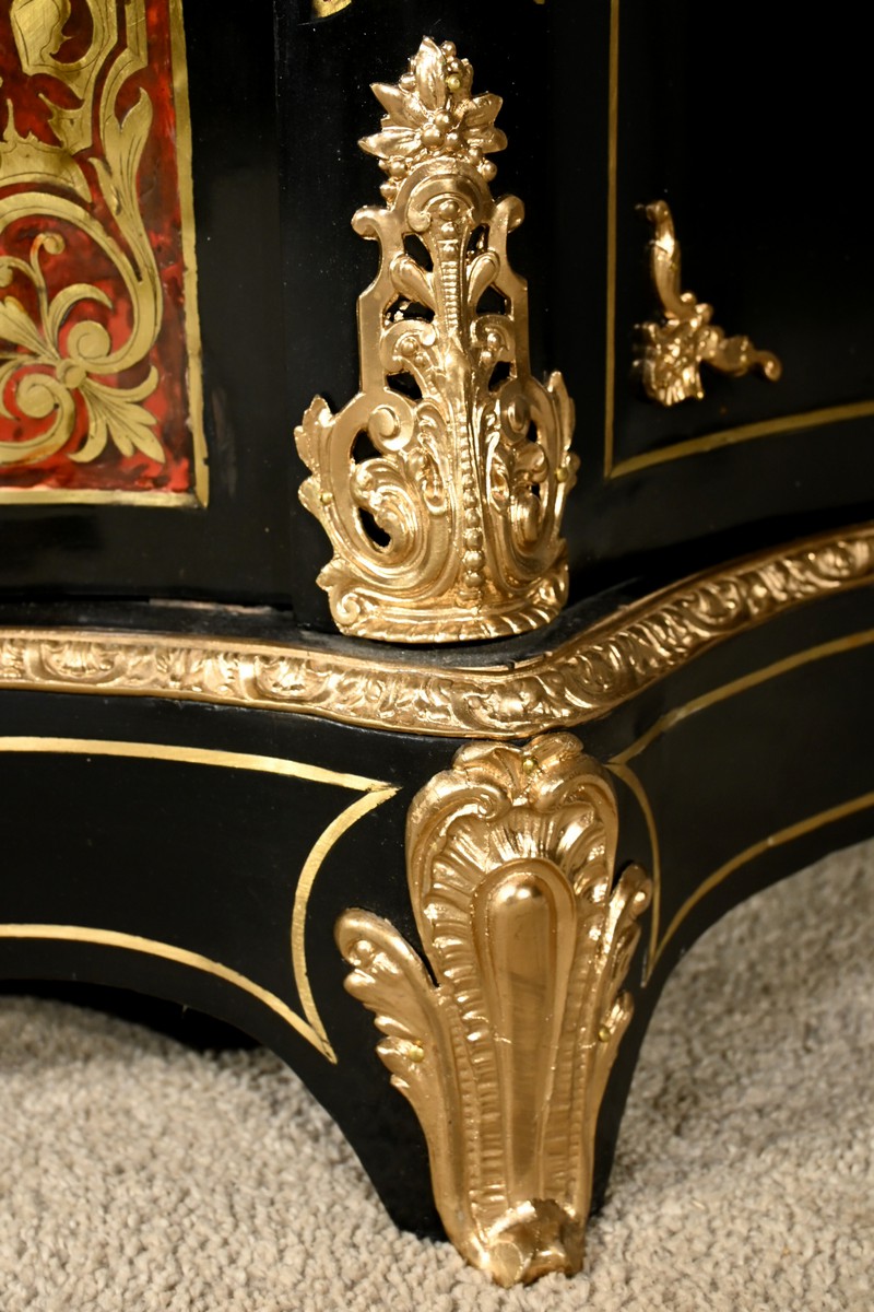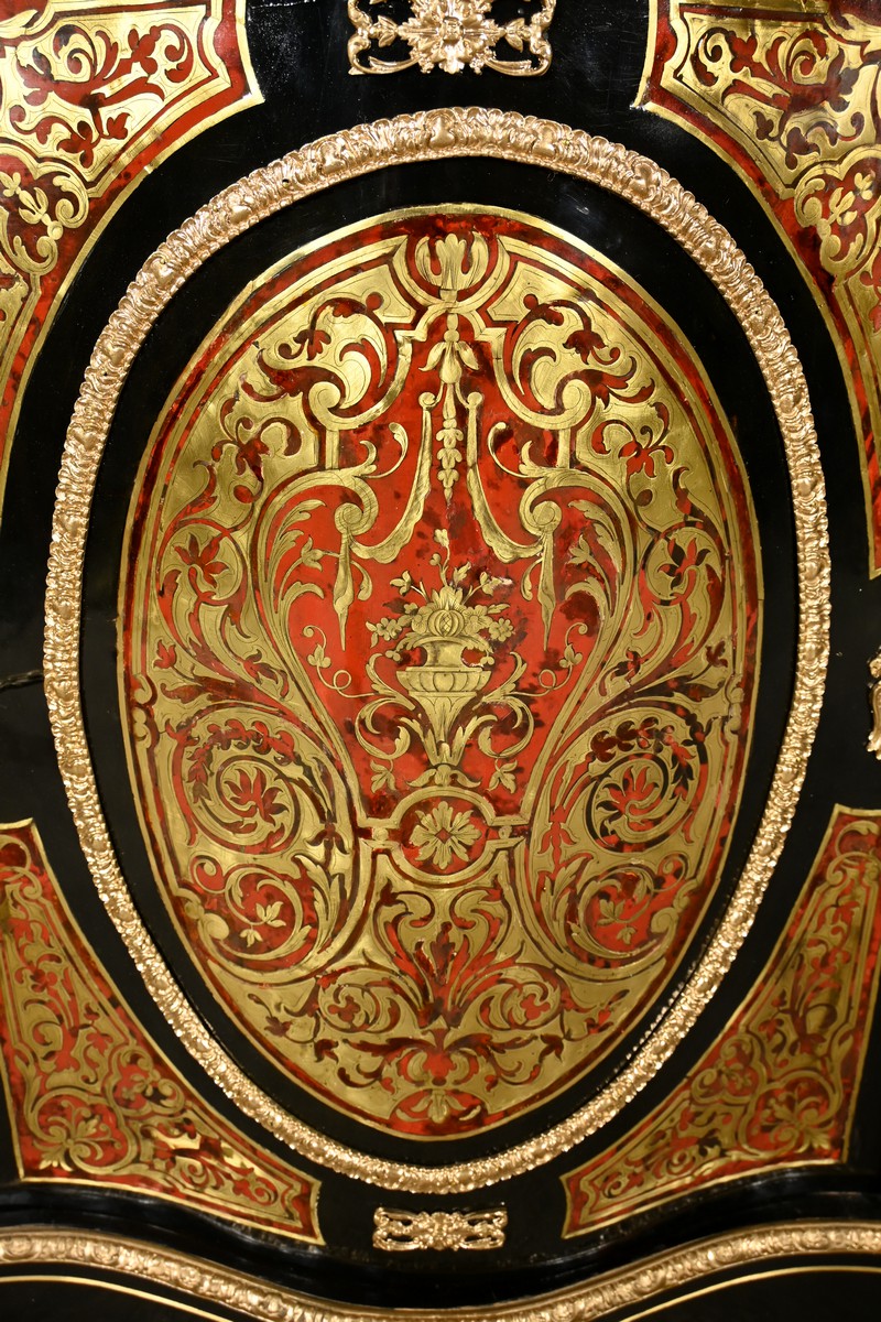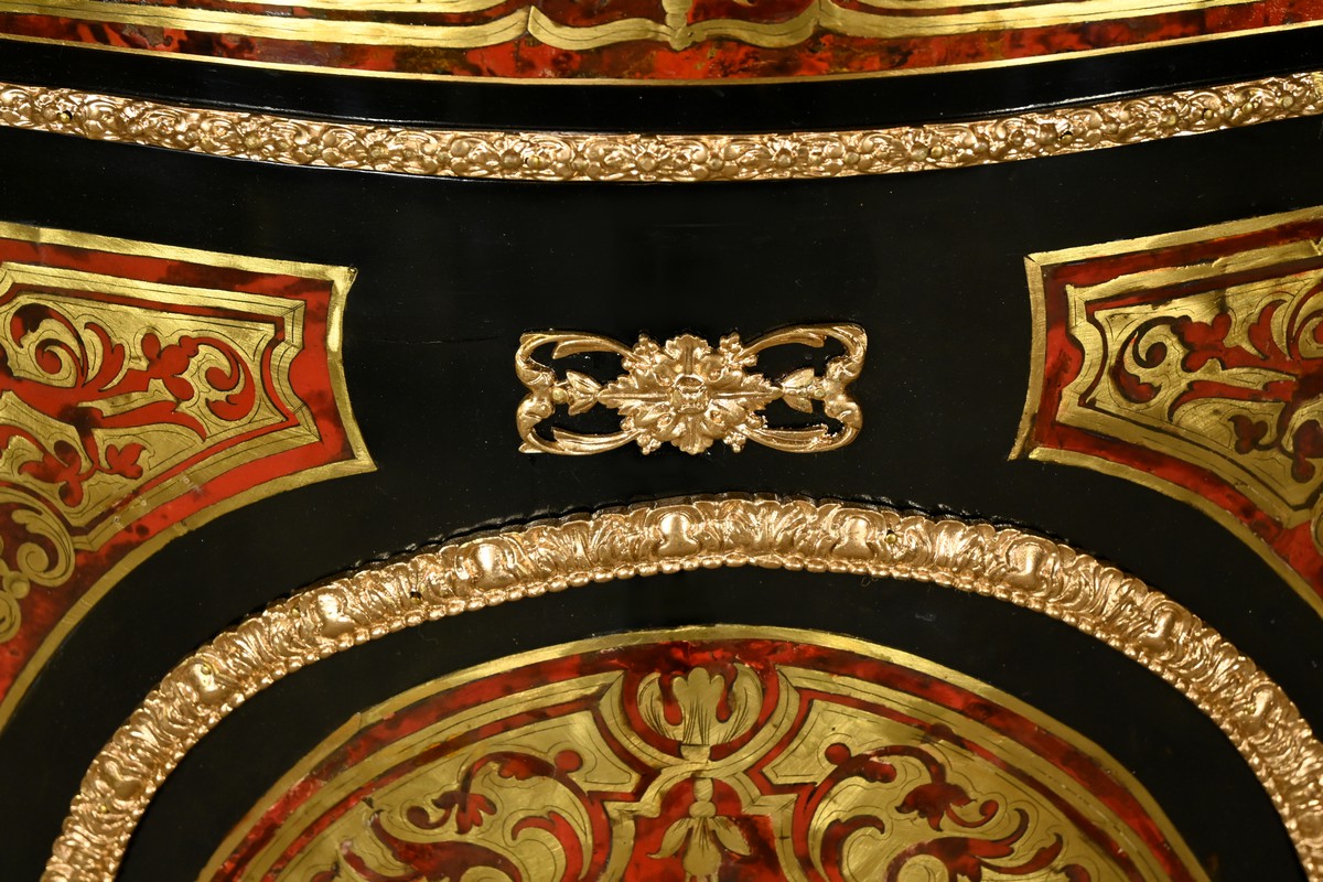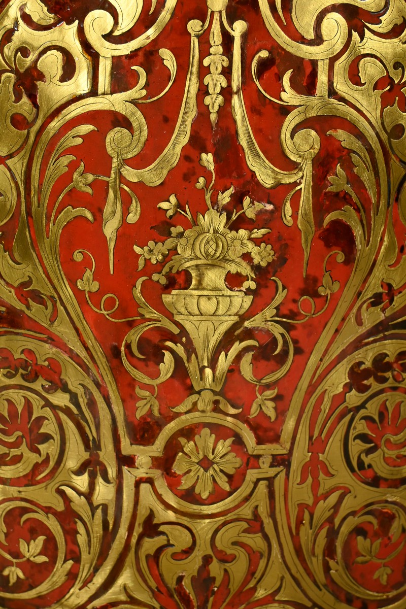 Il se distingue par une porte bombée imposante, intégralement incrustée de volutes en laiton ciselé sur un fond d’écaille de tortue, créant un contraste visuel saisissant et une richesse décorative inégalée.