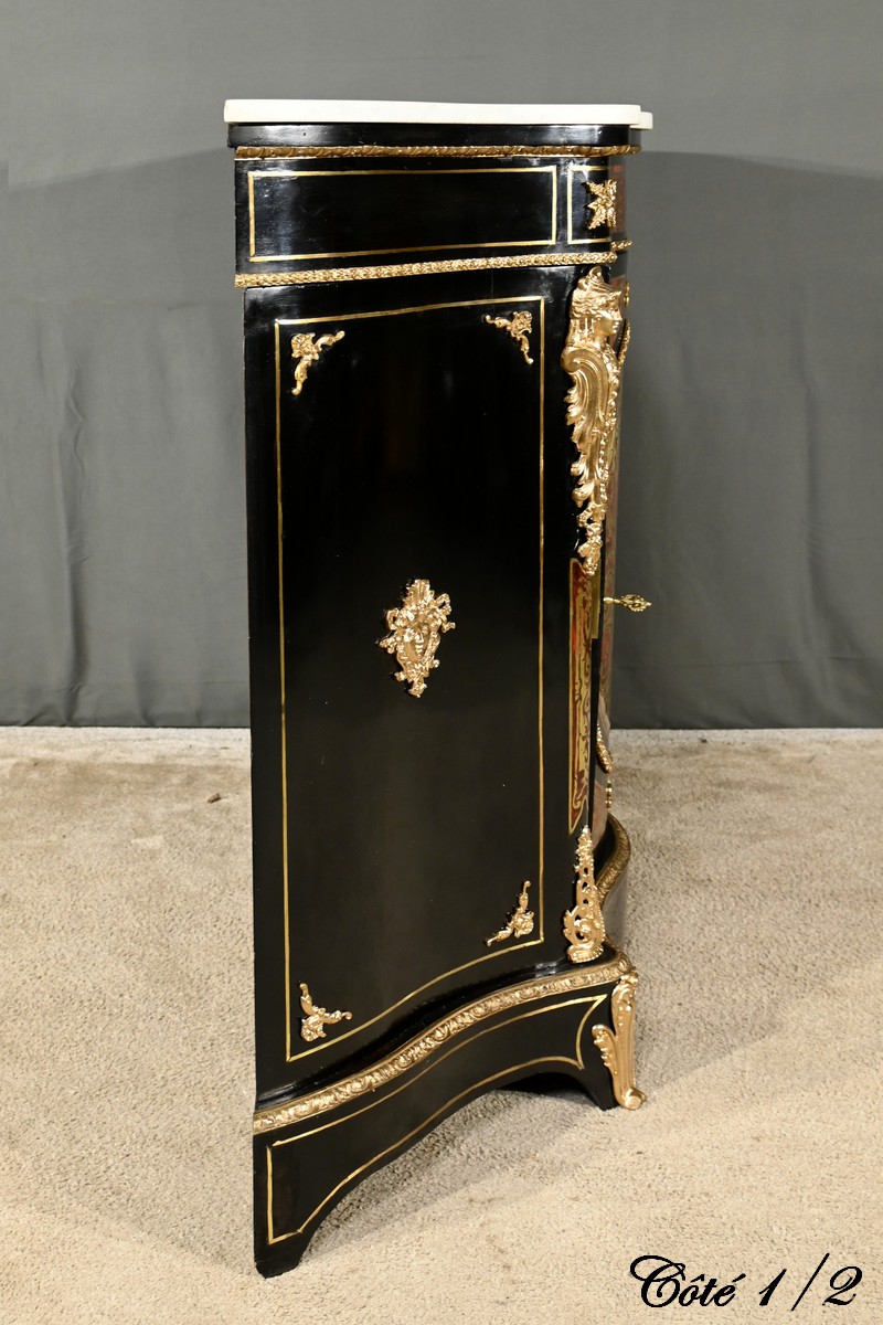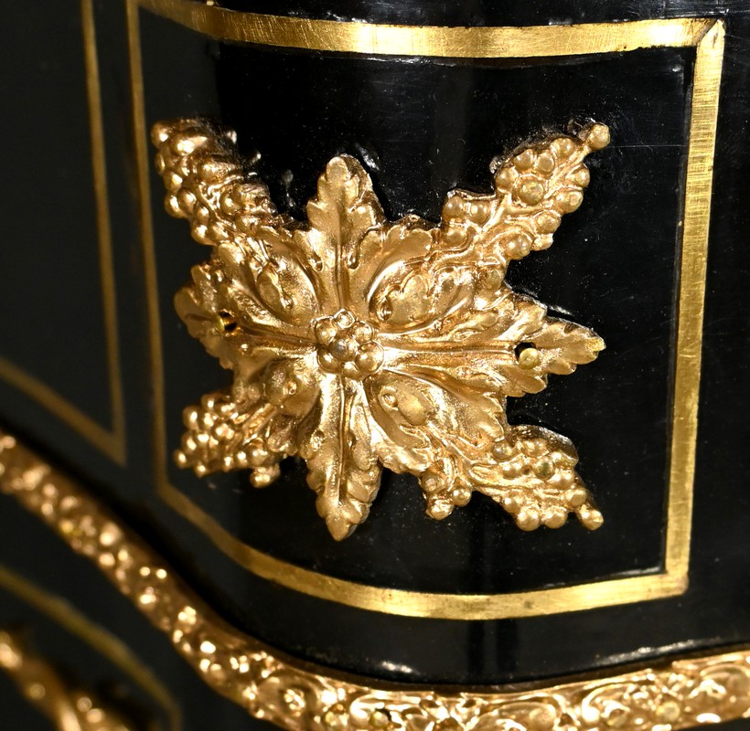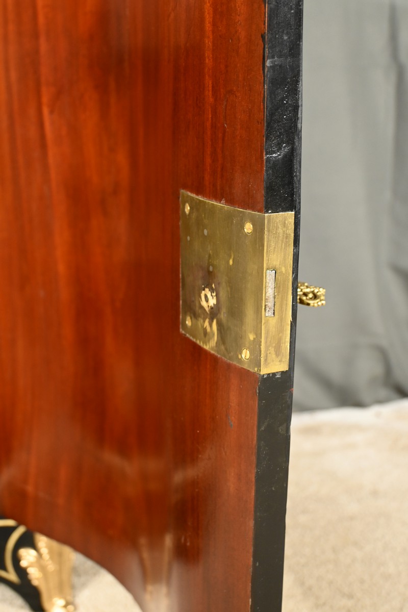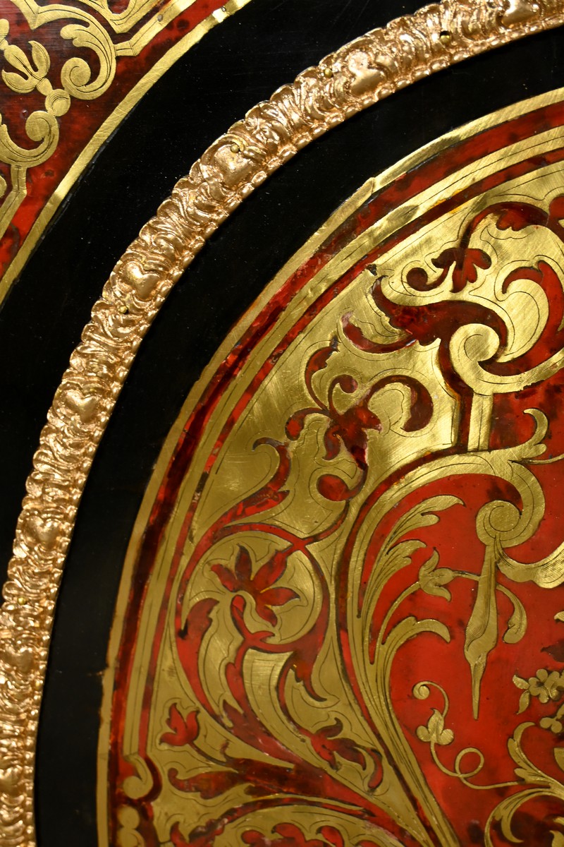 Il se distingue par une porte bombée imposante, intégralement incrustée de volutes en laiton ciselé sur un fond d’écaille de tortue, créant un contraste visuel saisissant et une richesse décorative inégalée.