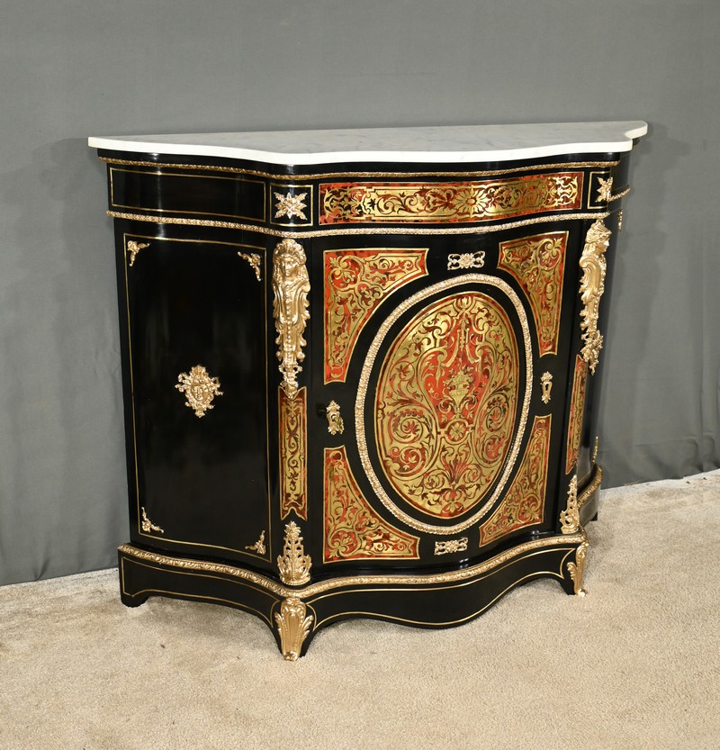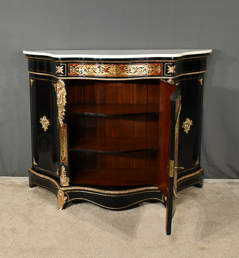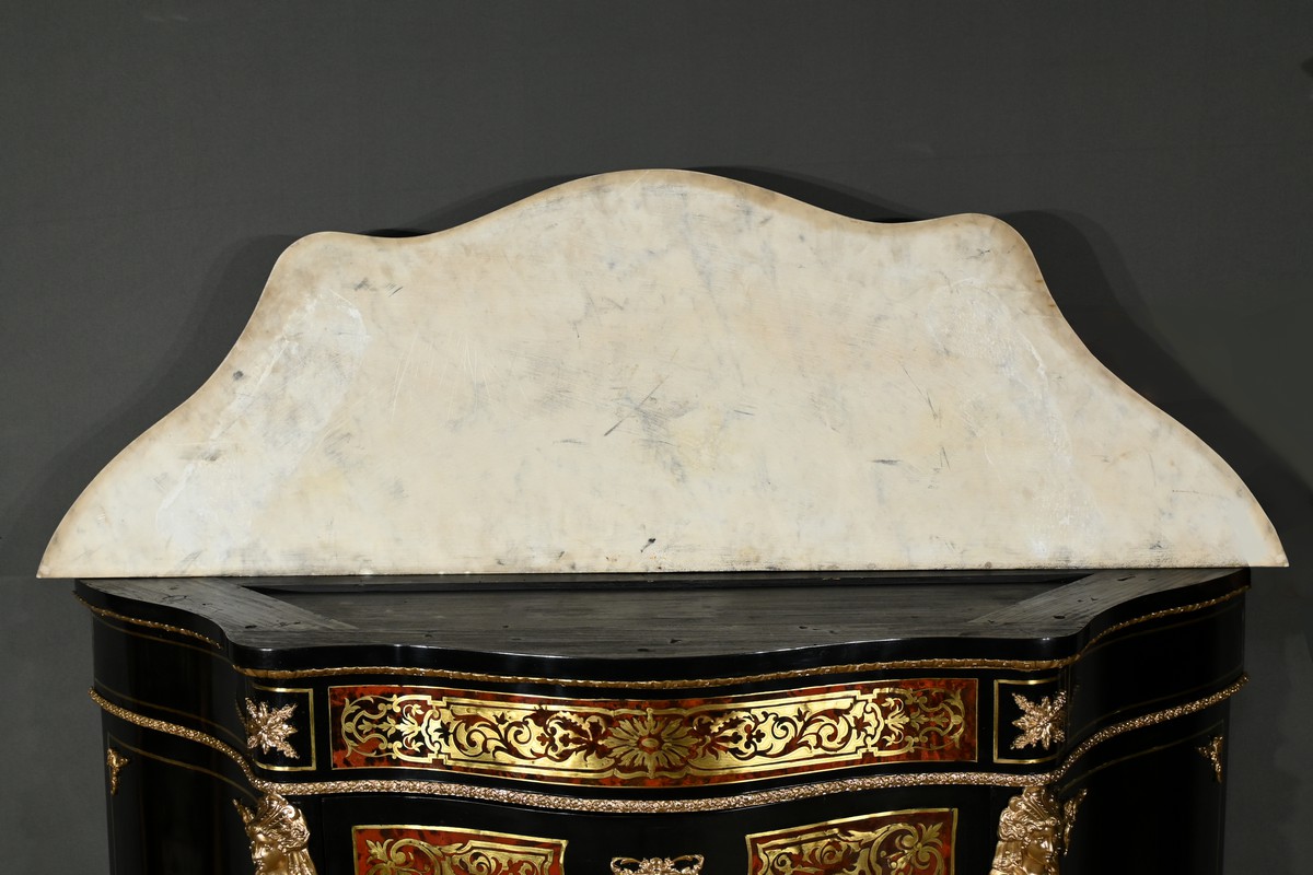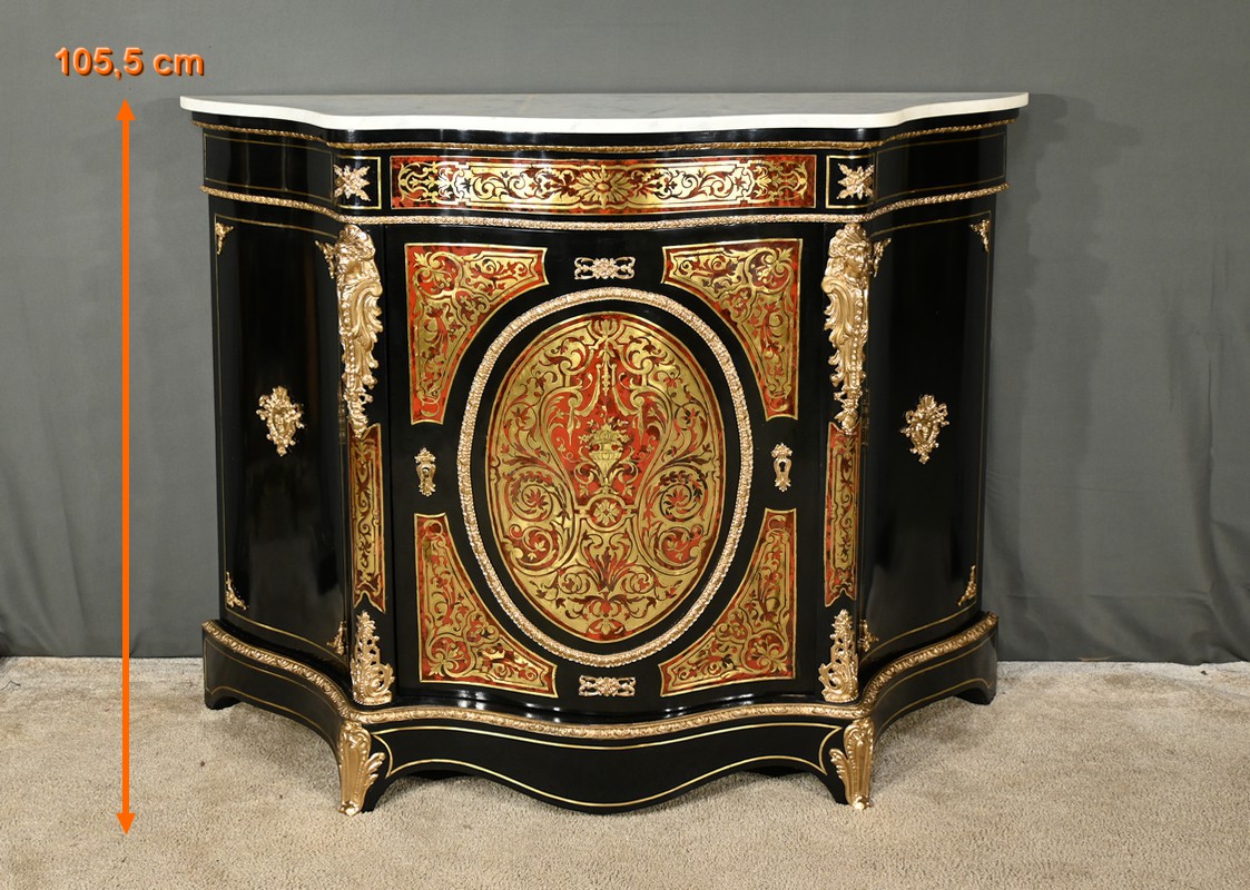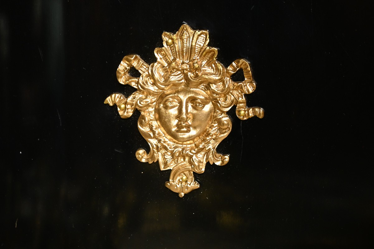 Ce somptueux buffet d’époque Napoléon III, réalisé en poirier noirci au milieu du XIXe siècle, s’inspire des créations magistrales de l’ébéniste de Louis XIV, Charles André Boulle.