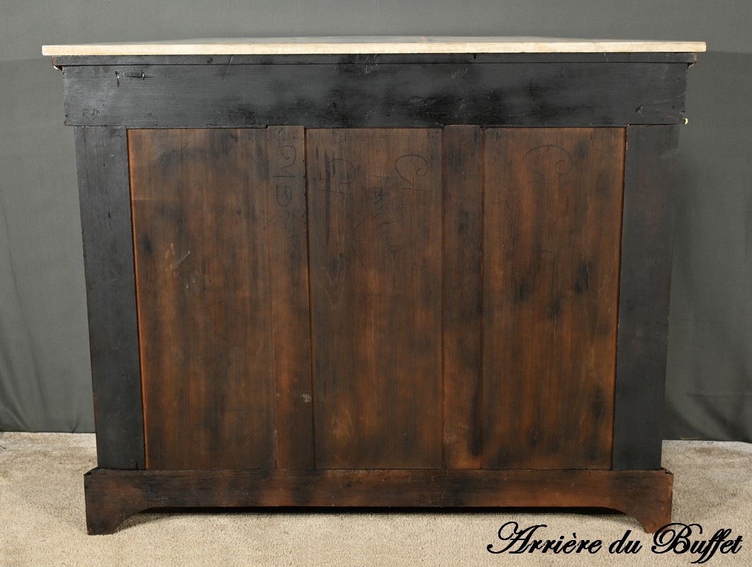 Le dessus du buffet est en marbre de Carrare, suivant parfaitement les lignes sinueuses du meuble, et ajoutant une touche de noblesse et de durabilité.