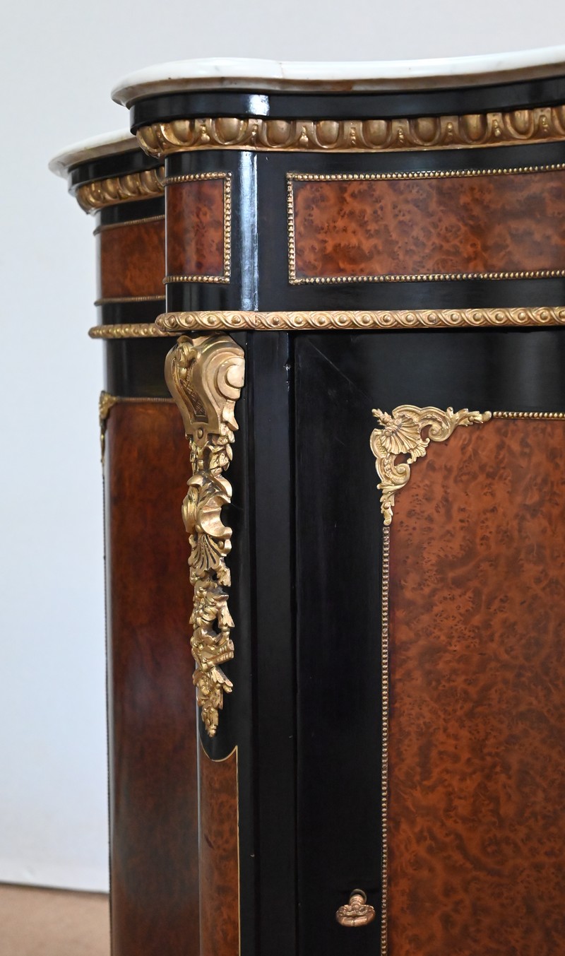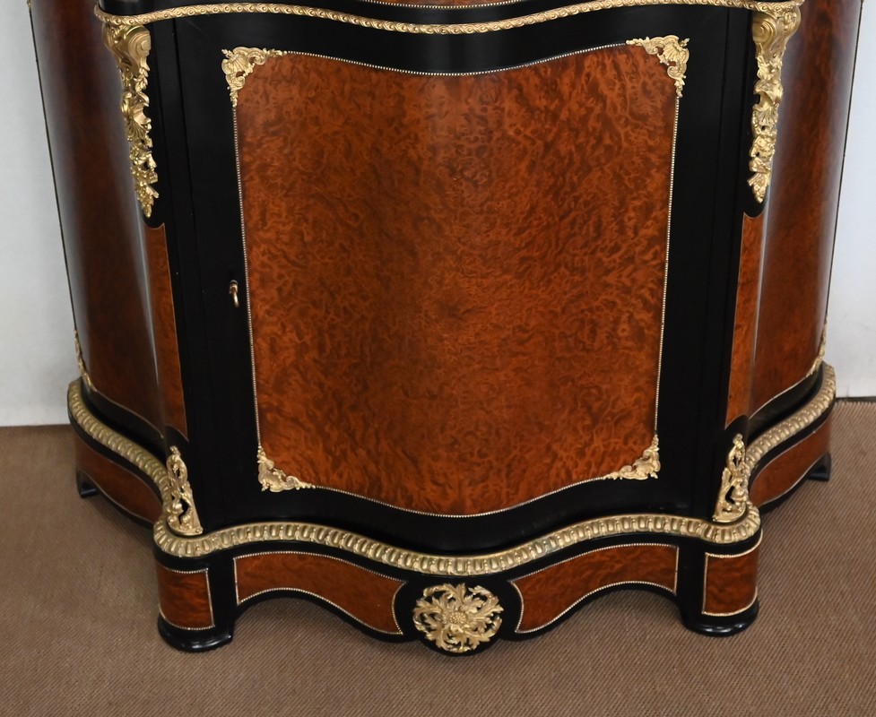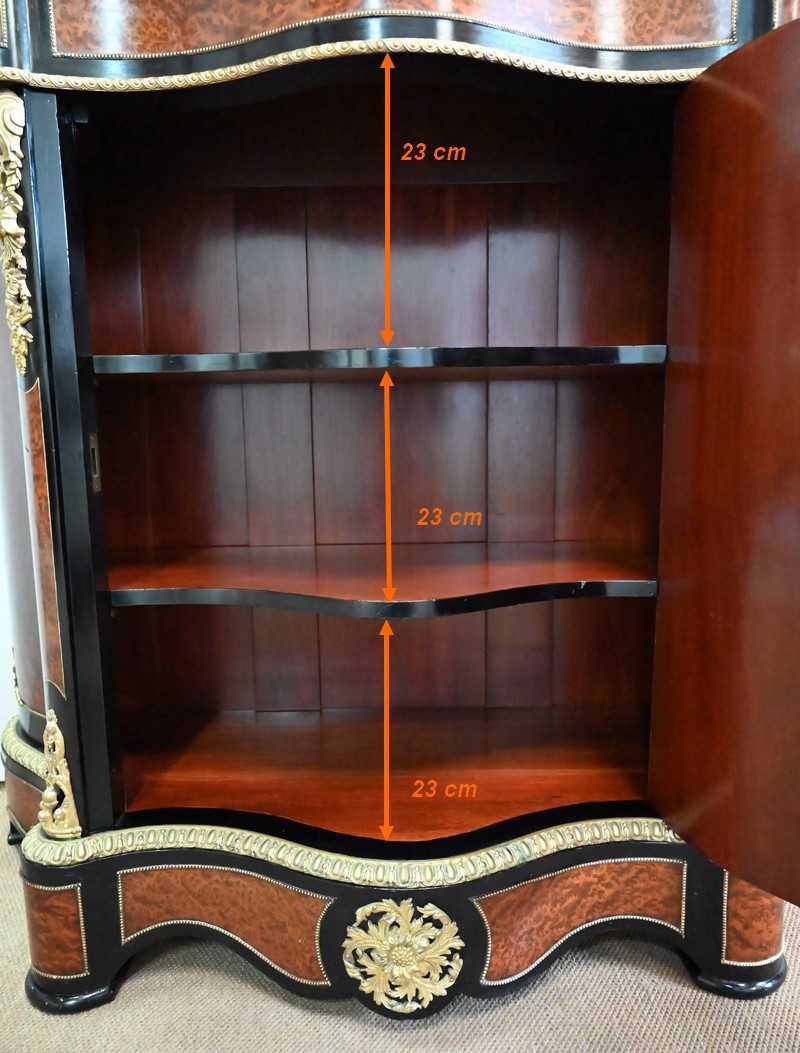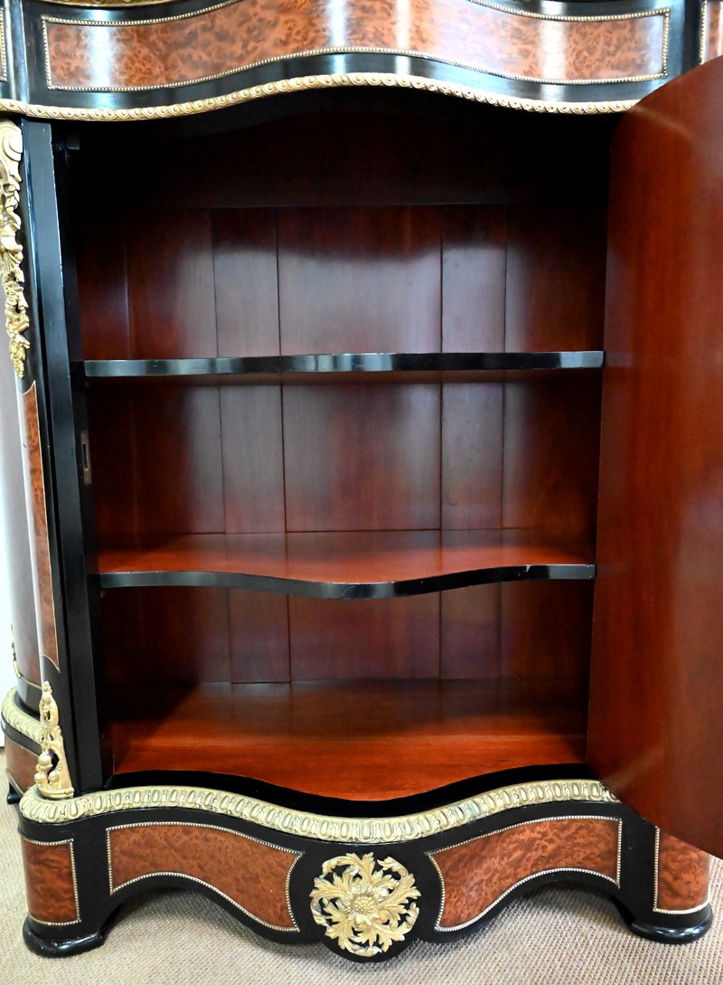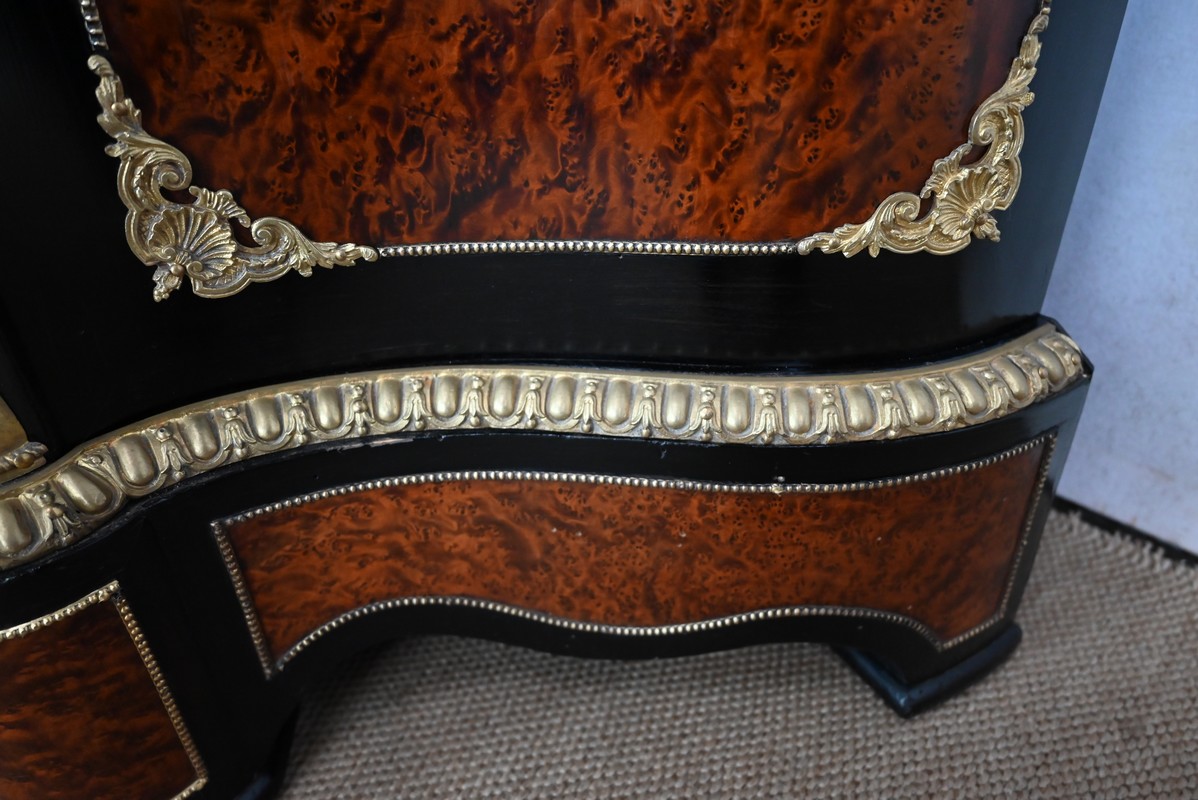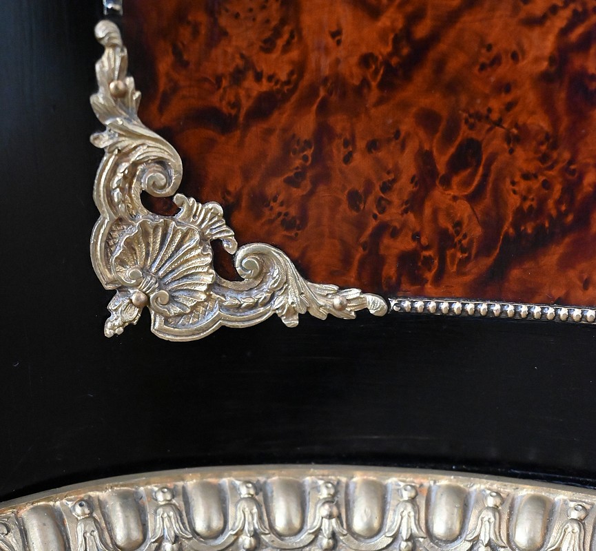 Ce meuble à mouvement sur ses trois faces visibles ouvre par une porte centrale. Son cadre en bois noirci est à coupe d’onglet, et le centre est moucheté en loupe de thuya. Une fine baguette perlée souligne la jonction entre les deux essences, et des écoinçons en coquilles et en bronze agrémentent les angles. Cette porte se ferme à l’aide d’une serrure laiton d’origine, avec clef bronze.