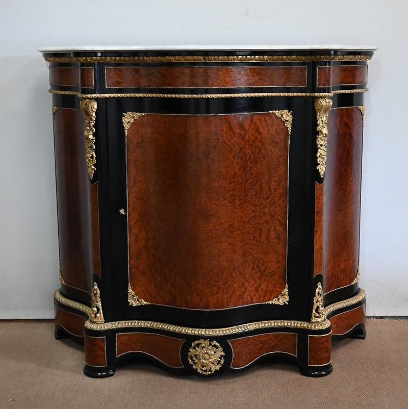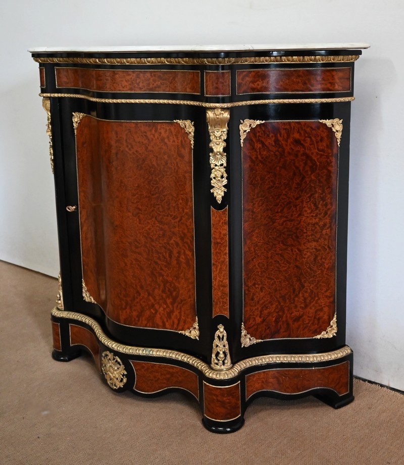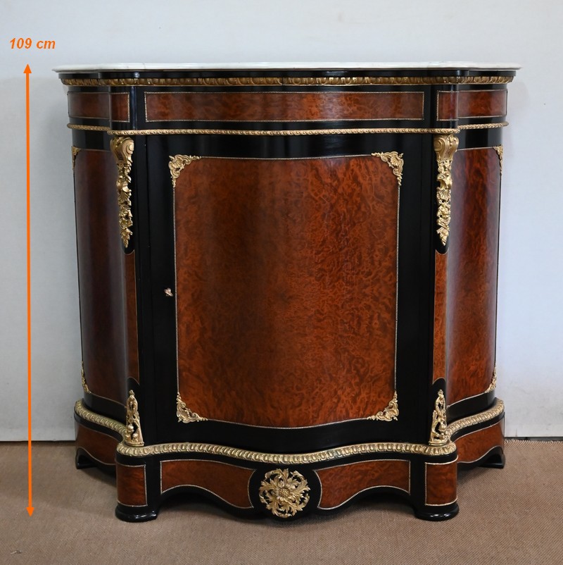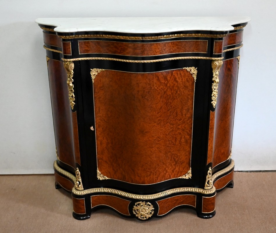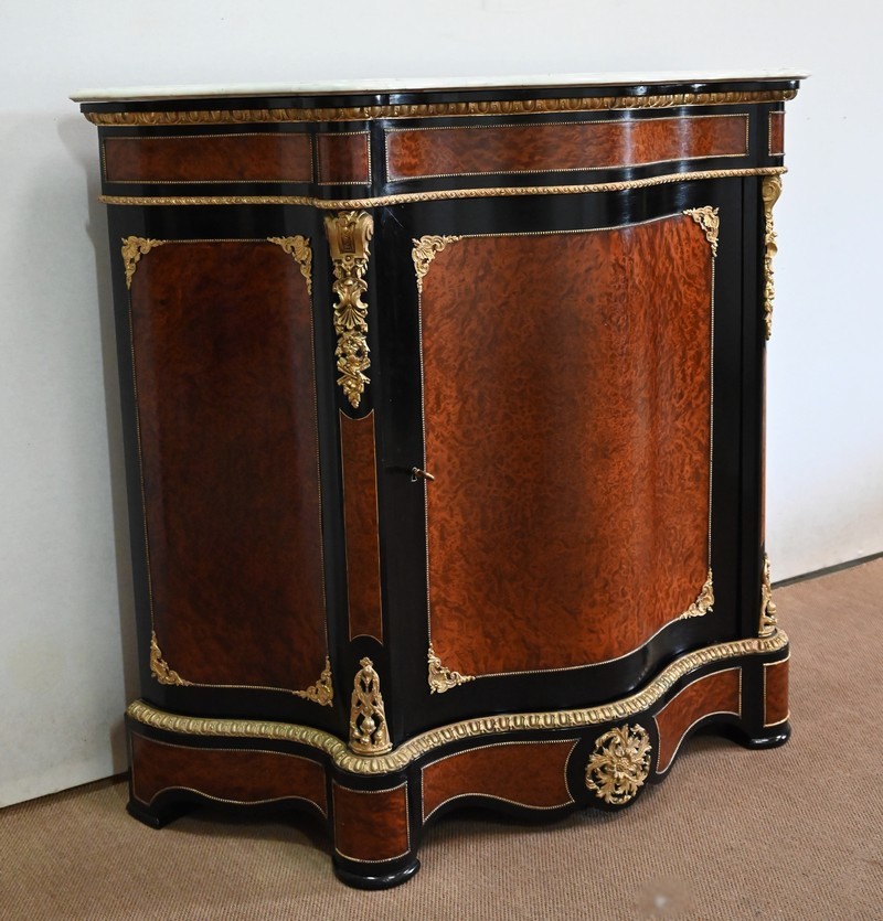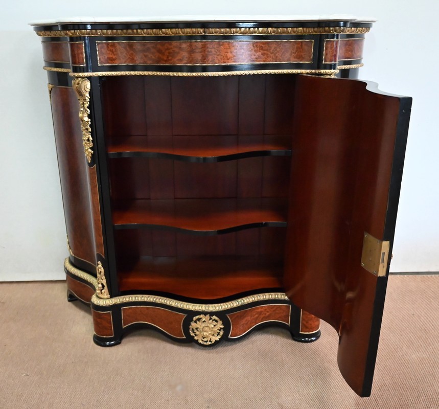 Ce meuble à mouvement sur ses trois faces visibles ouvre par une porte centrale. Son cadre en bois noirci est à coupe d’onglet, et le centre est moucheté en loupe de thuya. Une fine baguette perlée souligne la jonction entre les deux essences, et des écoinçons en coquilles et en bronze agrémentent les angles. Cette porte se ferme à l’aide d’une serrure laiton d’origine, avec clef bronze.