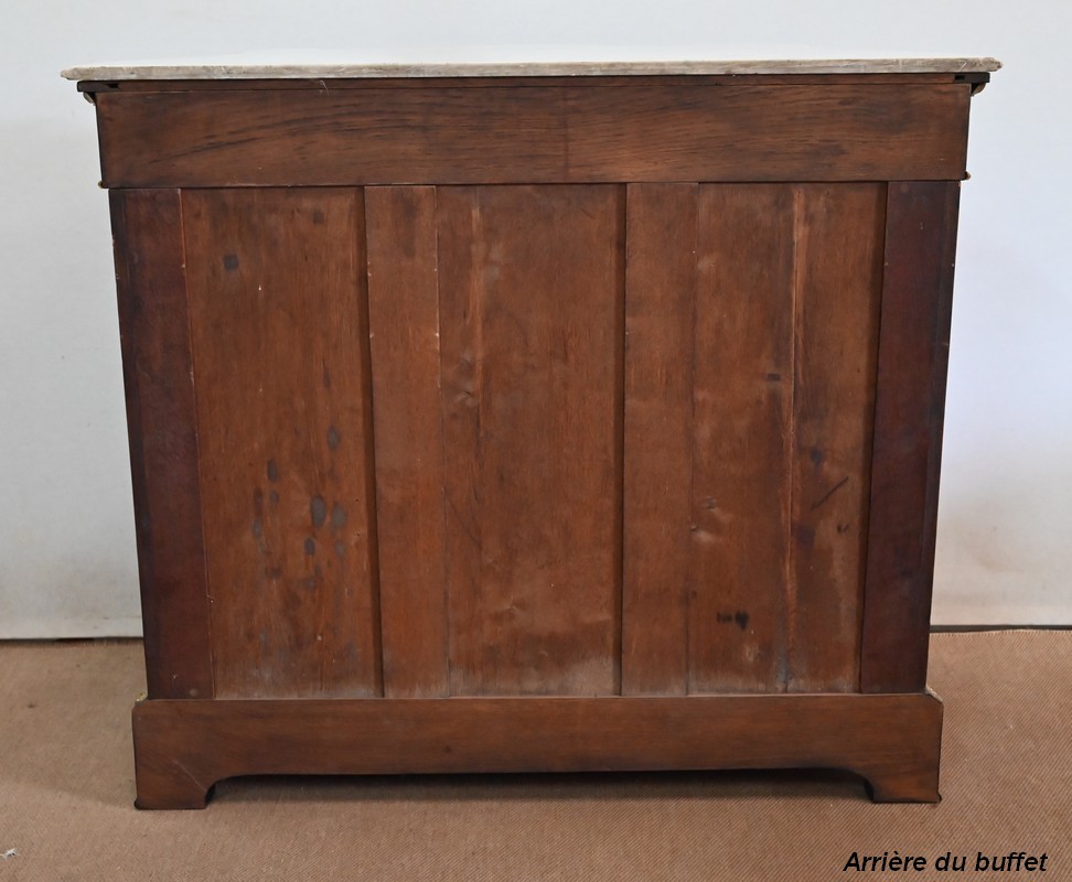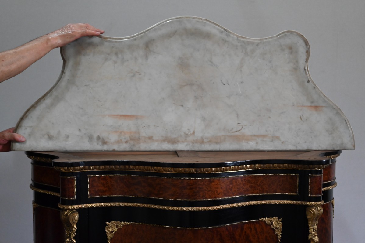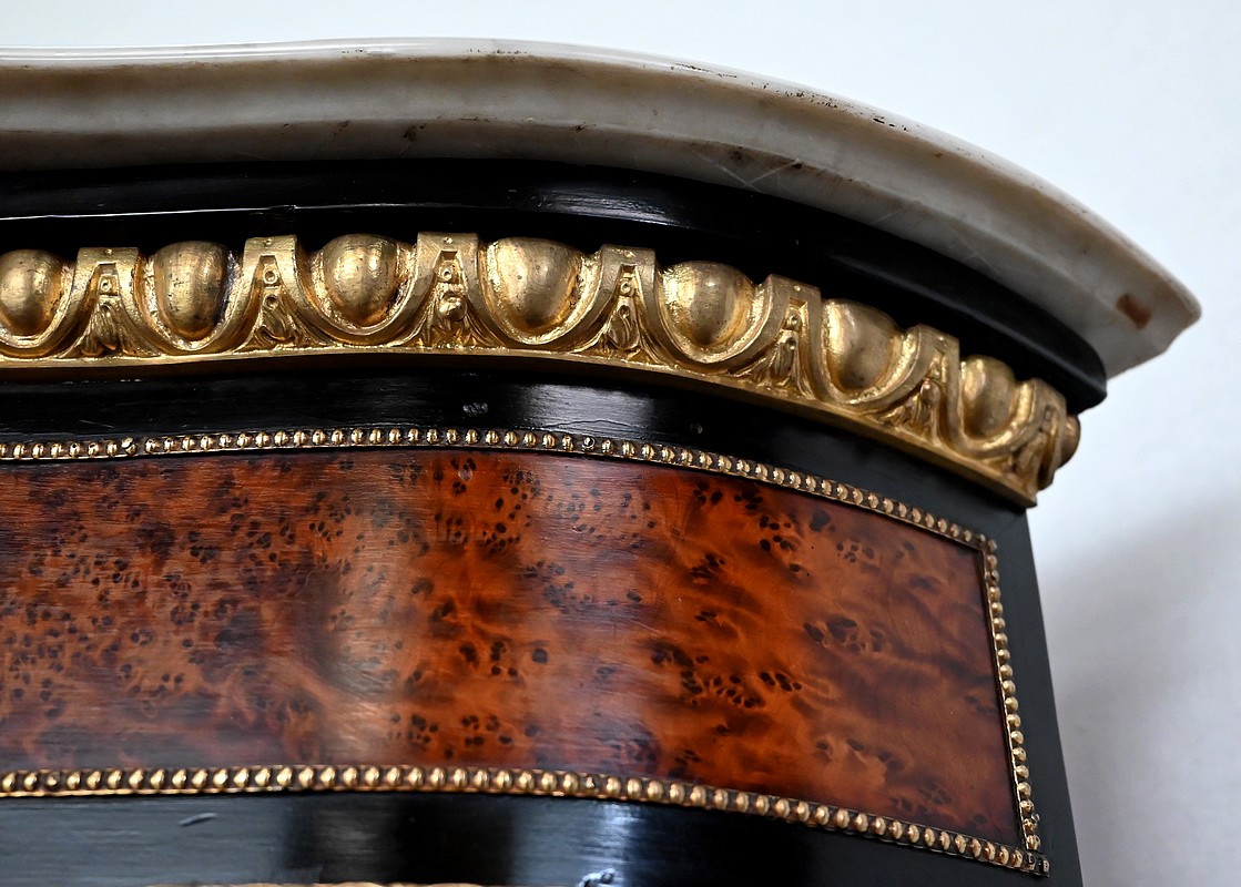 Le dessus en marbre blanc de Carrare épouse la forme du meuble. Le pourtour est mouluré à gorge et en bec de corbin.