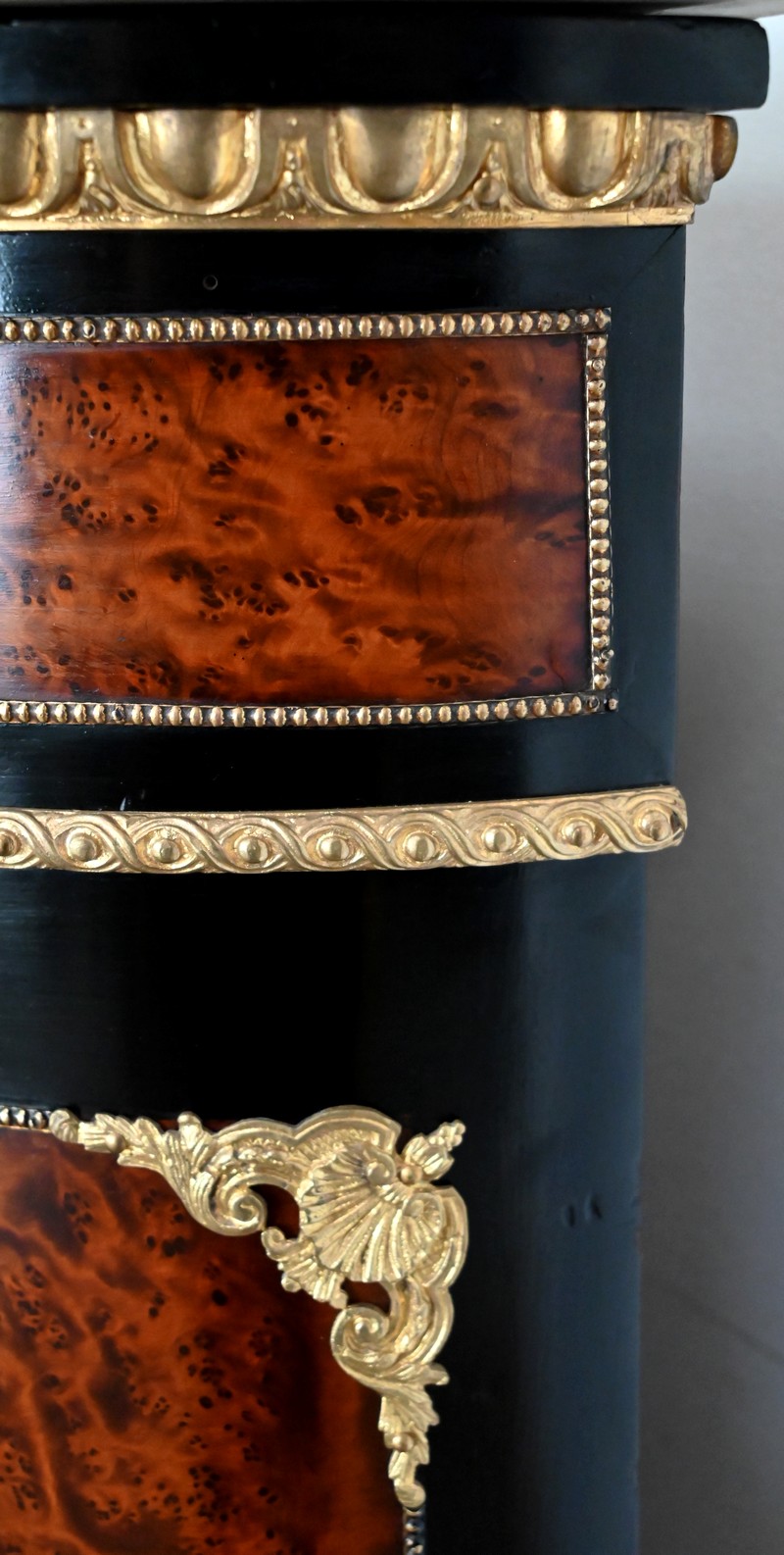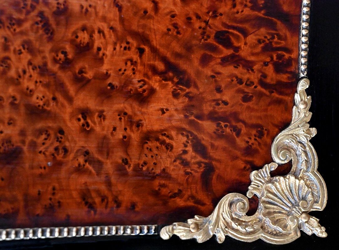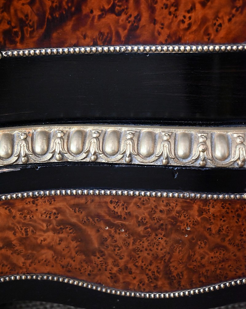 La ceinture est composée d’éléments en loupe de thuya entourés de baguettes perlées en laiton. Elle est surmontée d’une moulure en bronze godronnée suivant les lignes du plateau.