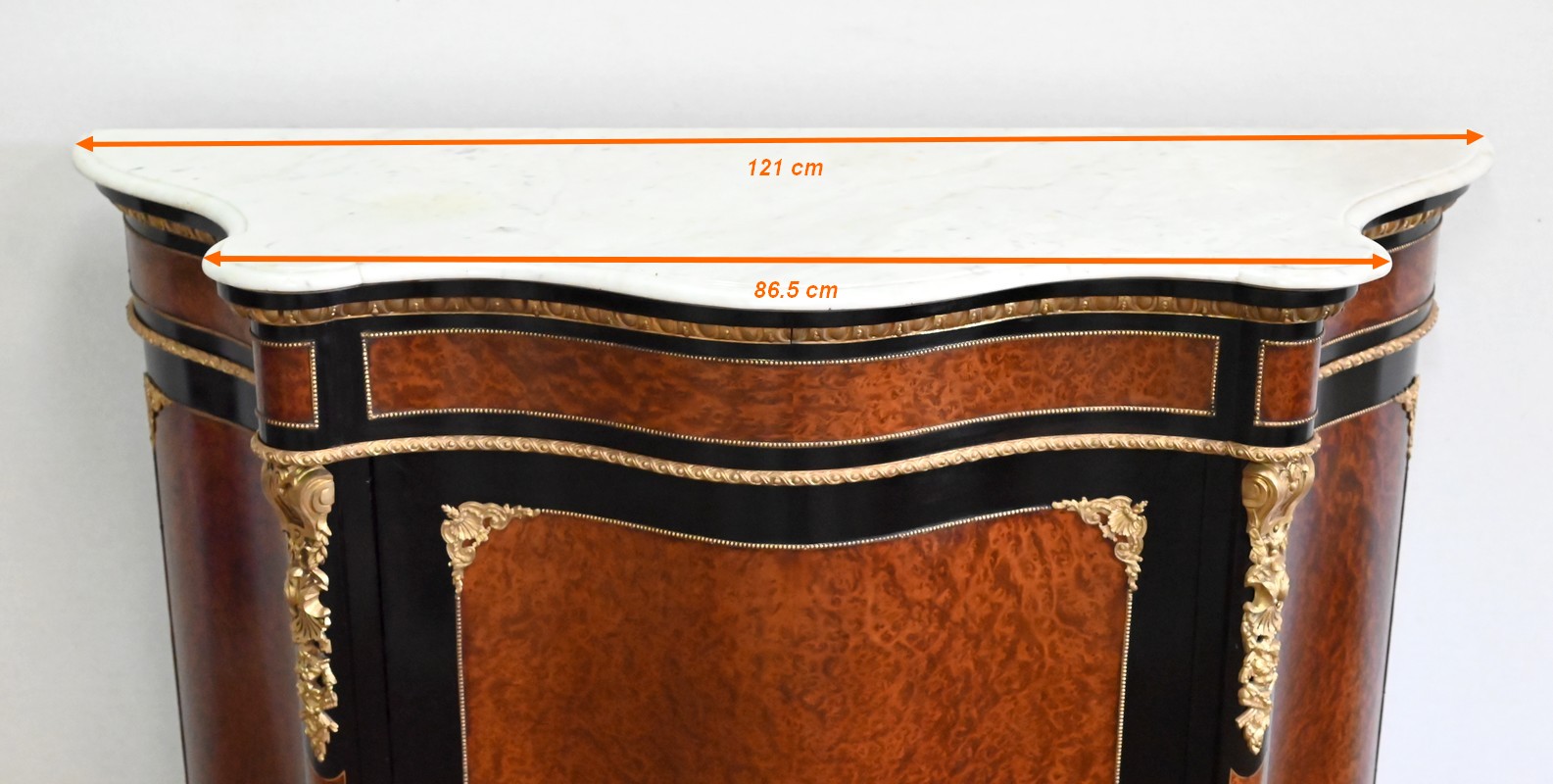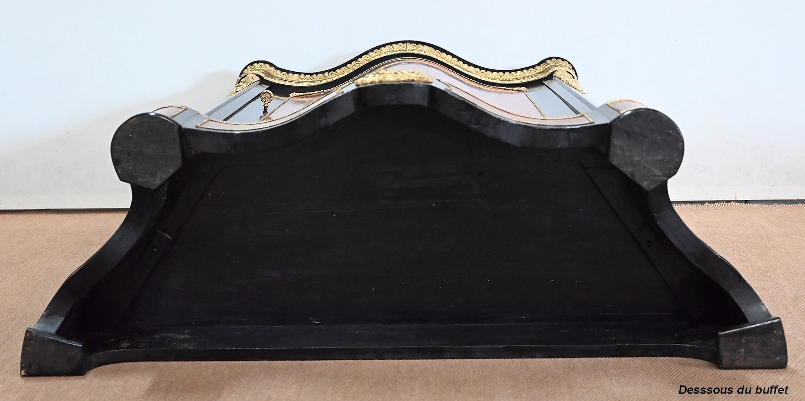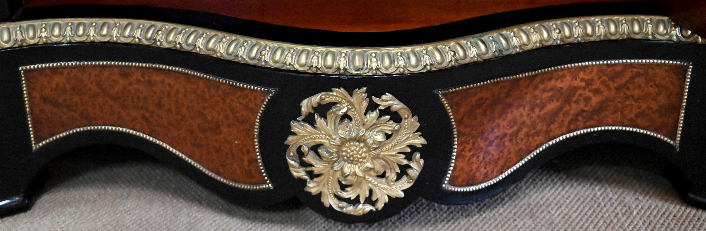 La ceinture est composée d’éléments en loupe de thuya entourés de baguettes perlées en laiton. Elle est surmontée d’une moulure en bronze godronnée suivant les lignes du plateau.