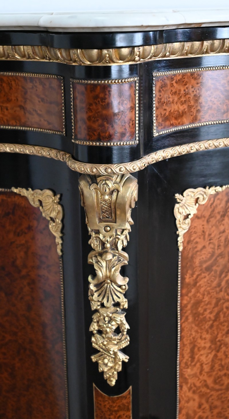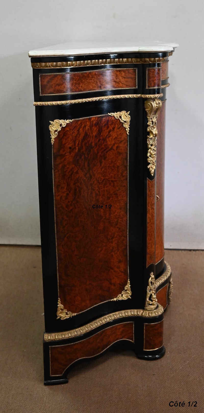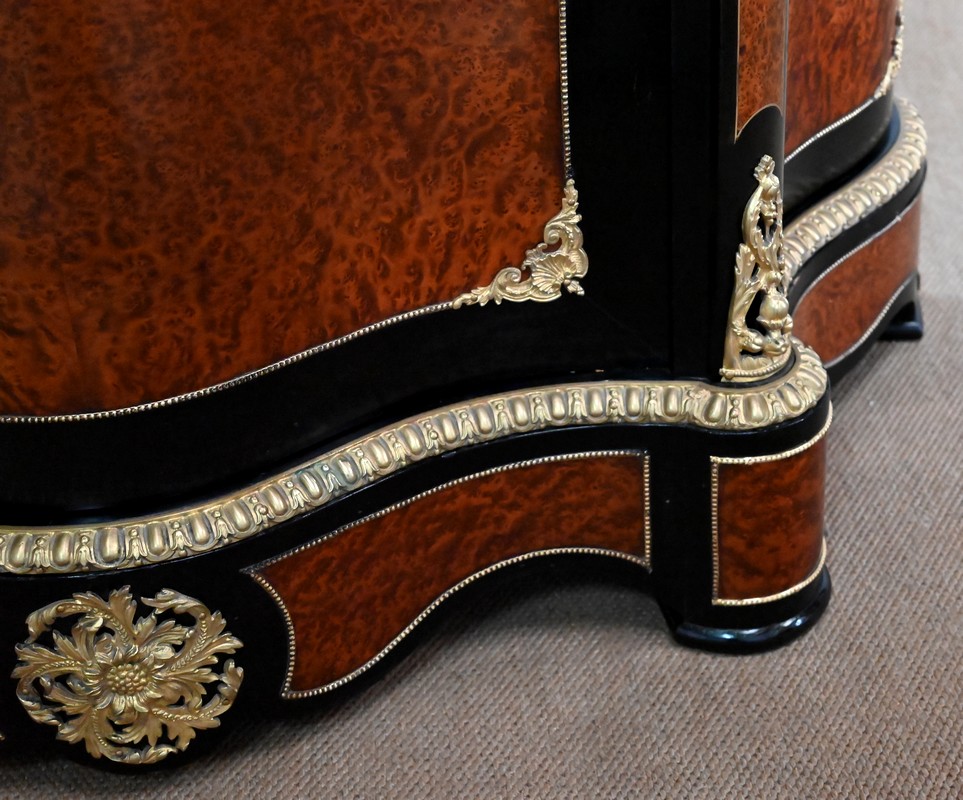 Les montants avant, saillants, sont habillés d’importantes chutes en bronze doré en parties hautes, et de plus modestes en partie basse. On retrouve là aussi de la loupe de thuya, entourée d’un filet en laiton, sur fond noir.