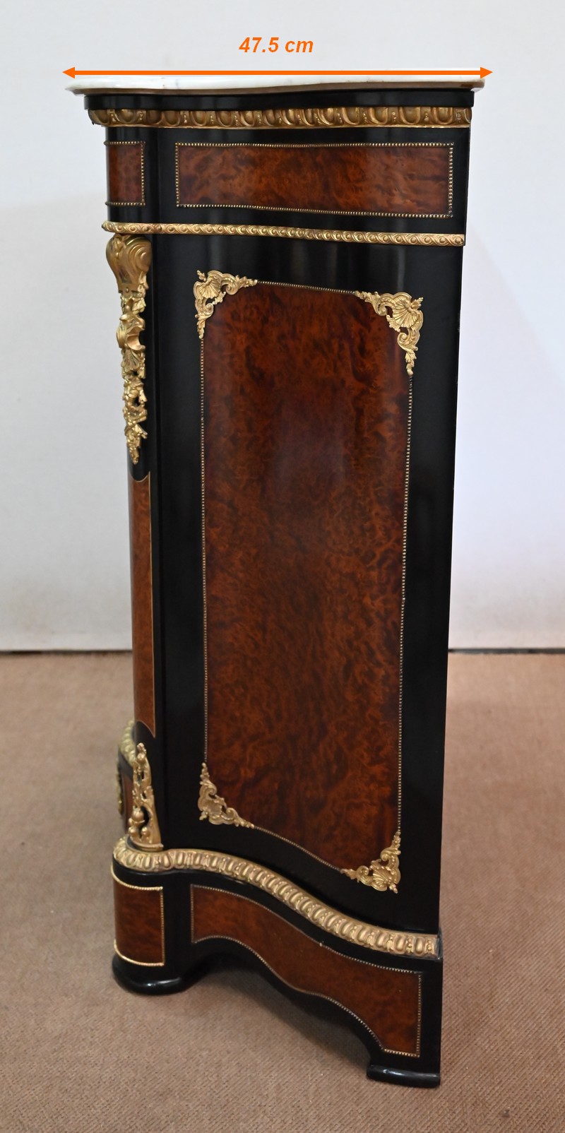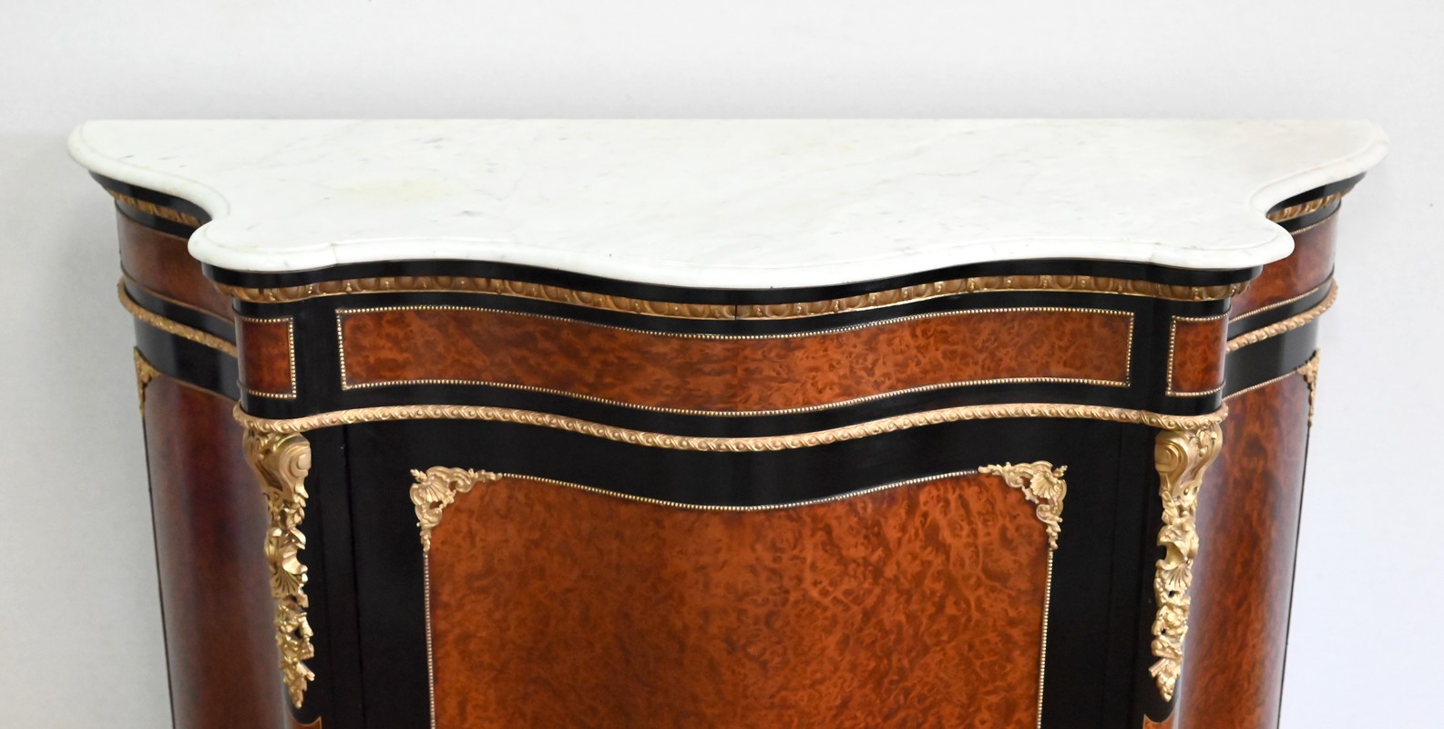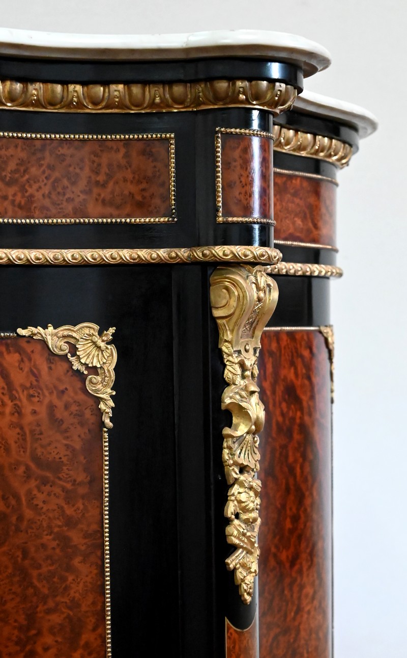 Les montants avant, saillants, sont habillés d’importantes chutes en bronze doré en parties hautes, et de plus modestes en partie basse. On retrouve là aussi de la loupe de thuya, entourée d’un filet en laiton, sur fond noir.