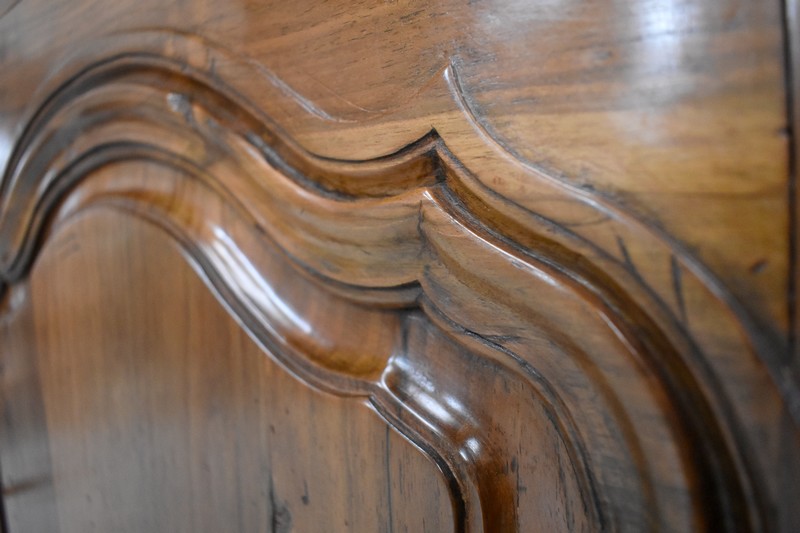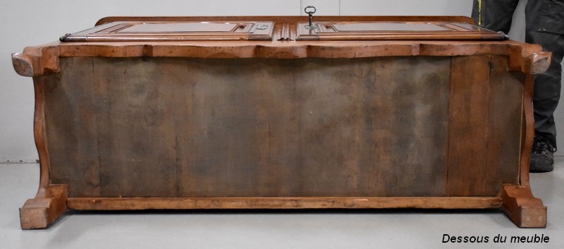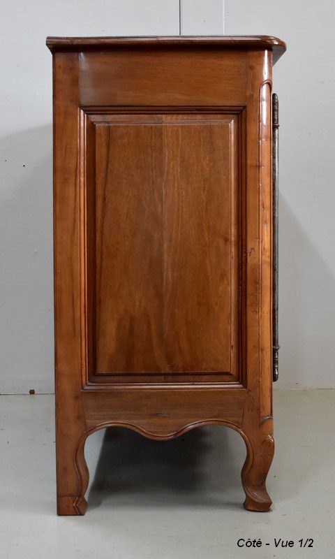 Nous retrouvons sur les Flancs de ce Meuble des Panneaux à plate-bande avec Moulurations, et des Courbes équilibrées en partie basse, qui font écho avec celles en Façade.